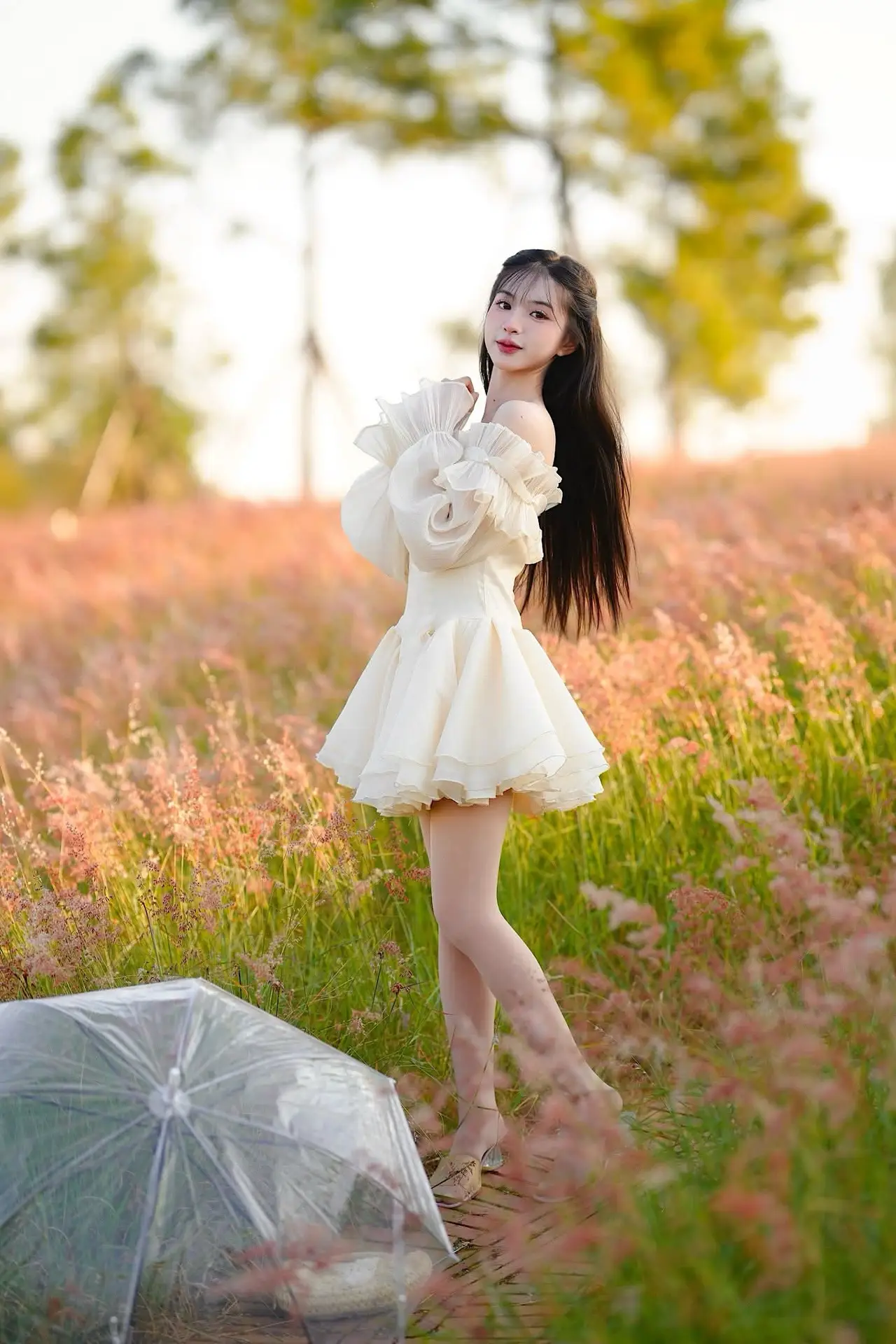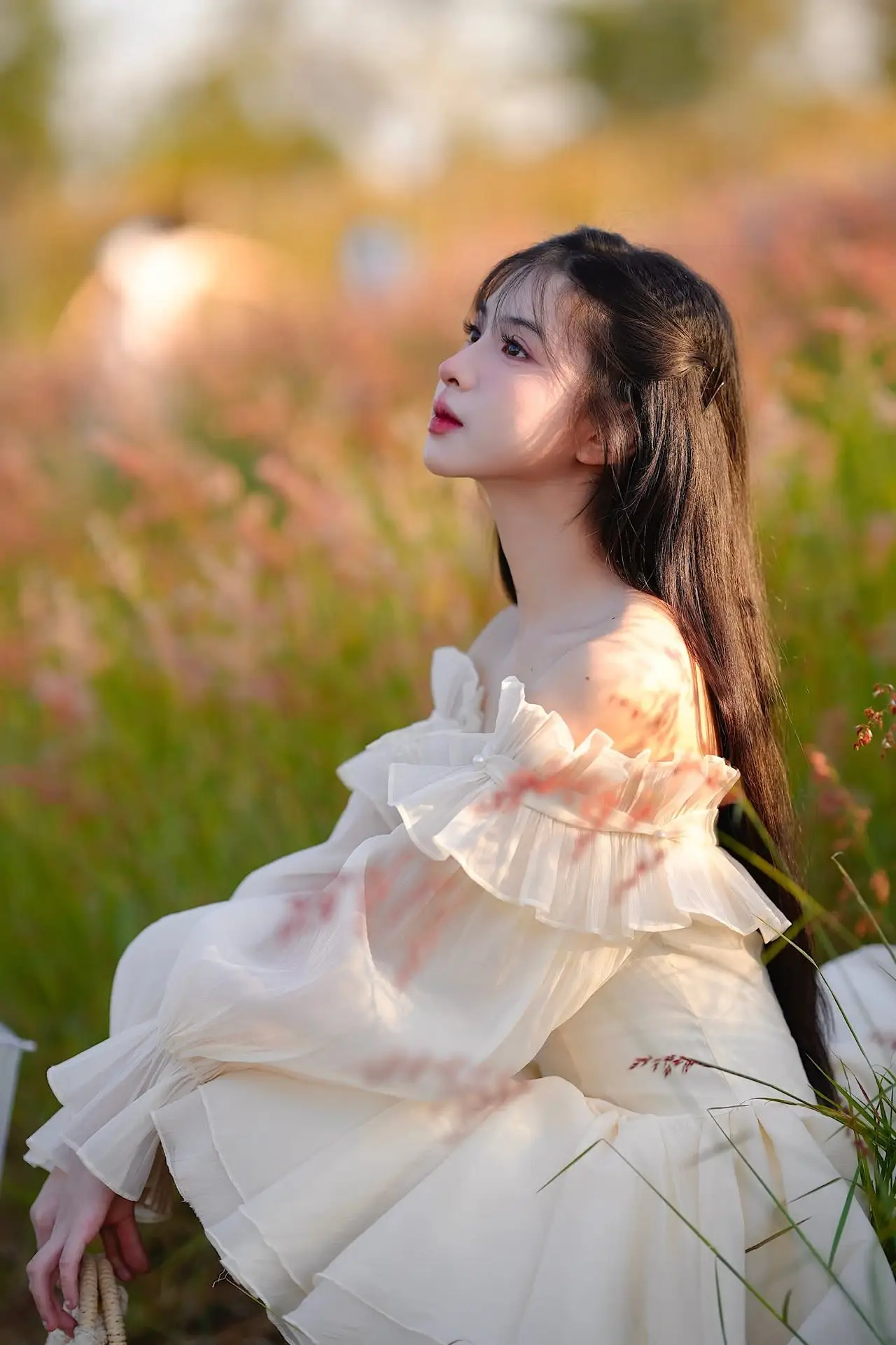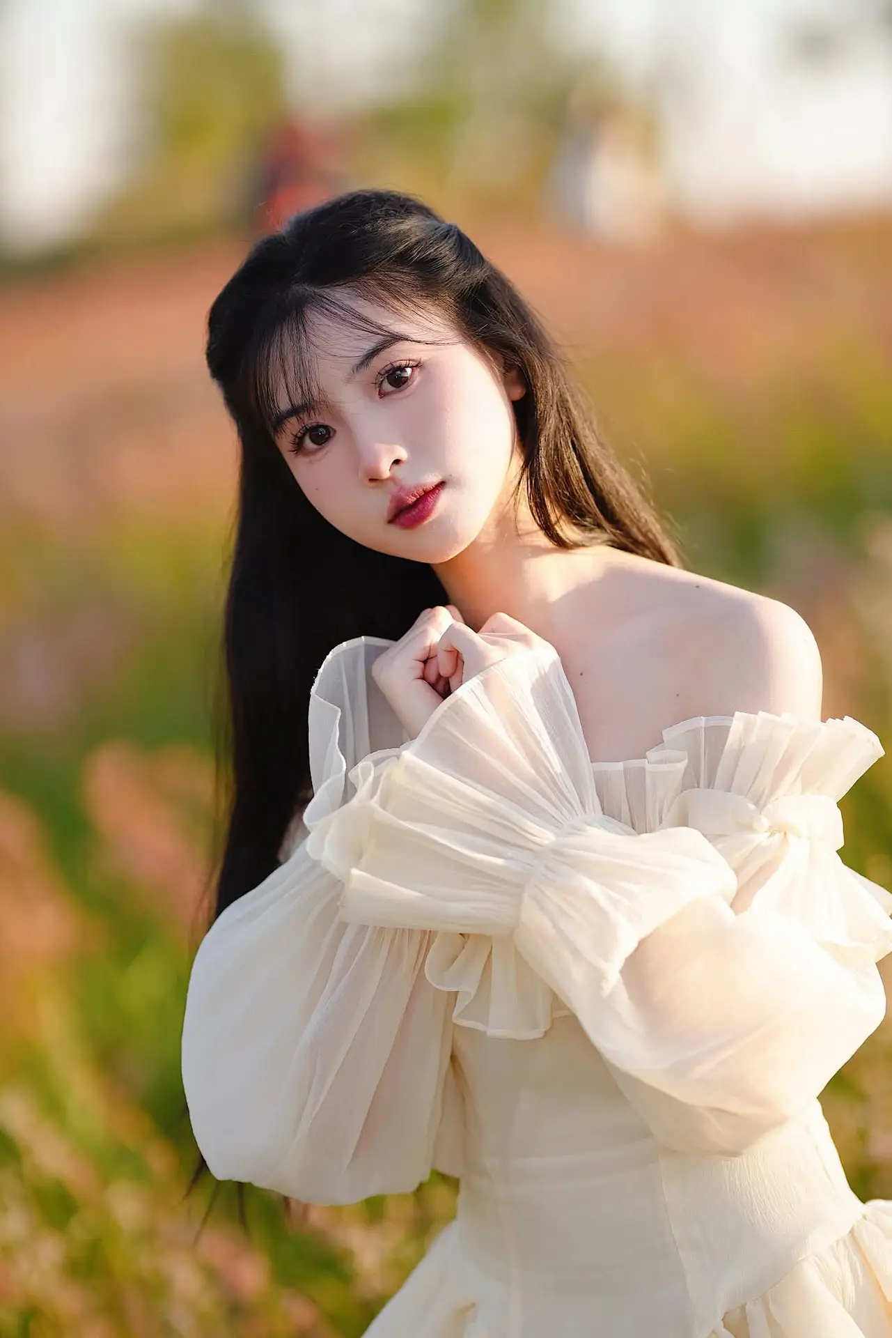 This captivating image features a young woman exuding effortless elegance and grace. She is adorned in a pristine white off-the-shoulder dress its delicate design beautifully highlighting her soft shoulders. The flowing long dress paired with a charming small light pink handbag creates a harmonious and feminine ensemble. With her long dark hair and gentle gaze she presents a look that is both modern and classic. This minimalist yet sophisticated fashion style not only accentuates her natural beauty but also showcases her refined taste. The photograph perfectly blends human charm with sartorial refinement capturing a truly memorable moment that speaks volumes about understated style.#WhiteDressFashion #ElegantStyle #AsianBeauty #OffShoulderDress #MinimalistFashion