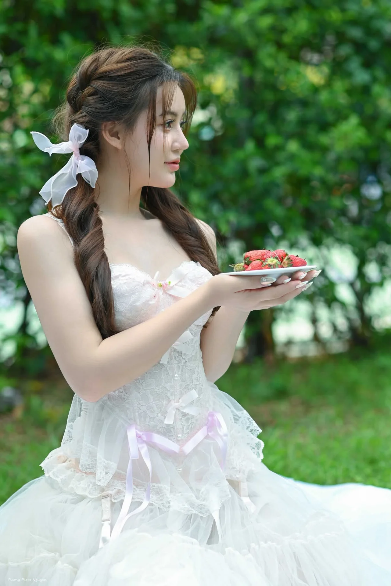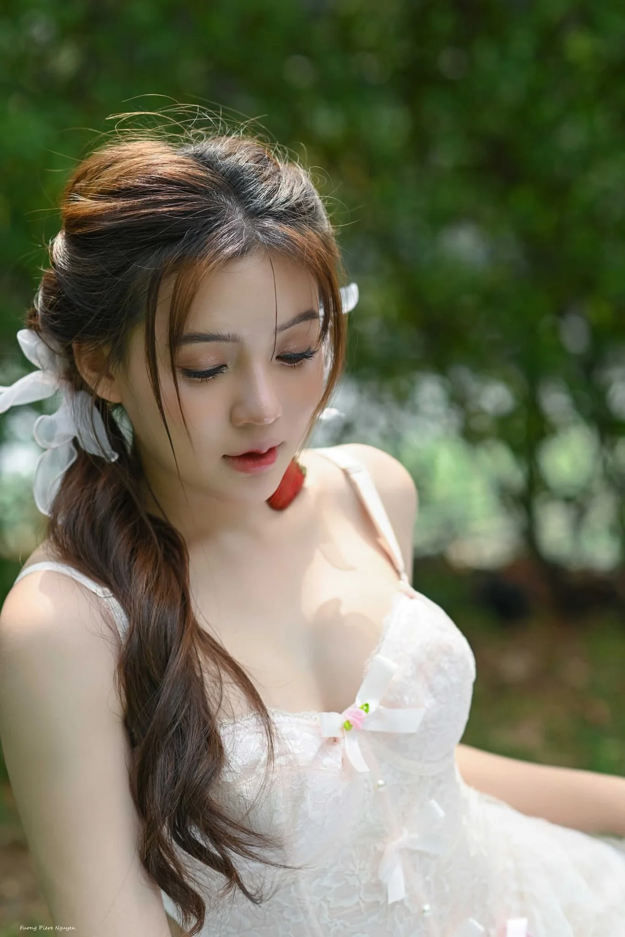 This stunning photograph captures a serene moment of a young woman embodying pure beauty amidst a refreshing natural setting With gentle braided hair adorned with white ribbons she sits relaxed on the vibrant green grass Her pristine white outfit accentuates her innocent and pure charm blending seamlessly with the lush surroundings Her dreamy posture and distant gaze create an emotionally rich tableau evoking a sense of peace and untainted natural beauty This image beautifully represents grace gentleness and the vibrant spirit of youth embraced by nature#PureBeauty #NaturePortrait #WhiteDressGirl #SereneMoment #NaturalElegance