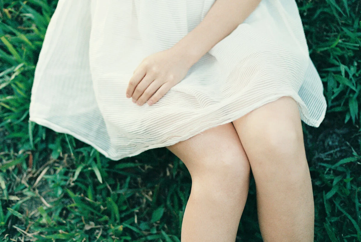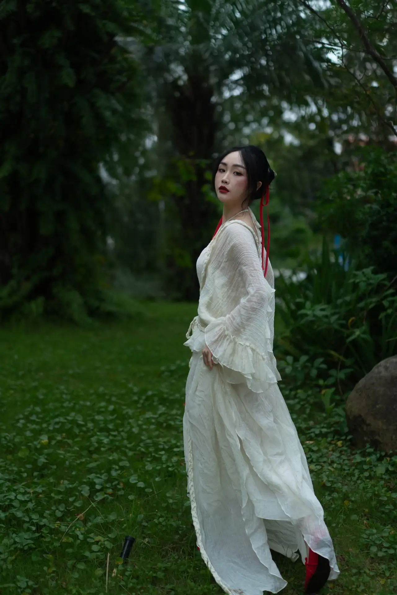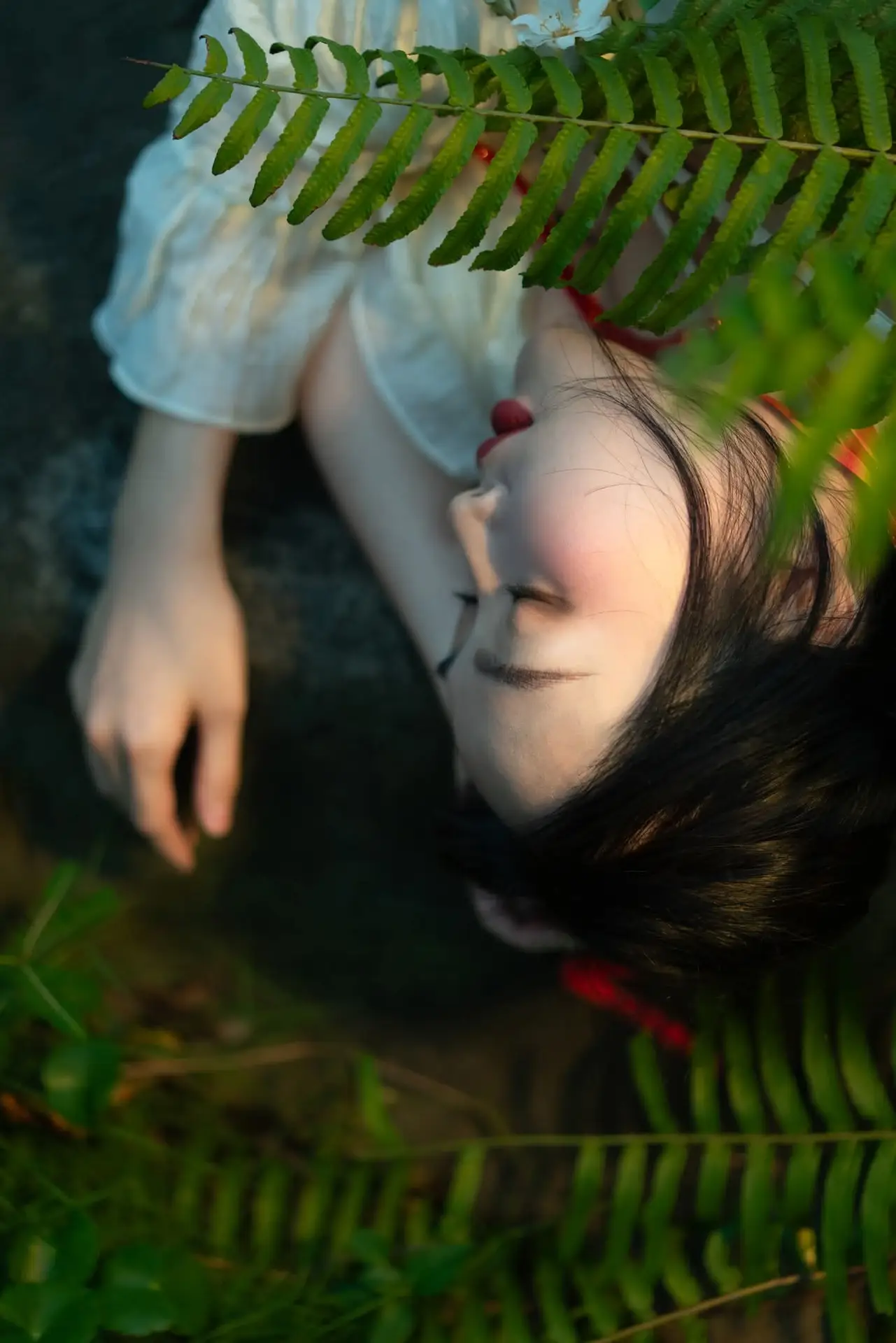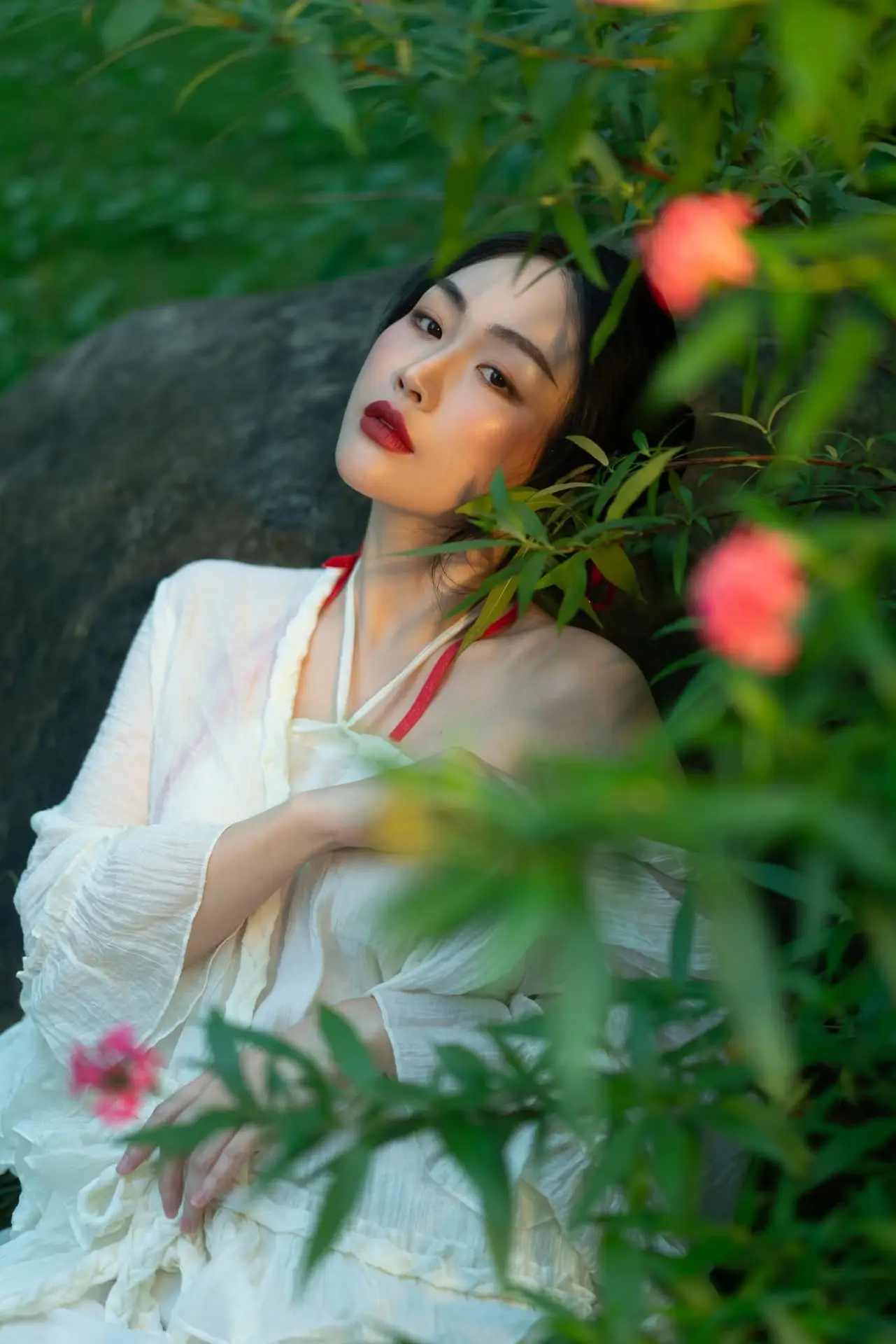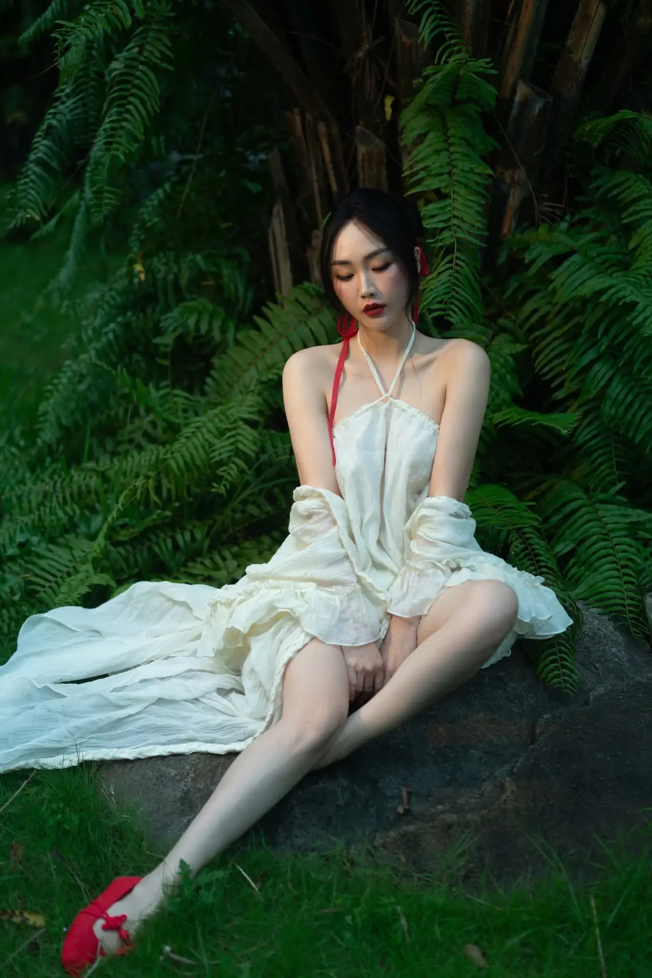 This stunning photograph captures a graceful young woman seated amidst the lush greenery of nature She wears an pristine white halter-neck dress its soft fabric flowing gently creating an ethereal and romantic aesthetic The striking red shoes along with subtle red accents on her attire enhance the overall allure and charm With a softly contemplative gaze the woman appears to merge with the peaceful surroundings of abundant ferns and foliage behind her crafting a harmonious tableau of human beauty and natural grandeur This image is perfect for those who appreciate delicate fashion and the serene beauty found in nature#NatureFashion #WhiteDress #NaturalBeauty #OutdoorPhotography #ElegantStyle