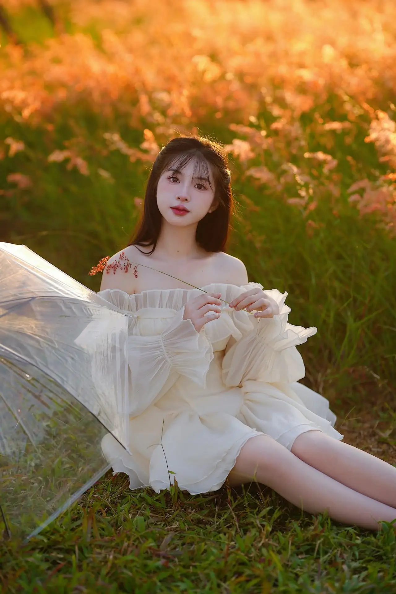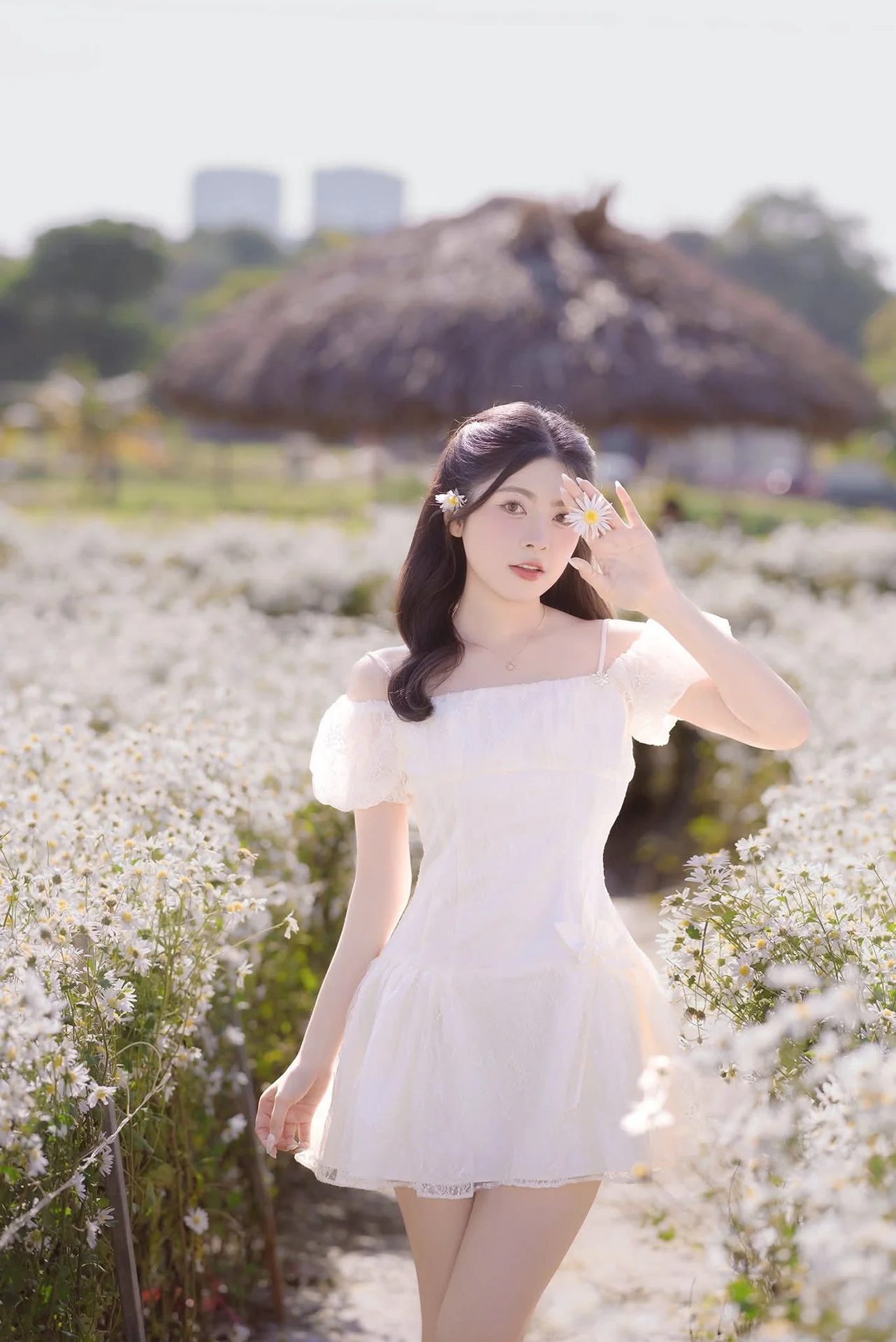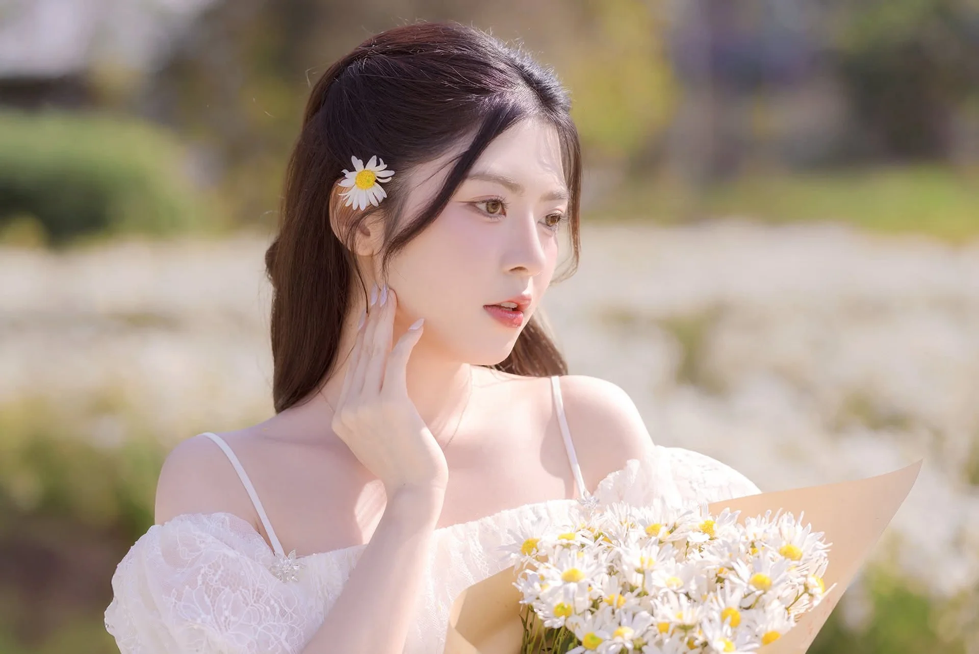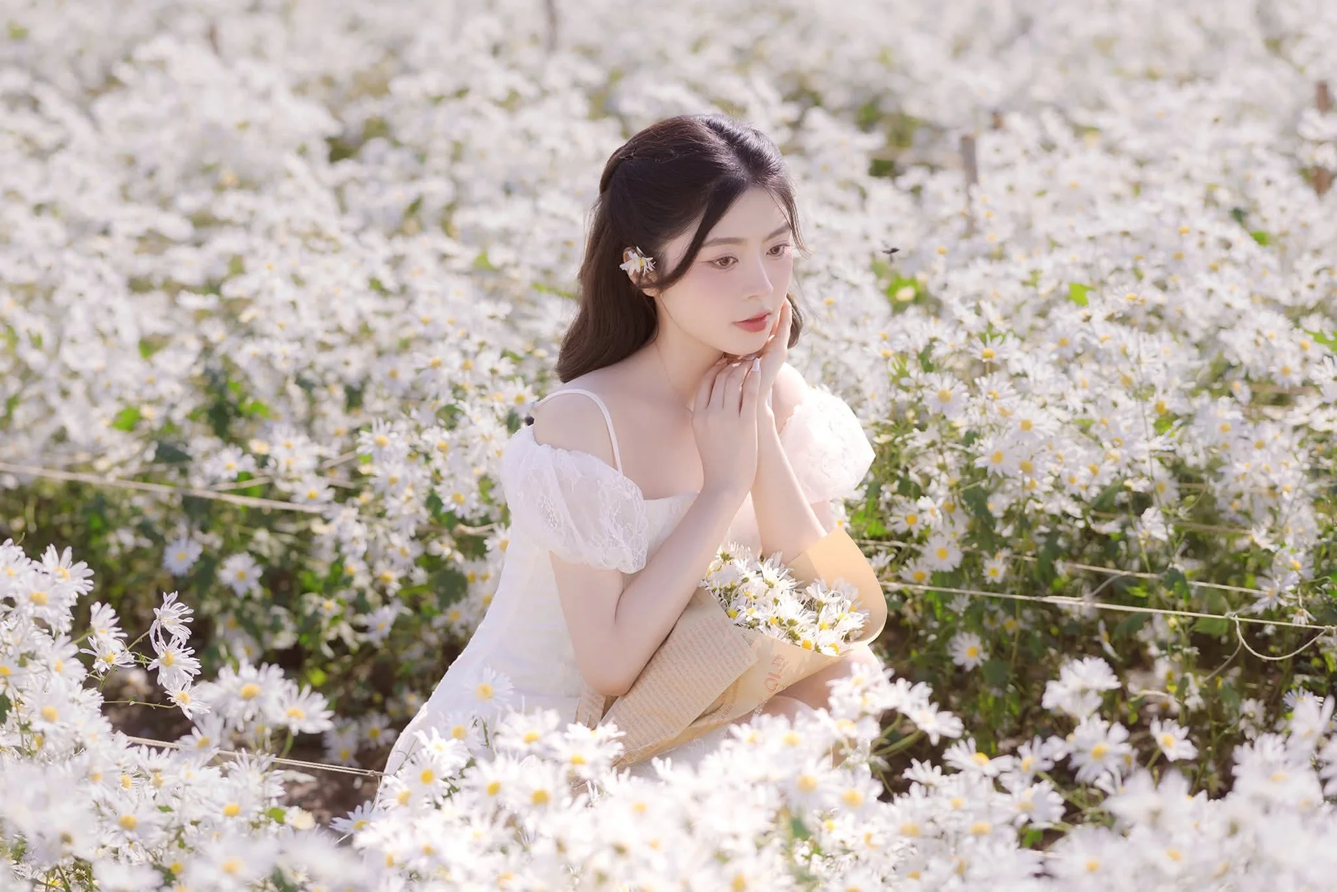 This stunning photograph captures a young woman in a pristine white dress, standing gracefully in a flower field bathed in the soft golden light of dusk. Her pure beauty harmonizes perfectly with the poetic natural scenery, creating a romantic and deeply emotional tableau. The off-shoulder dress with delicate ruffles enhances her charming and demure appearance. The golden hour sunlight bathes the entire scene, highlighting every blade of grass and fragile petal, making the overall image feel warm and dreamy. She looks directly at the camera with a gentle gaze, conveying a sense of peace and allure. This is more than just a portrait; it is a wonderful interplay between human and nature, evoking the timeless beauty of youth and purity.#GirlInWhiteDress #FlowerField #GoldenHour #EtherealBeauty #NaturePortrait