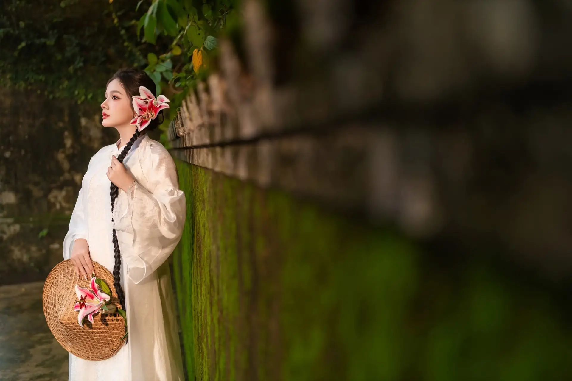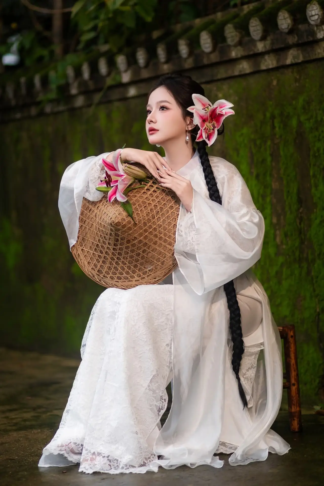 This stunning portrait captures a young woman radiating an ethereal and pure beauty. She is gracefully adorned in a pristine white gown, subtly hinting at traditional elegance with its delicate embroidered patterns. Her dark hair, meticulously braided, is beautifully accented by a vibrant pink and white blossom, creating a charming focal point. Her gentle expression and deep, captivating eyes convey a mysterious allure. The backdrop of an ancient stone wall and lush green foliage further enhances her timeless appeal. This image beautifully embodies the serene grace and sophisticated charm of Asian beauty, a harmonious blend of heritage and captivating freshness.#WhiteDressMaiden #AsianBeauty #FlowerInHair #EtherealBeauty #AsianStyle