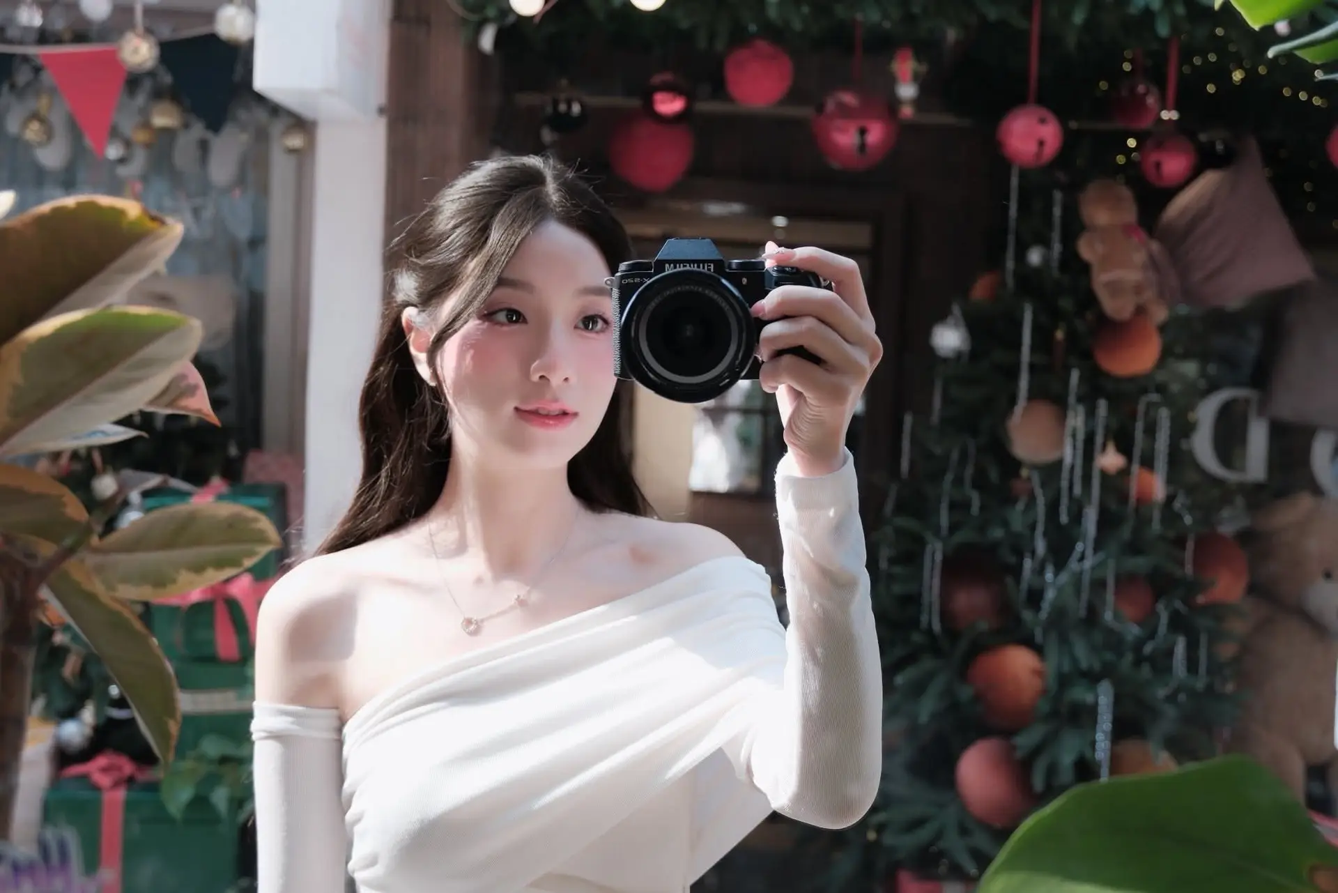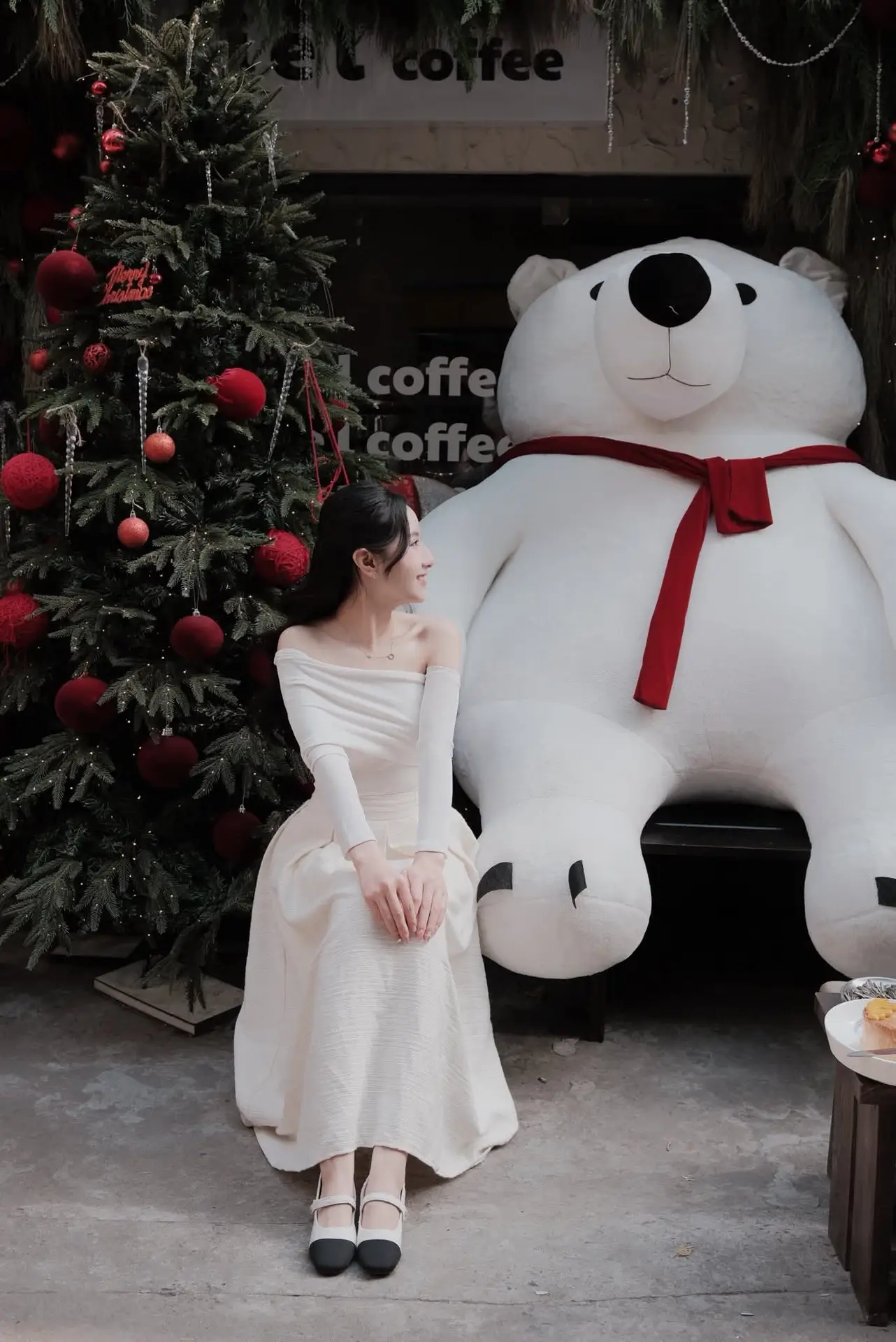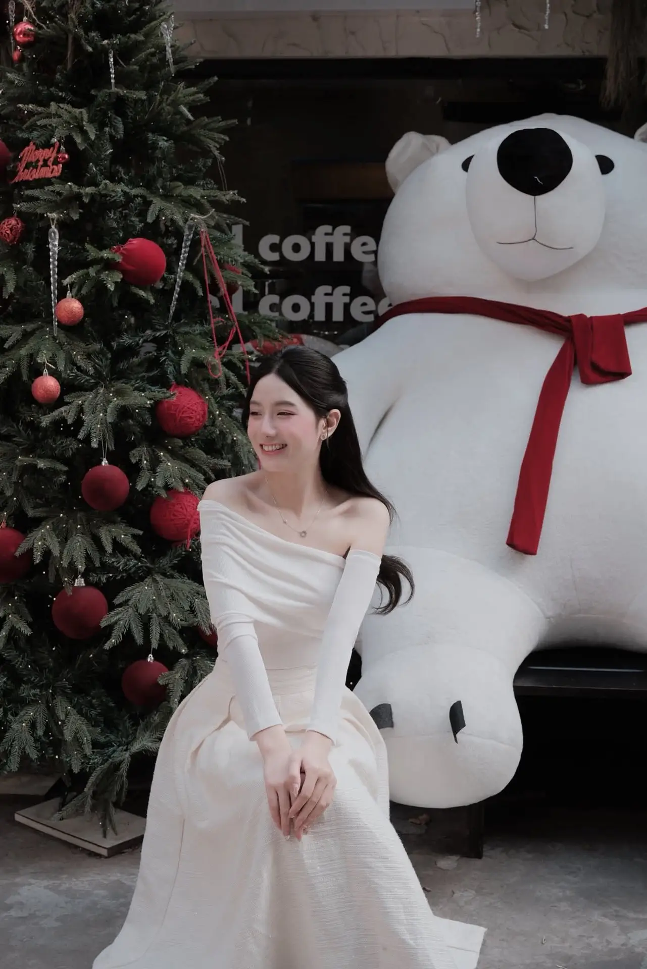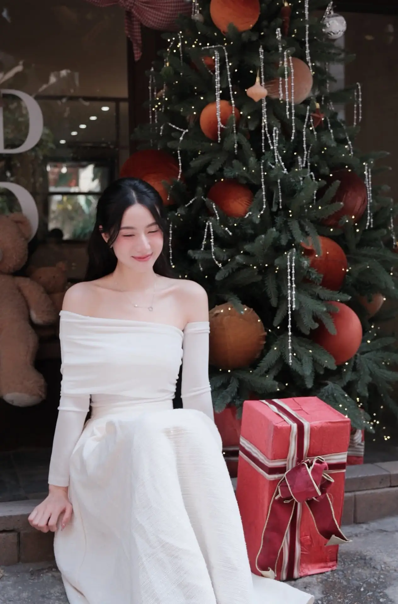 This enchanting photograph captures a beautiful young woman immersed in the warm glow of the Christmas season. Adorned in an elegant off-the-shoulder white dress, she sits gracefully beside a dazzling Christmas tree, adorned with shimmering lights and vibrant red ornaments. Her gentle smile and sparkling eyes radiate a sweet charm and the serene happiness of the holiday festivities. Next to her, a prominent red Christmas gift box symbolizes the unexpected joy and shared love of the season. This image beautifully conveys the peaceful spirit of Christmas while highlighting the graceful and ethereal beauty of the woman. It evokes a sense of warmth and hopeful anticipation for a magical holiday, making it a captivating and emotionally rich moment.#ChristmasGirl #WhiteDress #HolidaySeason #ChristmasTree #FestiveVibes