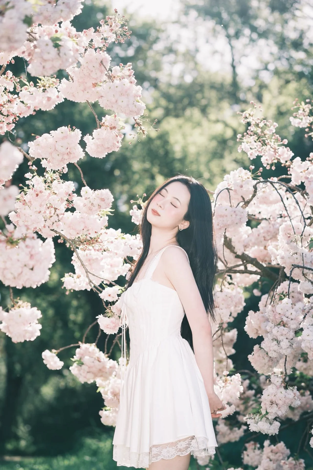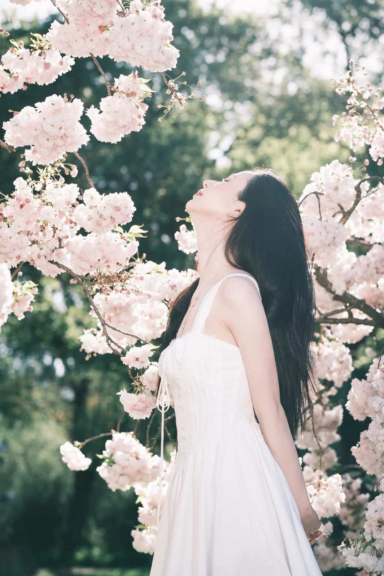 This enchanting photograph captures a graceful young woman in a pristine white dress amidst a cascade of blooming cherry blossoms. Her long dark hair beautifully contrasts with the soft pink hues of the delicate petals creating a truly romantic and poetic scene. Warm spring sunlight gently illuminates her serene face highlighting her gentle and ethereal beauty. The woman gazes upwards at the flower clusters as if fully embracing the peaceful and pure essence of nature. This image beautifully embodies the spirit of spring new beginnings and exquisite purity.#CherryBlossomGirl #WhiteDress #SpringVibes #EtherealBeauty #SakuraSeason