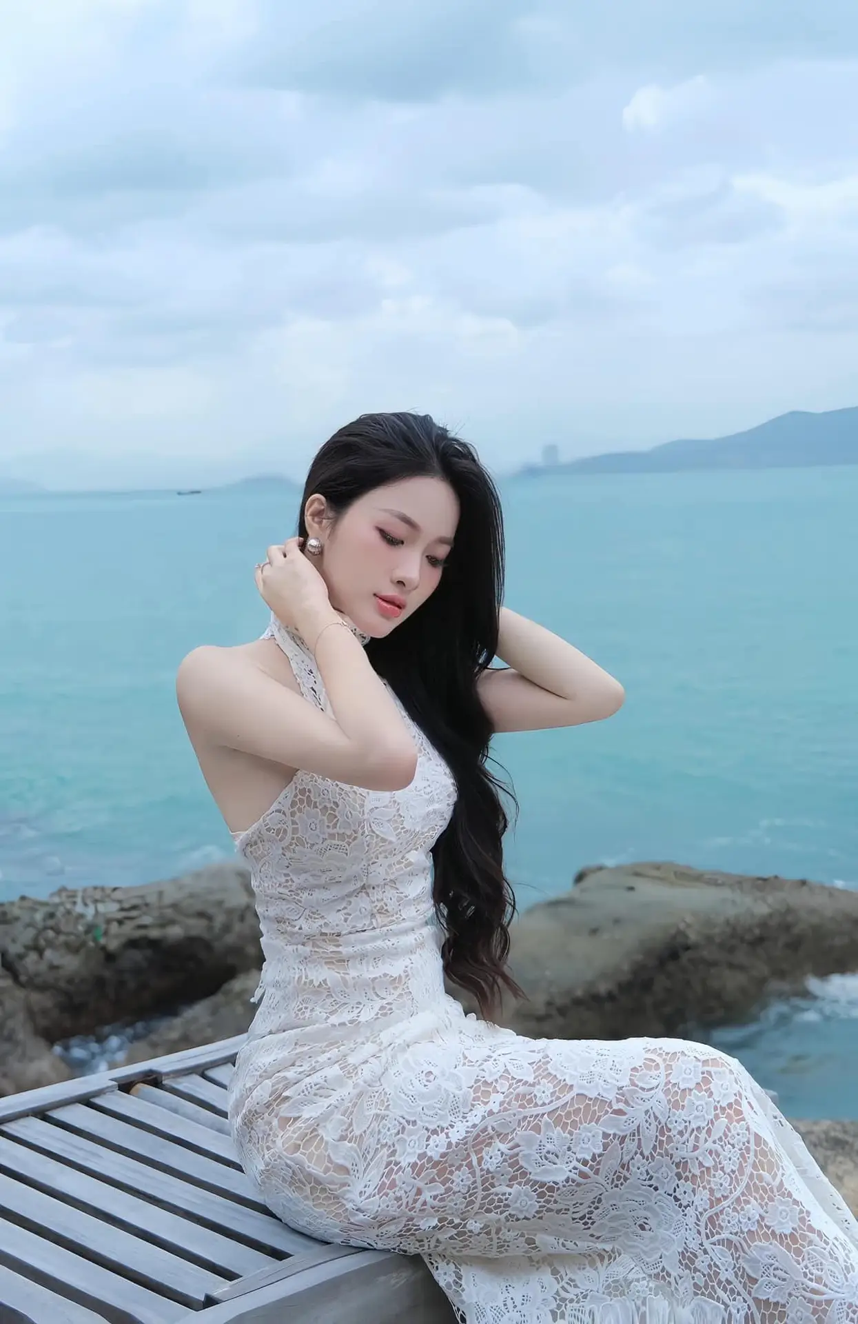 This captivating image features a young, beautiful woman. She is adorned in a pristine white dress, elegantly designed with alluring off-shoulder details and a gently flowing skirt that accentuates her slender, graceful figure. Posing on the deck of a luxurious yacht, her long, soft dark hair gently sways in the sea breeze, creating a romantic and poetic scene. Behind her, the vast azure sea merges seamlessly with a clear sky, evoking a sense of ultimate relaxation and tranquility. Her beauty perfectly harmonizes with the expansive ocean backdrop, embodying sophistication, freedom, and captivating charm. This is more than just a fashion moment; it is a symbol of elegance and life's refined pleasures.#ElegantBeauty #WhiteDress #YachtLife #SeaFashion #OceanMuse