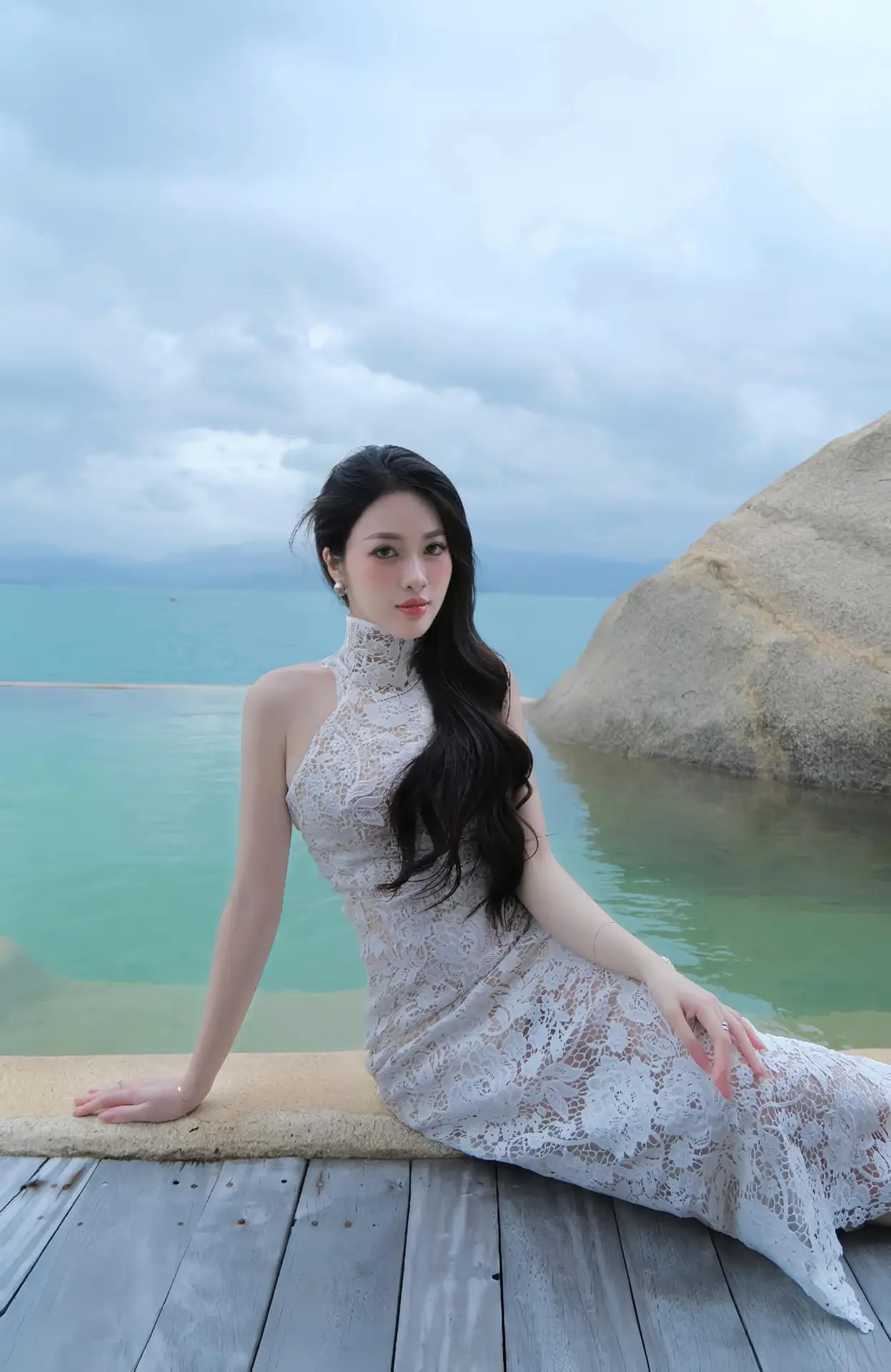 Elegant Beauty on the Waves: White Dress Muse Cruises the Azure Sea