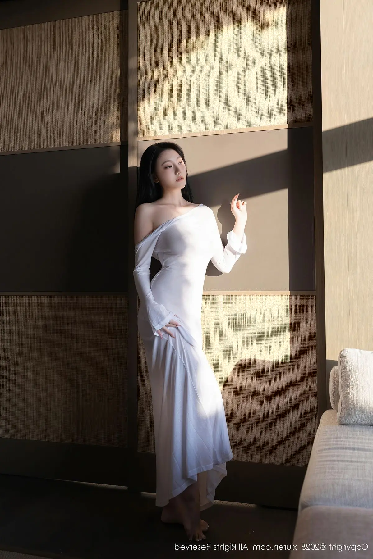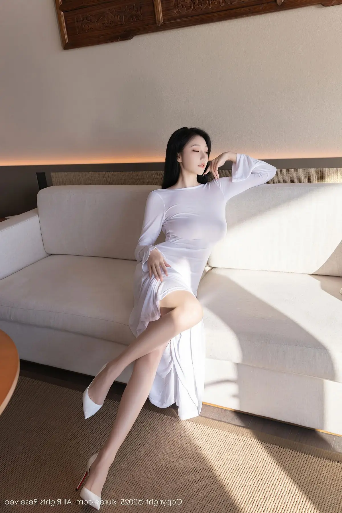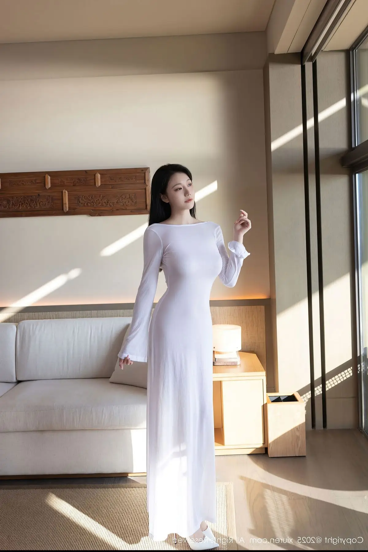An Ran shines brightly in the XiuRen No10747 photoshoot showcasing her elegant and alluring beauty She wears a long formfitting white dress highlighting her slender figure and soft contours Bathed in gentle natural light from the window An Ran poses gracefully by the sofa exuding charm and sophistication Every gesture and gaze reflects professionalism and captivating charisma This photoshoot is a perfect blend of refined fashion and a modern setting creating artistic and emotional moments An Ran in her pristine white attire presents a pure yet undeniably sensual image#AnRan #XiuRen #WhiteDress #Elegance #NaturalLight