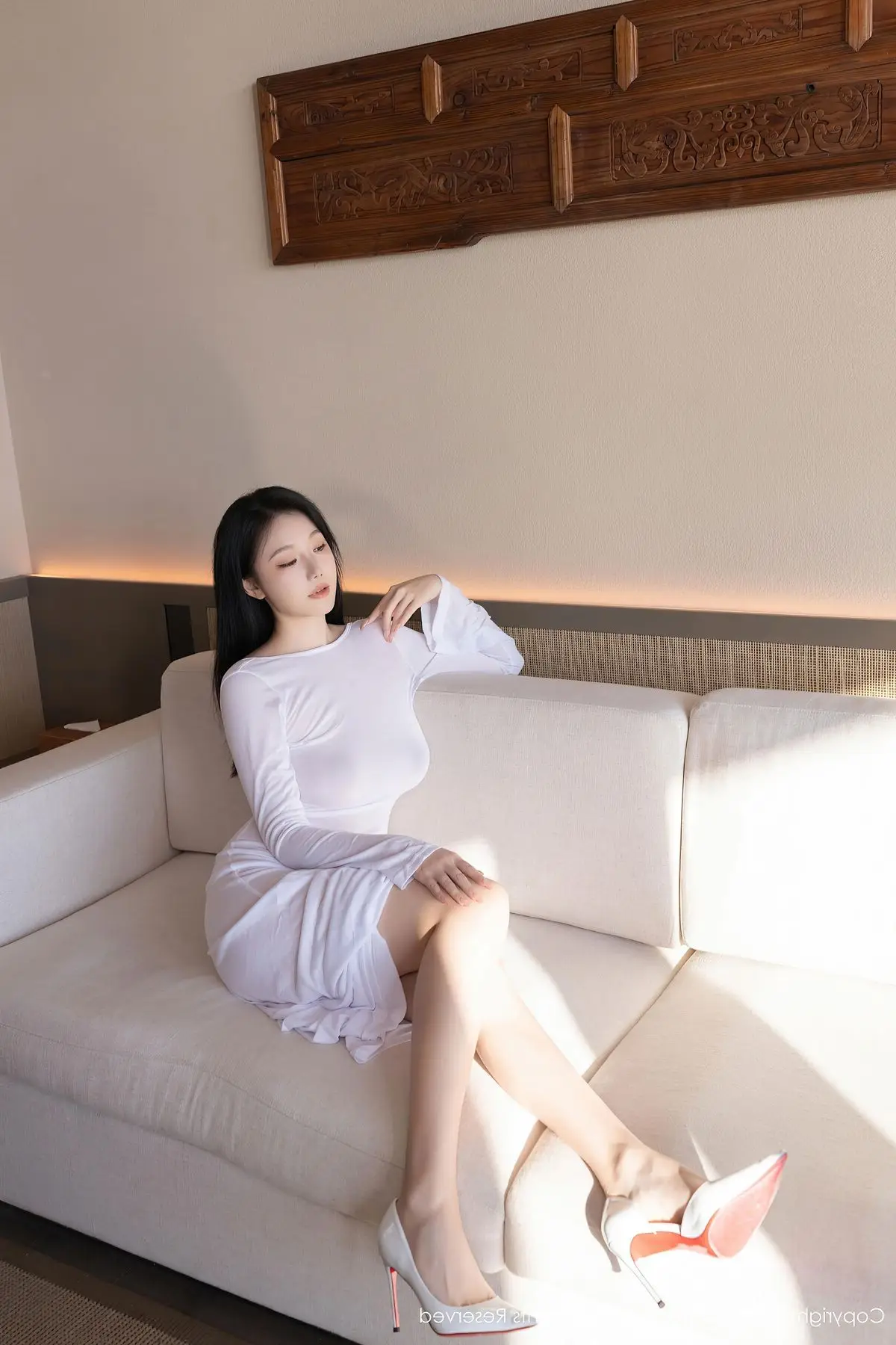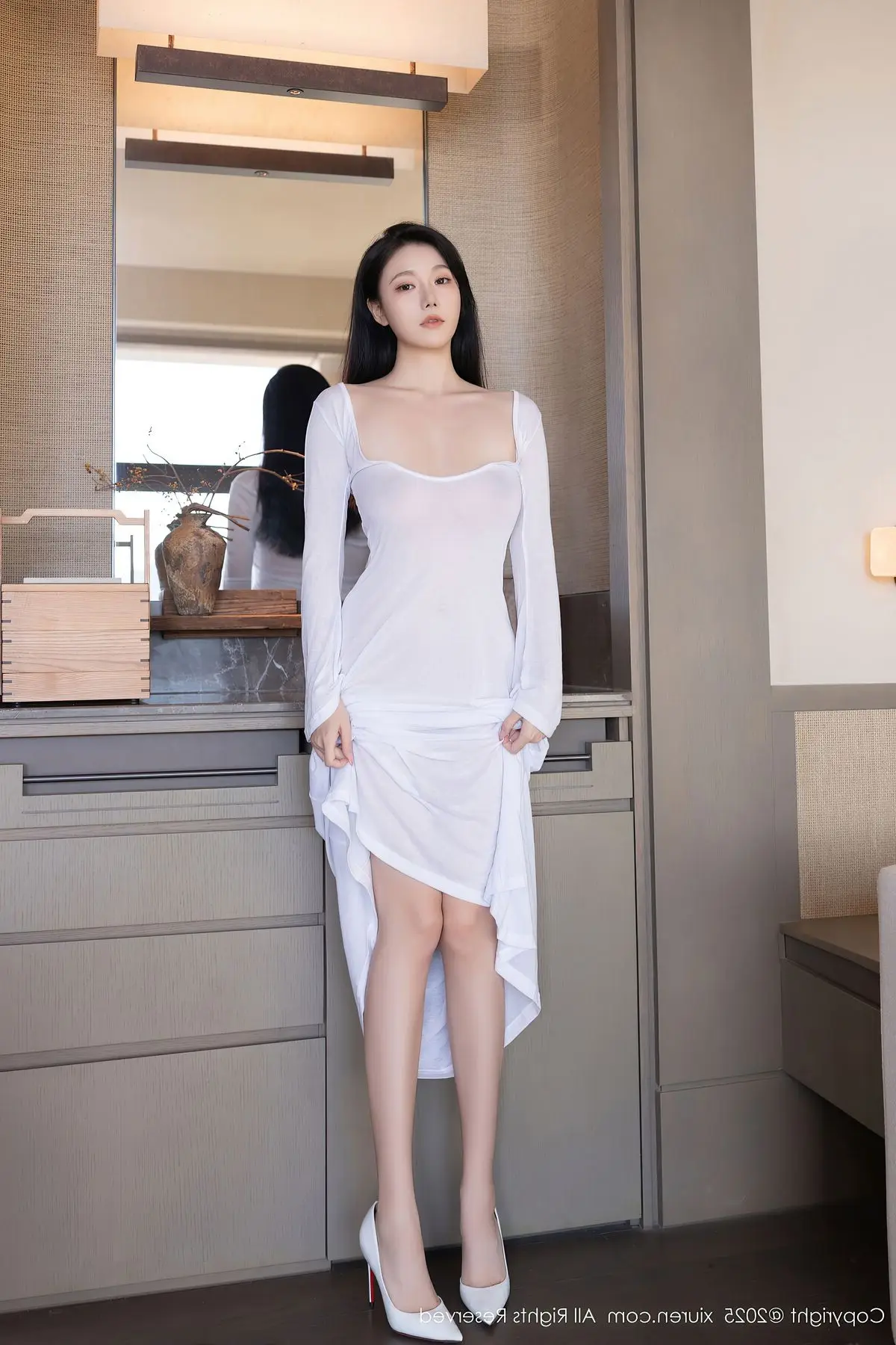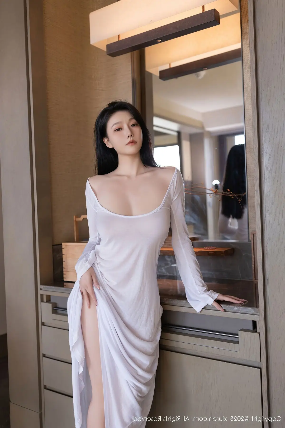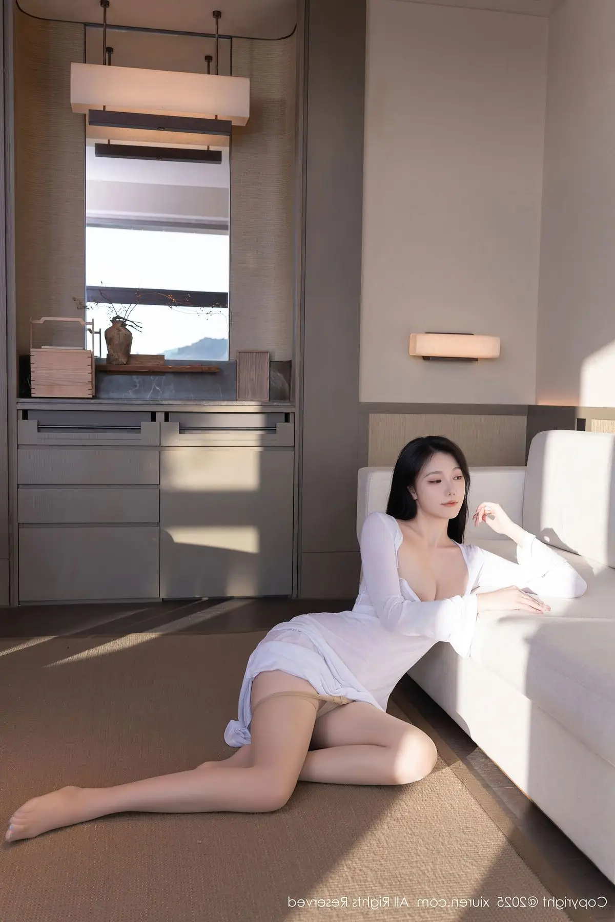 An Ran shines brightly in the XiuRen No10747 photoshoot showcasing her elegant and alluring beauty She wears a long formfitting white dress highlighting her slender figure and soft contours Bathed in gentle natural light from the window An Ran poses gracefully by the sofa exuding charm and sophistication Every gesture and gaze reflects professionalism and captivating charisma This photoshoot is a perfect blend of refined fashion and a modern setting creating artistic and emotional moments An Ran in her pristine white attire presents a pure yet undeniably sensual image#AnRan #XiuRen #WhiteDress #Elegance #NaturalLight