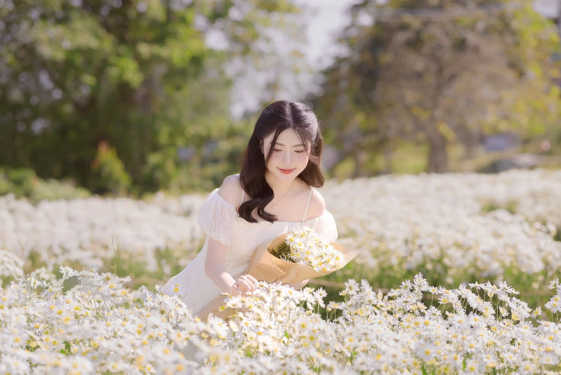 Golden Hour Dream: Ethereal Beauty in White Amidst a Blooming Field