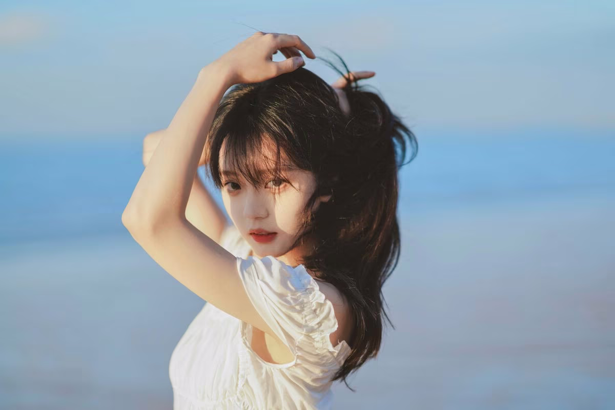 This stunning image captures model Enndme radiating gentle grace and elegance by the seaside. She is adorned in a pristine white dress, her long hair flowing naturally in the soft breeze. The tender light of either dusk or dawn bathes the scene, creating an atmosphere of peace and romance. Enndme stands on the soft sand, her gaze distant as if conveying her thoughts to the vast ocean. The white dress gently flutters with the sea breeze, accentuating her slender figure and pure beauty. This is more than just a portrait; it is an artwork where human natural beauty harmonizes with the majestic seascape. The YiTuYu Vol.8279 series promises to touch viewers' hearts with its unique tranquility and captivating charm.