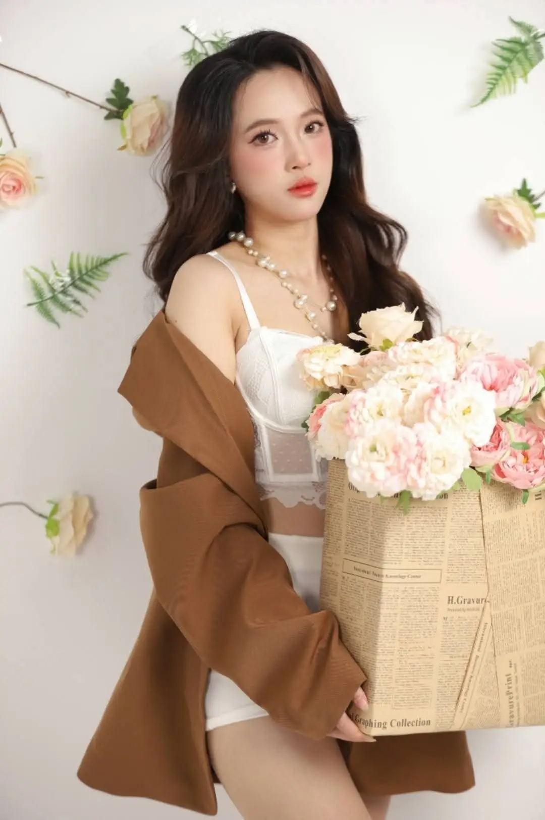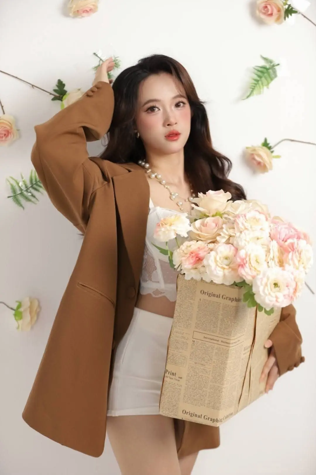 This captivating image captures a young woman's alluring presence, showcasing her delicate beauty with flowing long hair and a confident gaze. She elegantly combines a seductive white lace bralette with stylish white shorts and a chic brown blazer, creating a look that is both glamorous and sophisticated. The studio setting is adorned with soft pink roses and delicate foliage, evoking a dreamy and romantic atmosphere. The woman exudes self-assurance, embodying unique fashion sensibility and irresistible charm. This photograph not only celebrates physical beauty but also radiates the modern woman's spirit of freedom and confidence. The harmonious blend of floral gentleness and the bold outfit creates a compelling overall impression, highlighting her exquisite taste and radiant self-possession.#Fashion #ElegantS #BrownBlazer #WhiteLace #Portrait