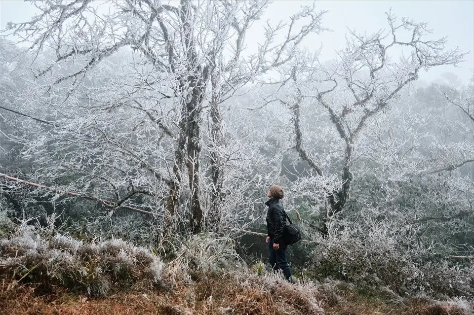 This striking image captures a lone figure immersed in the breathtaking beauty of Vietnam's frost-kissed mountains. A rare and enchanting natural phenomenon, the landscape transforms into a magical winter wonderland as ice and snow delicately adorn every branch and leaf. The person, a small silhouette against the vast, serene backdrop, embodies the unique experience of 'ice hunting' – seeking out these ephemeral, mystical scenes. Vietnam's winter landscapes offer not just a visual spectacle but an inspiring journey for adventurers and photographers alike, revealing a captivating, ethereal charm in its high-altitude regions each cold season.#VietnamWinter #FrostyMountains #IceHuntingVietnam #MysticalLandscape #WinterTravelVietnam