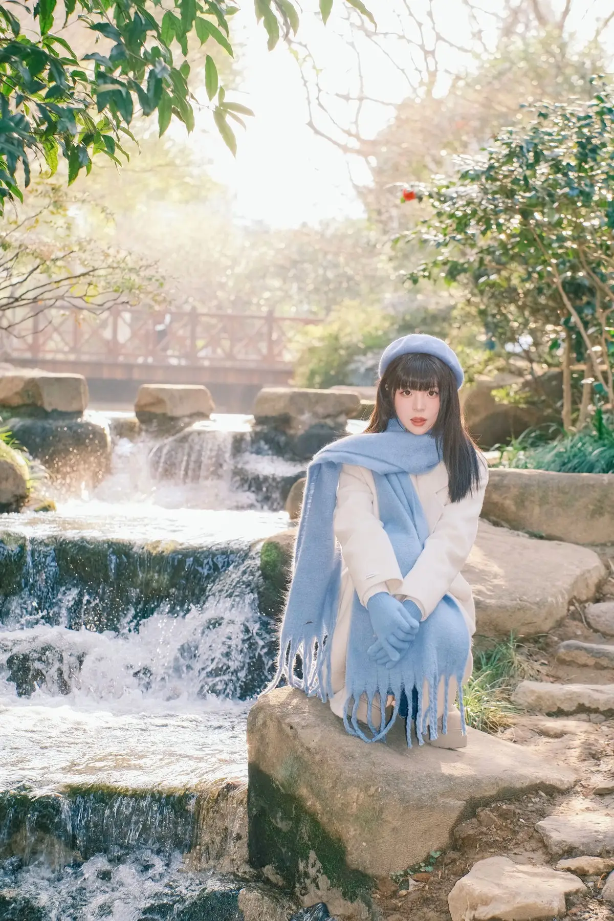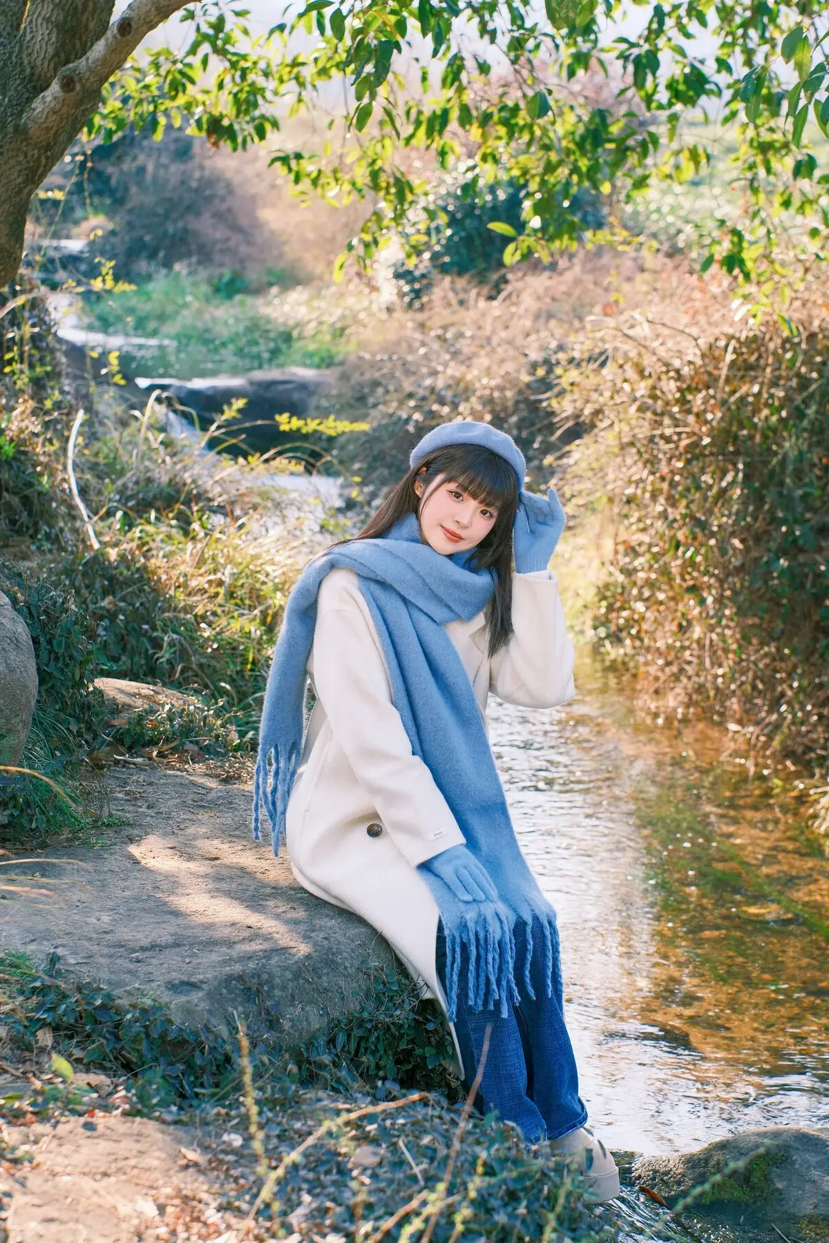 In the warm winter afternoon sun model Sai Xi Xi Li Ma appears with an ethereal and gentle beauty by the small stream She sits gracefully on a moss-covered rock her long hair flowing softly Her blue scarf and pristine white coat enhance her elegant demeanor blending perfectly with the wild serene natural landscape The clear water flows quietly reflecting sparkling light creating a picturesque scene This moment evokes a sense of tranquility and detachment like a harmonious note amidst a bustling life Sai Xi Xi Li Ma is not just a model but an integral part of this natural beauty bringing peace and poetic charm to the viewer#SaiXiXi #LiMa #YiTuYu #PeacefulNature #WinterVibes #WarmWinterSun