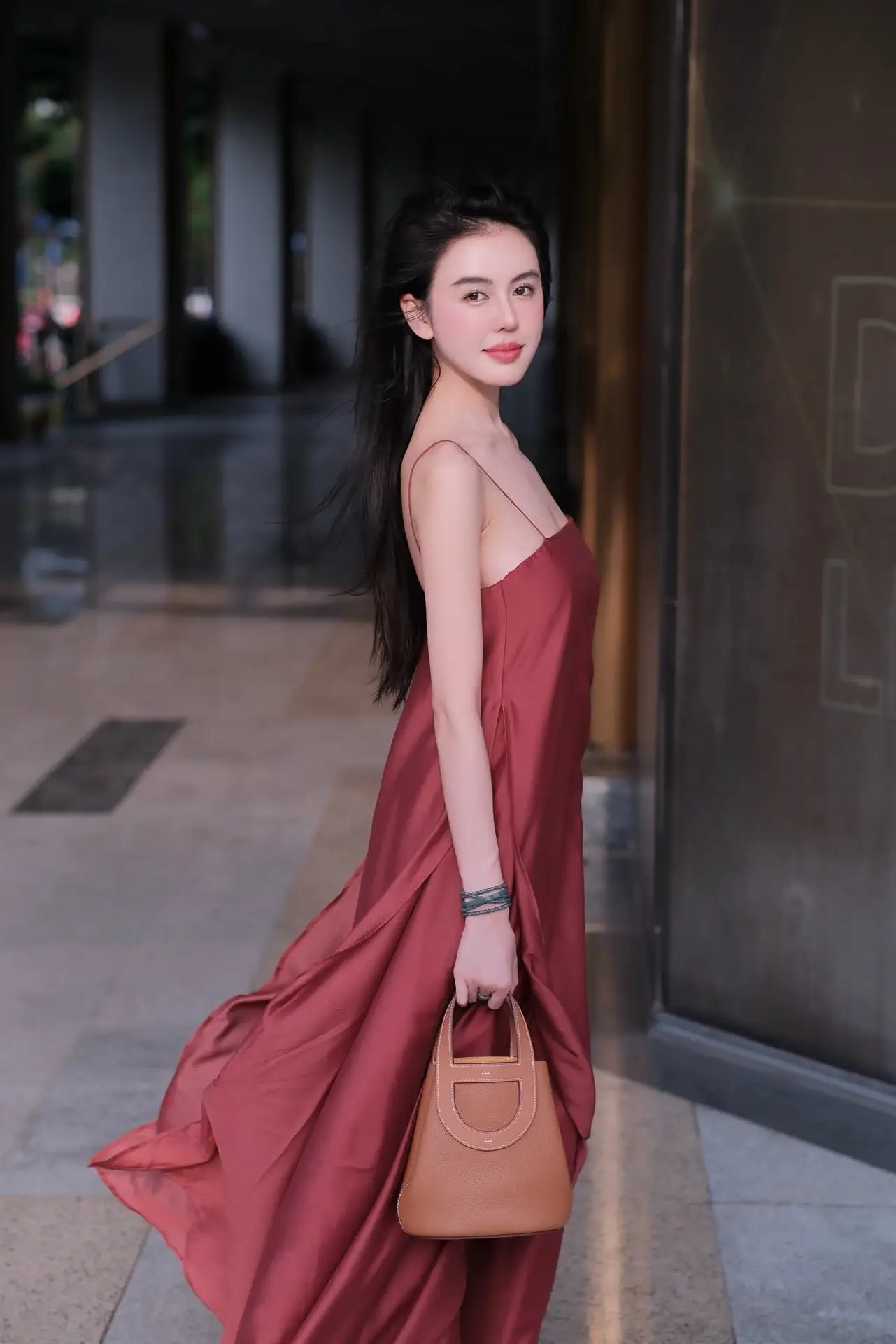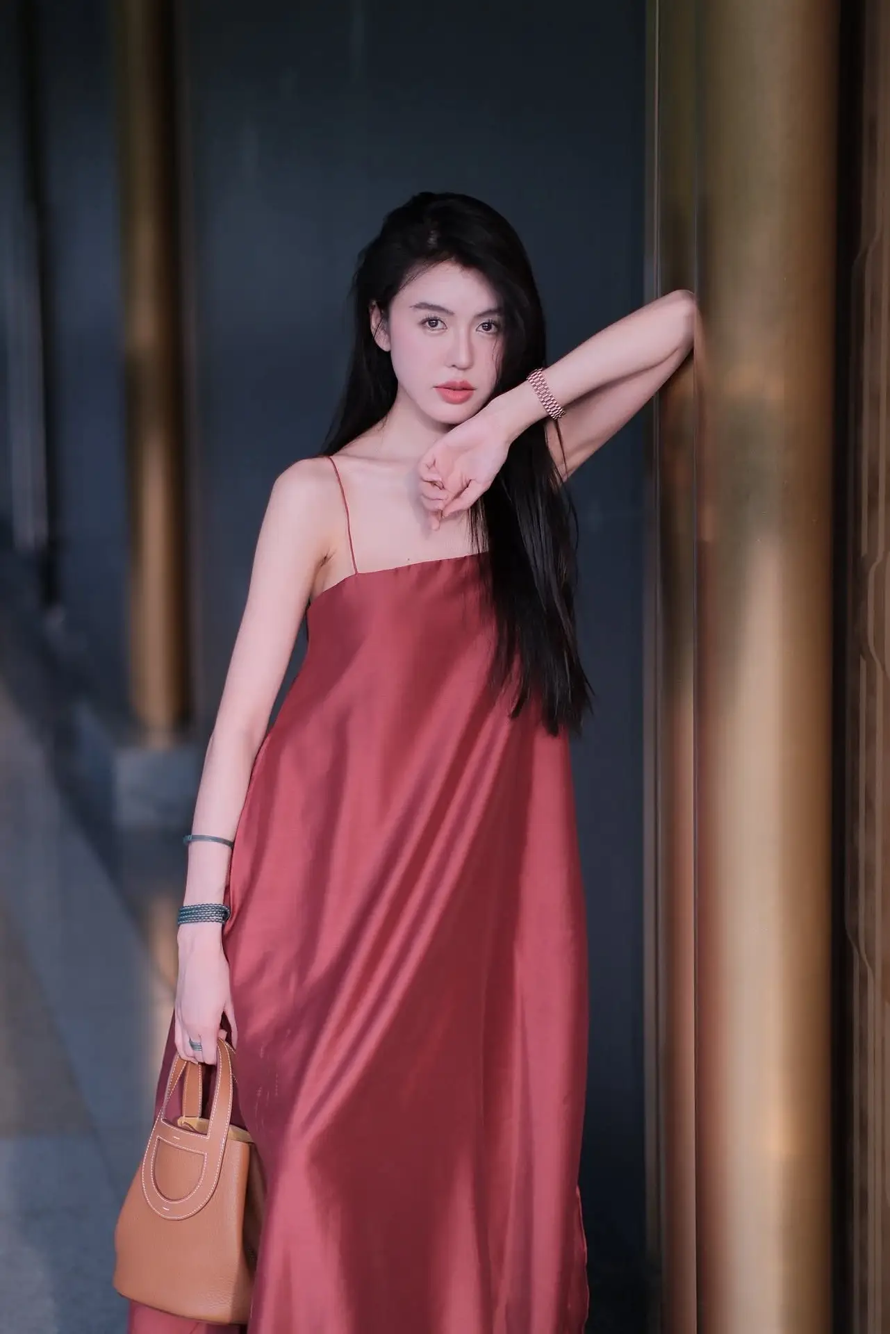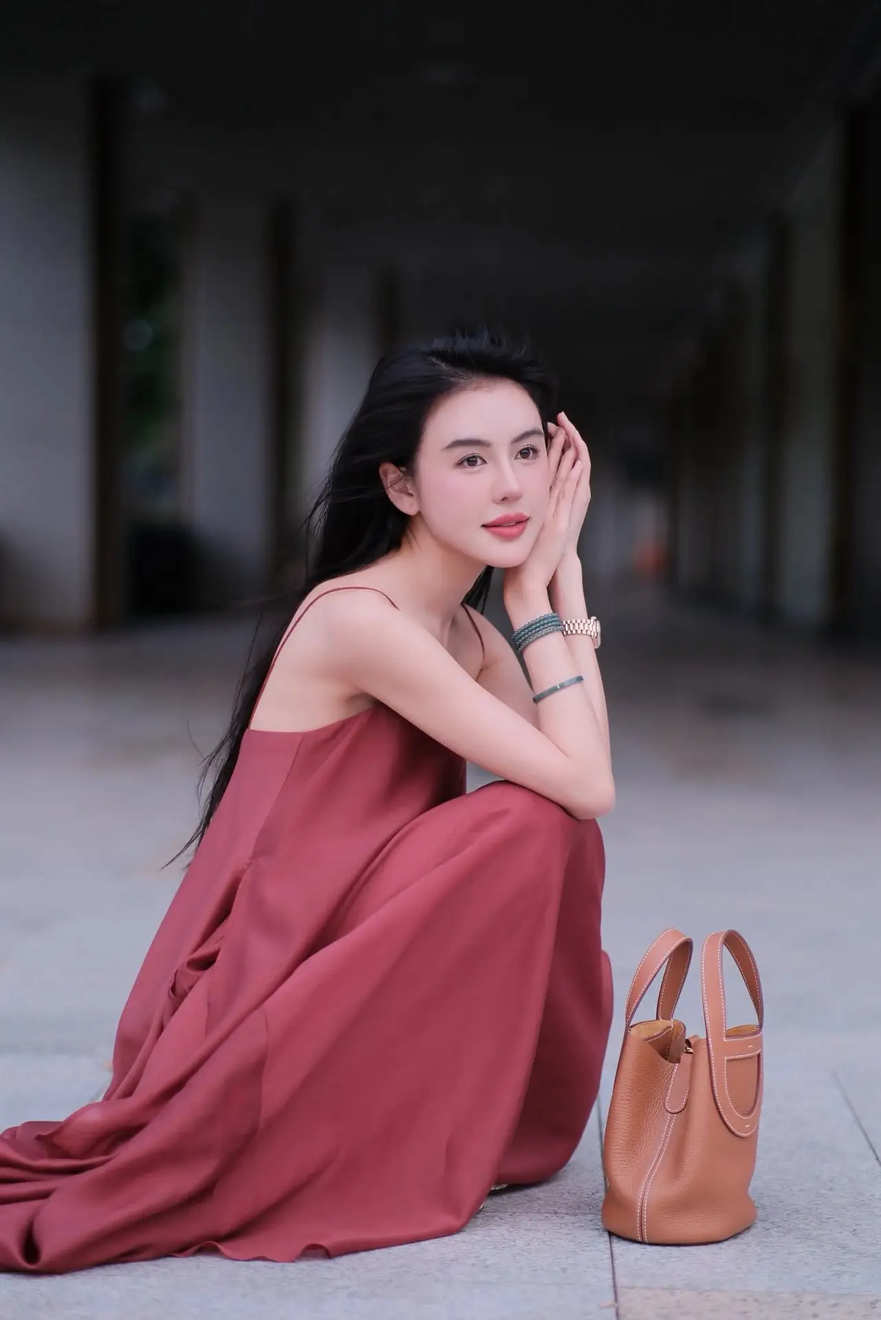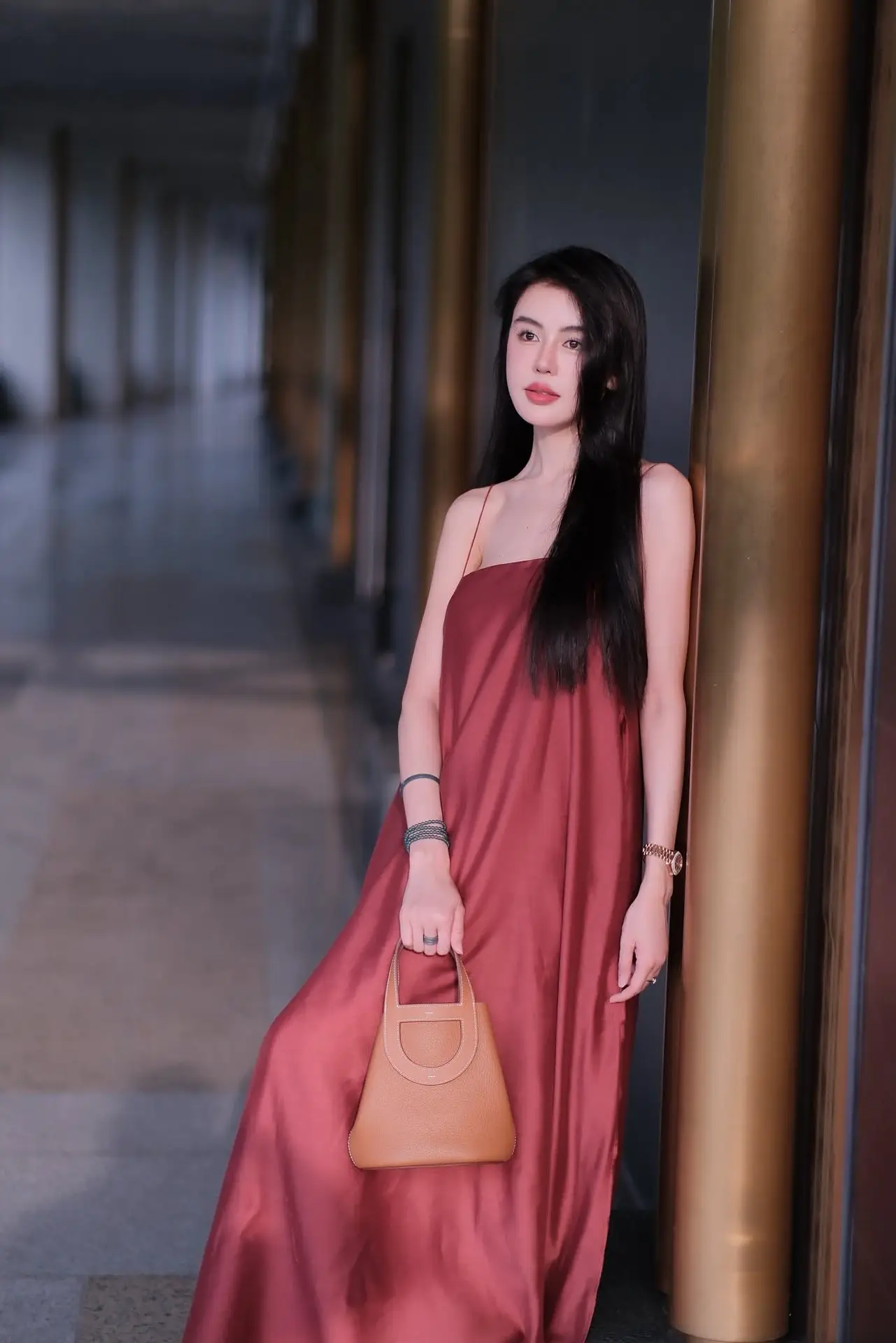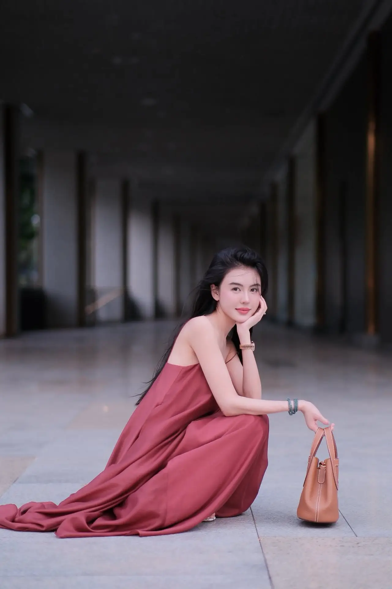 This captivating image features a beautiful woman exuding grace and confidence. She is elegantly posed in a flowing reddish-brown maxi dress that accentuates her slender figure and feminine charm. A stylish brown handbag rests beside her, adding a refined touch to her overall look. With her long dark hair and gentle smile, she embodies a serene yet alluring aura. The backdrop of a modern architectural corridor with its minimalist lines and soft lighting perfectly complements her sophisticated style and timeless elegance. This picture is a true representation of refined fashion and poised beauty.#MaxiDressStyle #ElegantFashion #WomanInRed #AsianBeauty #PortraitPhotography