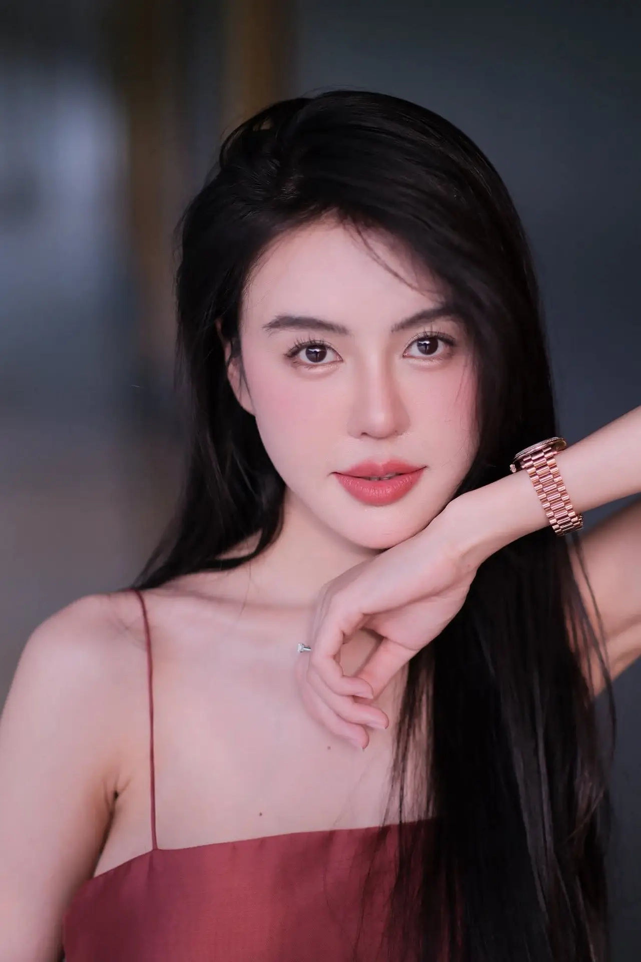 Captivating Asian Beauty: The Elegant Woman in Red with a Charming Smile and Confident Aura