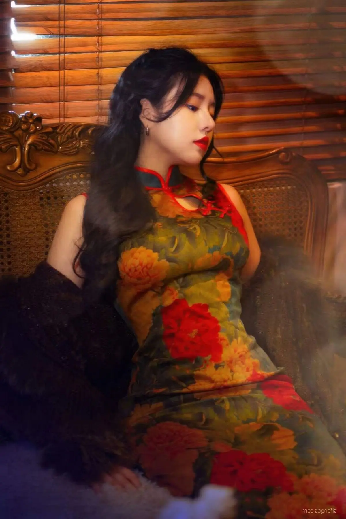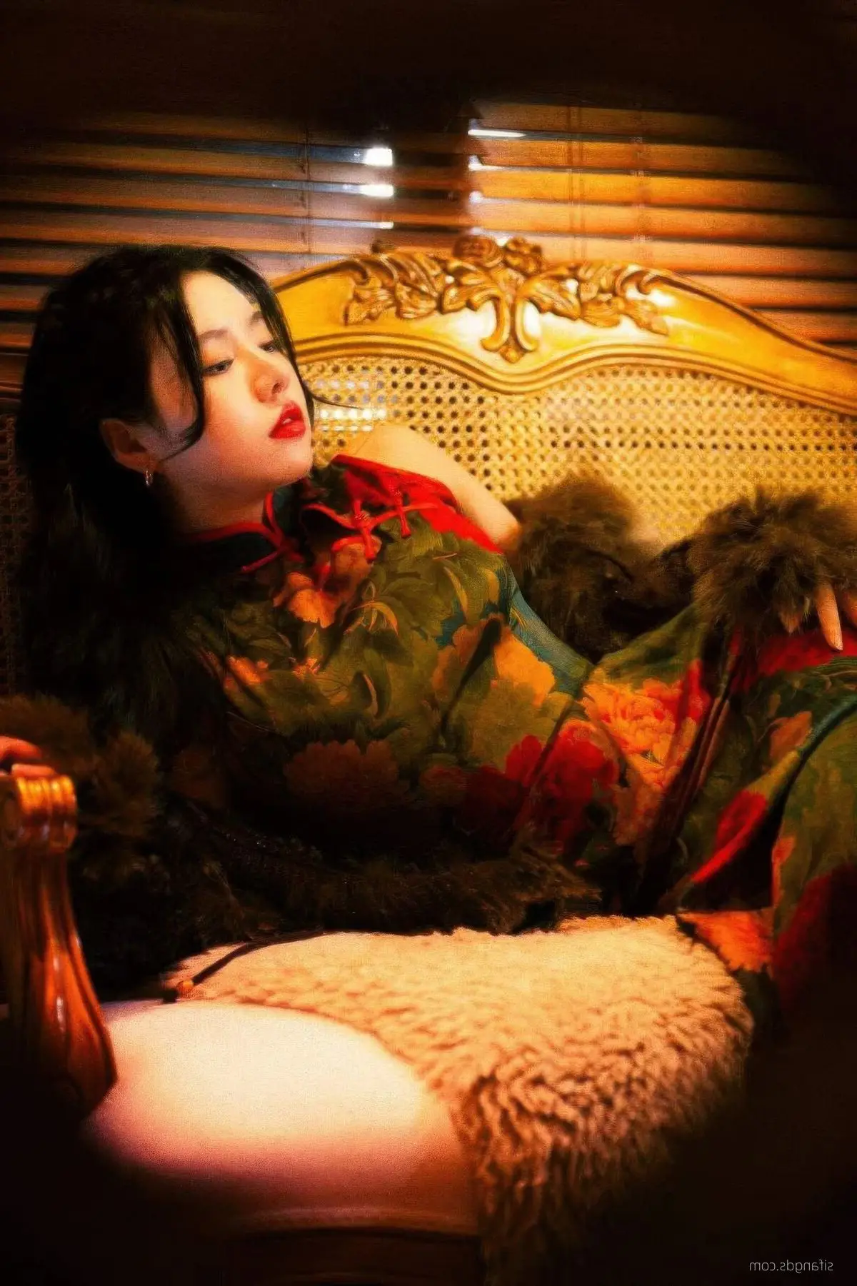 In this Sha Le Mei Xiao Cang Lao Shi Part02 photo collection, the model exudes an irresistible alluring beauty and elegant demeanor. She reclines gracefully on a classic sofa, her eyes subtly closed in contemplation, creating a mysterious and captivating moment. Her intricately patterned, warm-toned attire, paired with striking red lipstick, accentuates her sophisticated Asian charm. The soft, golden lighting further enhances the romantic and classic ambiance of the image. This piece is part of a special collection, revealing unique insights into Sha Le Mei Xiao Cang Lao Shi's style and charisma, sure to enchant viewers.