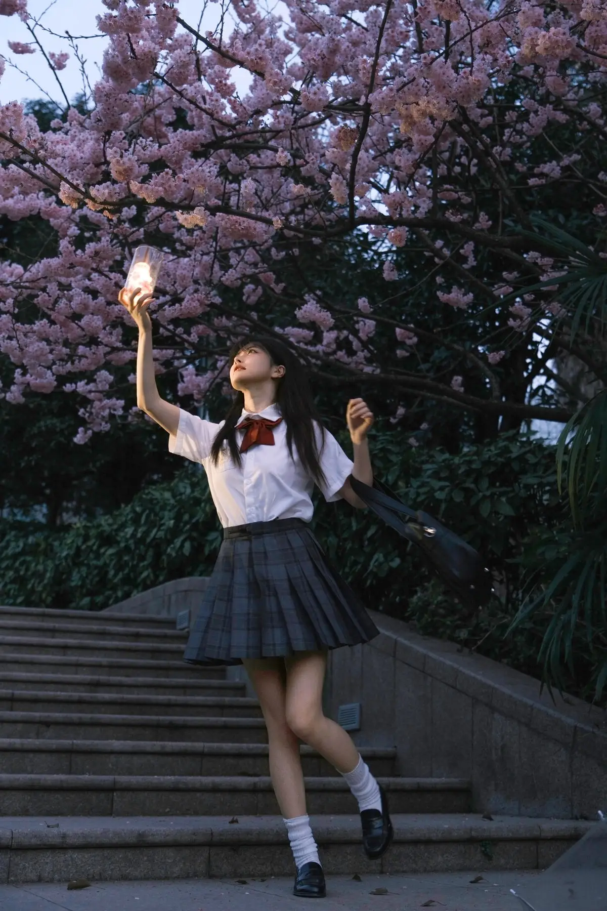 In the YiTuYu Vol8564 series model Xing Zhi Ka Tao embodies an ethereal muse amidst a magical setting Dressed in a delicate school uniform she gently cradles a glowing lantern its warm light illuminating her serene face and flowing hair Surrounding her are soft pink cherry blossoms weaving a romantic and dreamlike tapestry A clear umbrella overhead enhances the surreal beauty suggesting shes wandering through a twilight reverie This enchanting portrait evokes a sense of peace tenderness and a touch of mystery inviting viewers to immerse themselves in the captivating charm of this moment where dusk meets night