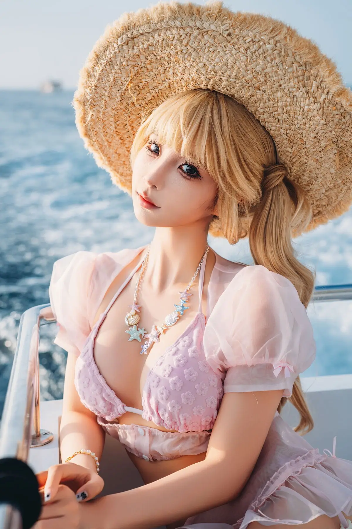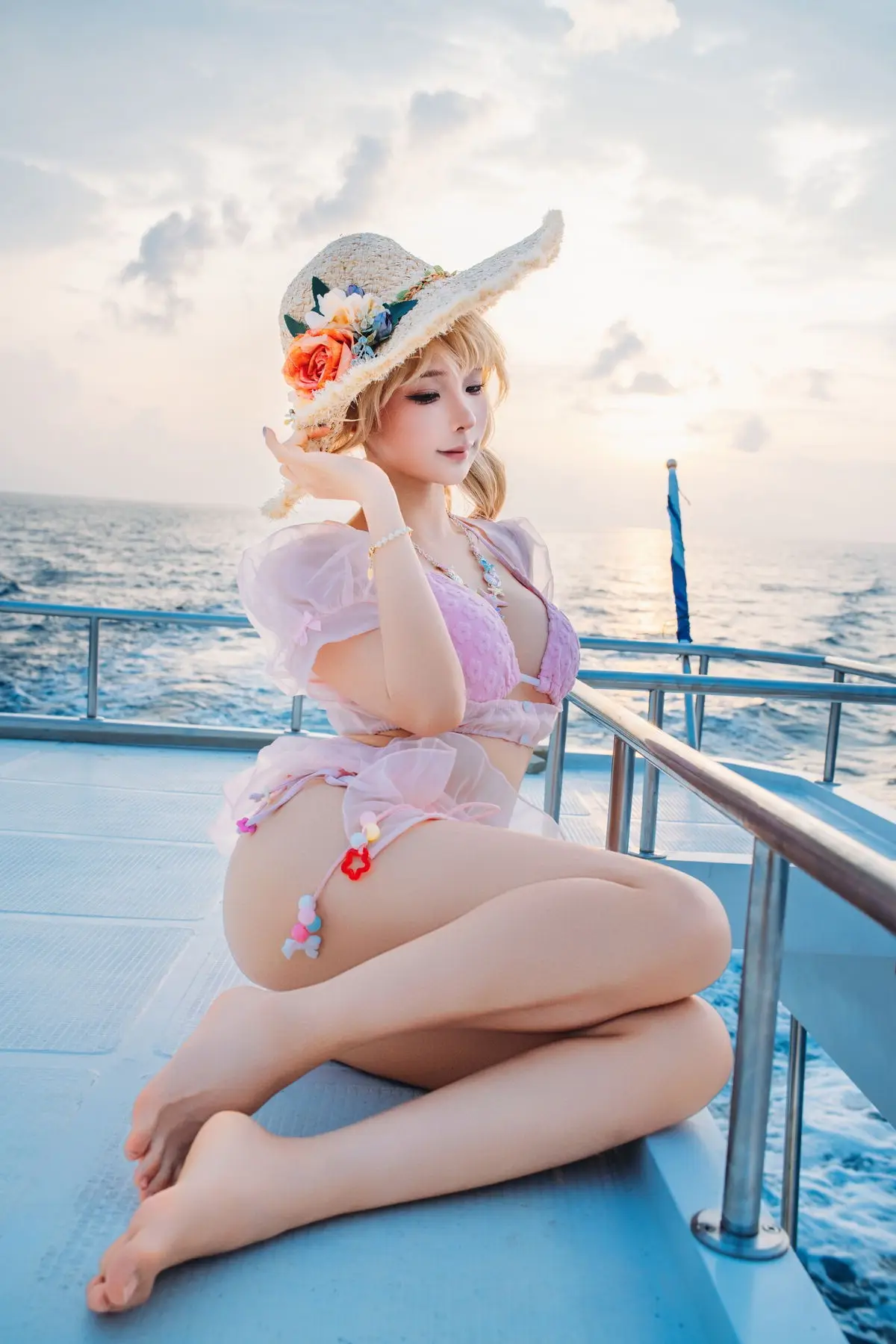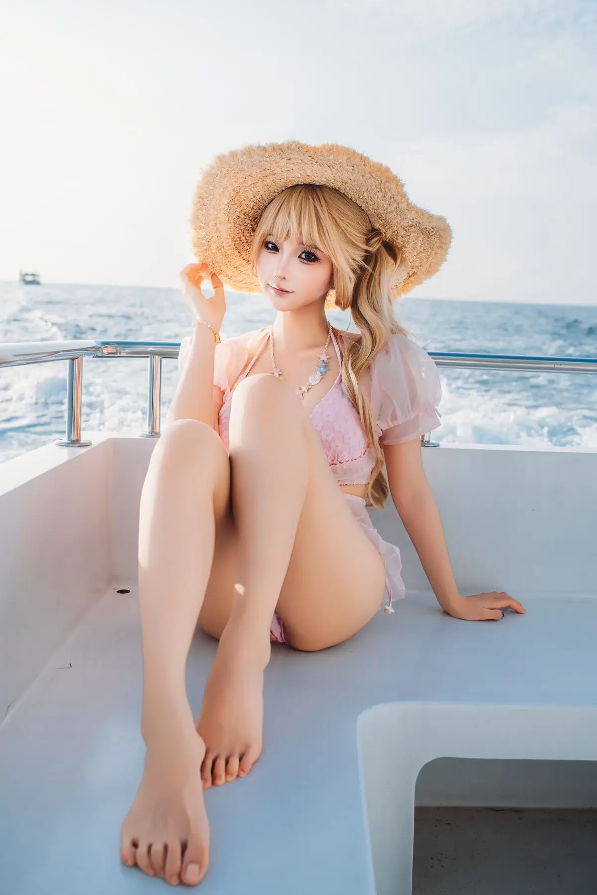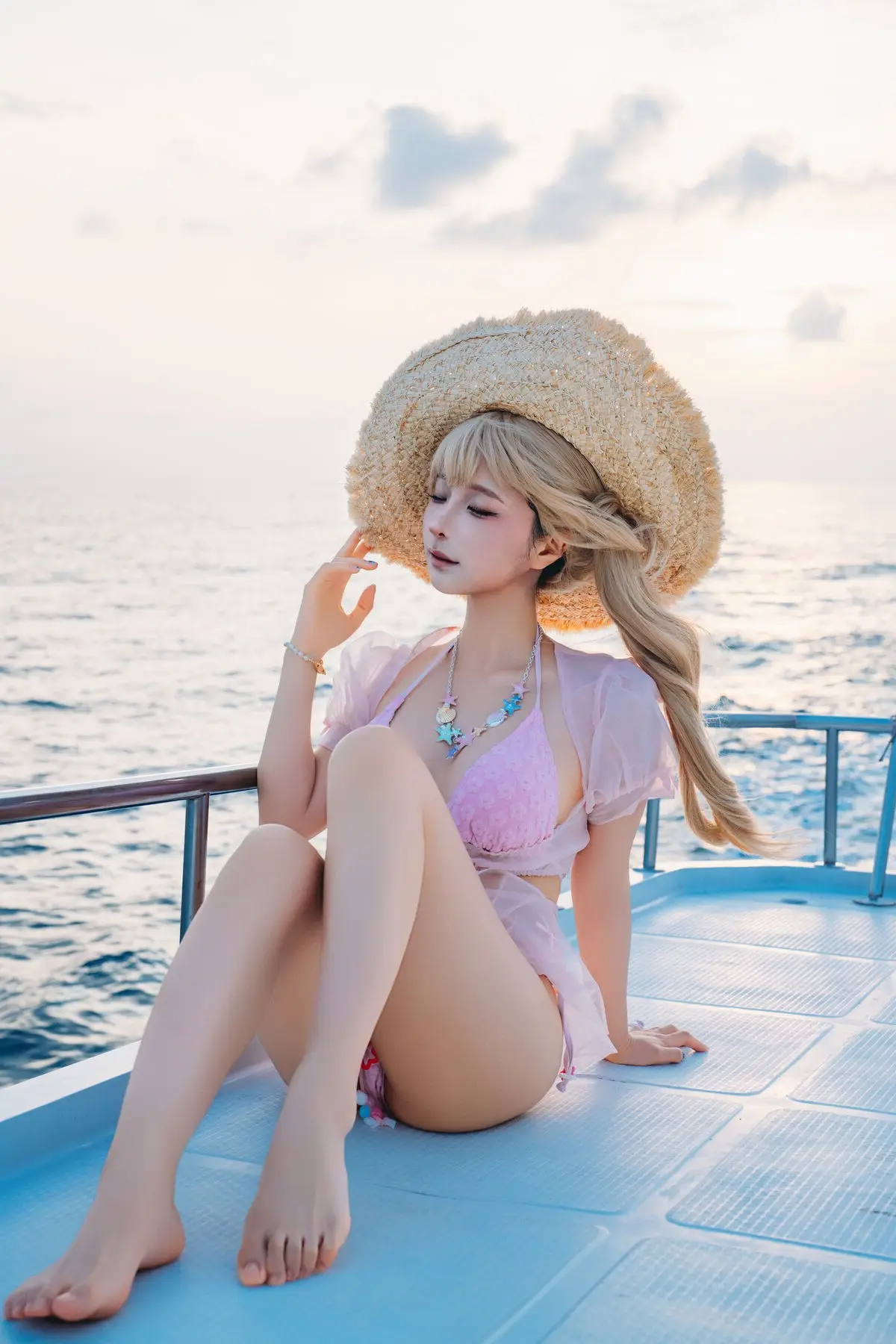 Immerse yourself in the captivating charm of Coser Chunmomo as she graces a luxurious yacht. Dressed in a delicate pastel pink swimsuit and a stylish straw hat, Chunmomo poses elegantly against the breathtaking backdrop of a vibrant ocean sunset. The golden hour light bathes the serene waters, creating a romantic tableau that enhances her ethereal beauty and alluring presence. This self-portrait series Part02 masterfully blends exquisite beach fashion with the artistry of cosplay, capturing moments of serene relaxation. It promises a truly unforgettable visual journey for viewers.#CoserChunmomo #YachtLife #SunsetVibes #BeachFashion #CosplayPhotography