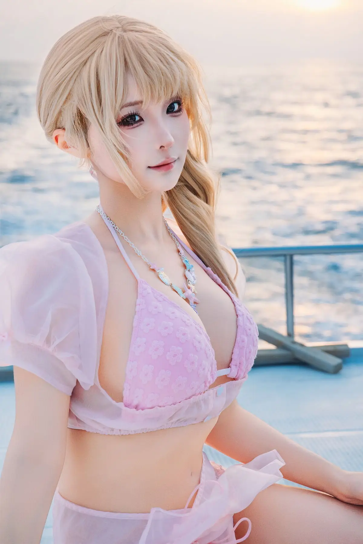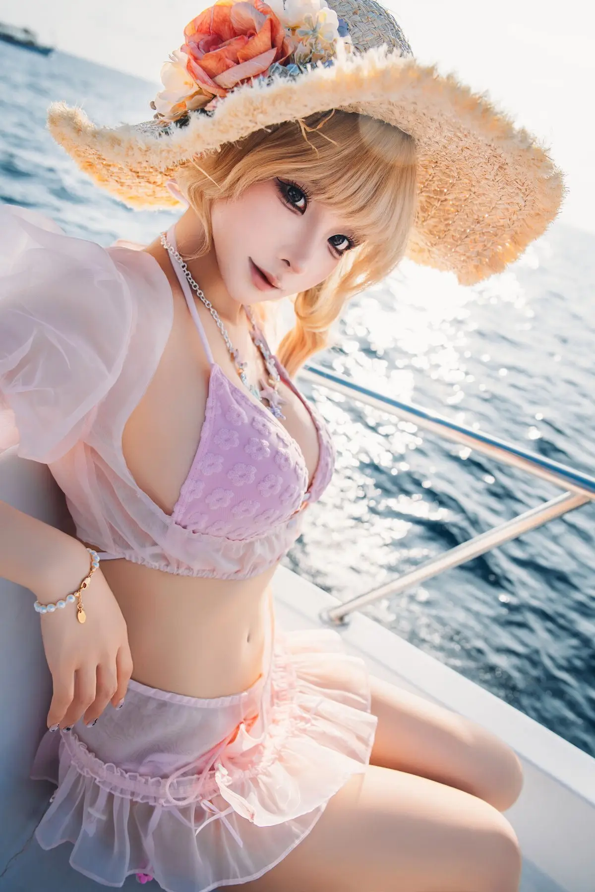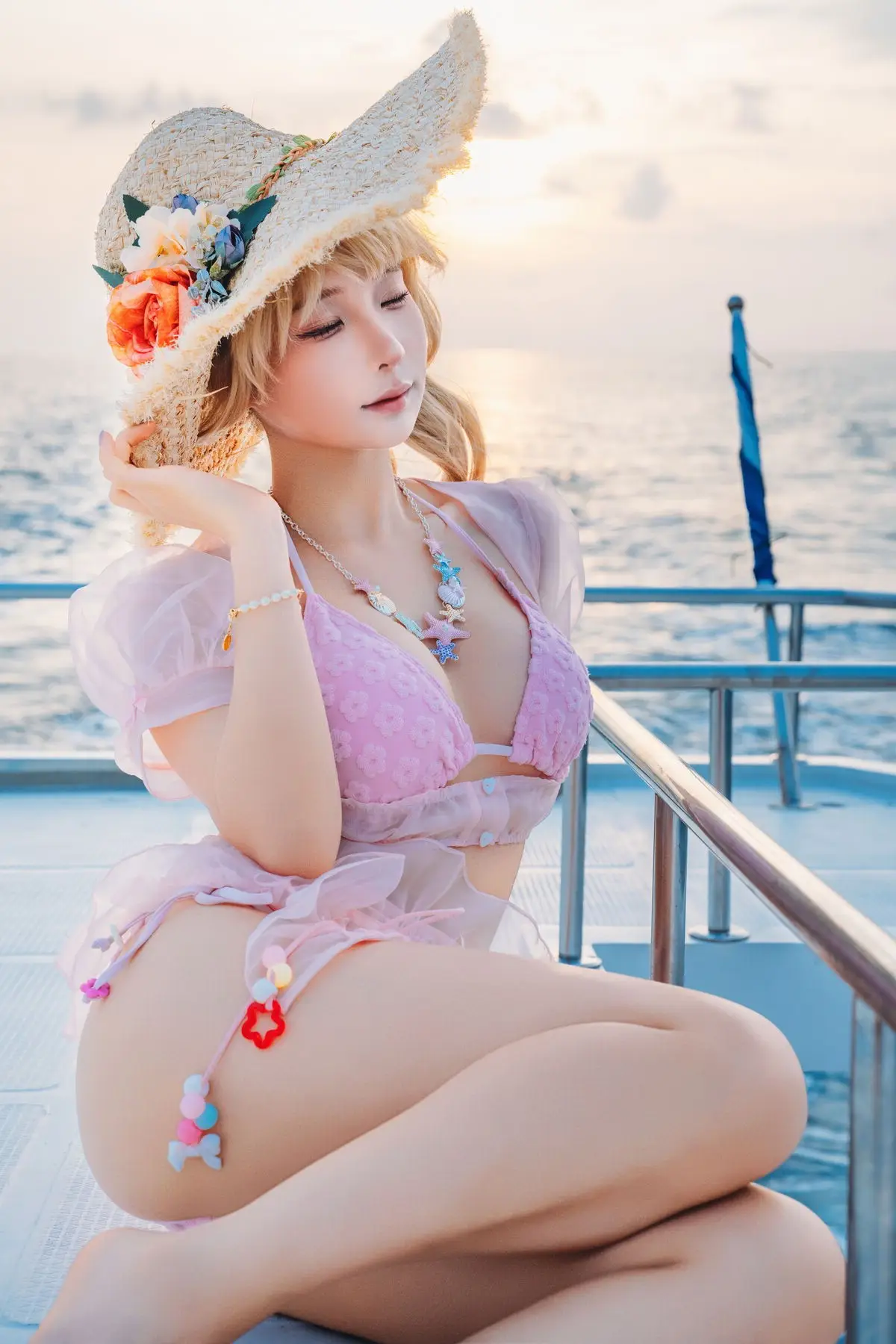 Immerse yourself in the captivating charm of Coser Chunmomo as she graces a luxurious yacht. Dressed in a delicate pastel pink swimsuit and a stylish straw hat, Chunmomo poses elegantly against the breathtaking backdrop of a vibrant ocean sunset. The golden hour light bathes the serene waters, creating a romantic tableau that enhances her ethereal beauty and alluring presence. This self-portrait series Part02 masterfully blends exquisite beach fashion with the artistry of cosplay, capturing moments of serene relaxation. It promises a truly unforgettable visual journey for viewers.#CoserChunmomo #YachtLife #SunsetVibes #BeachFashion #CosplayPhotography