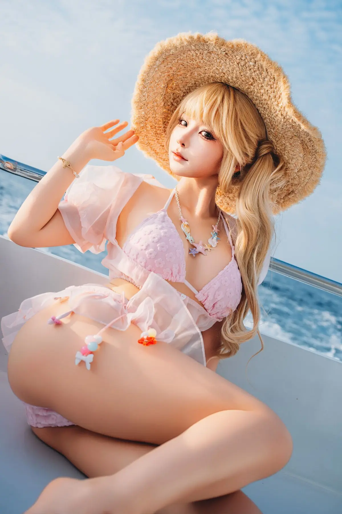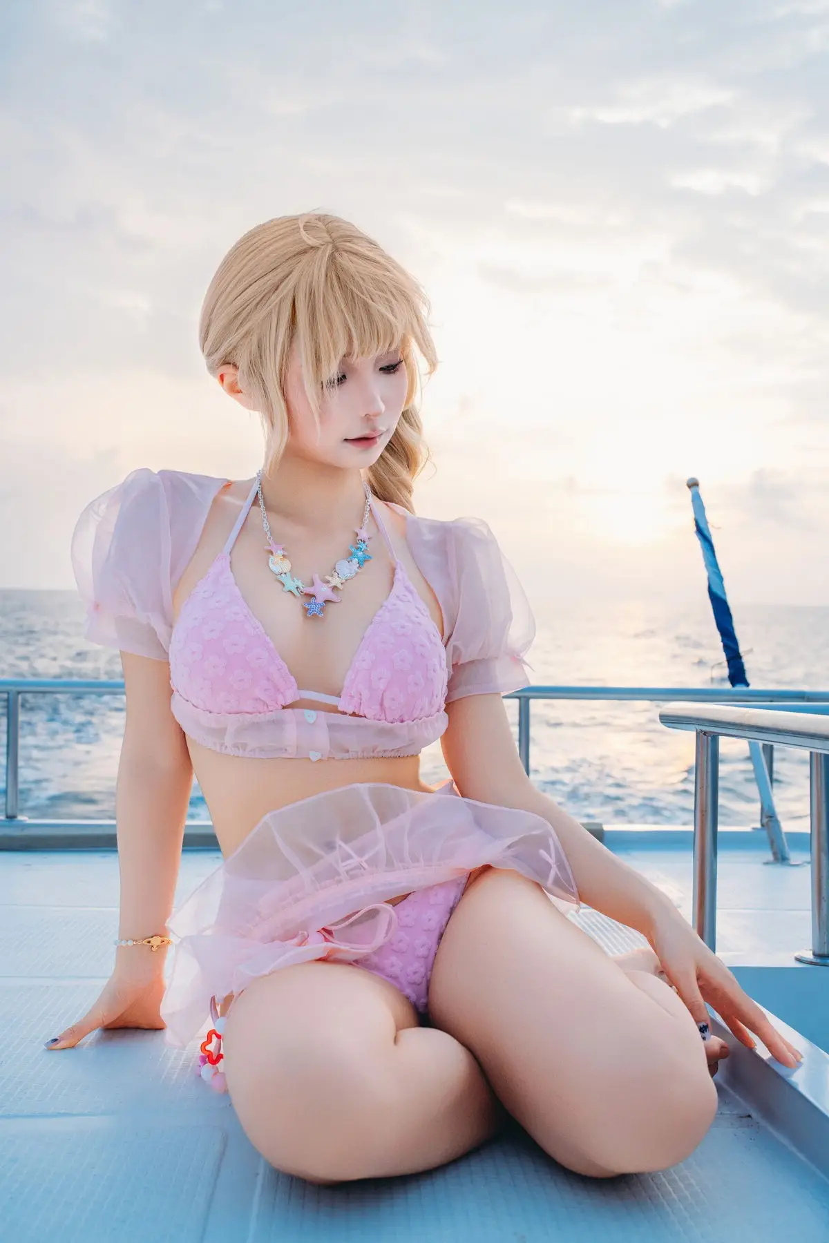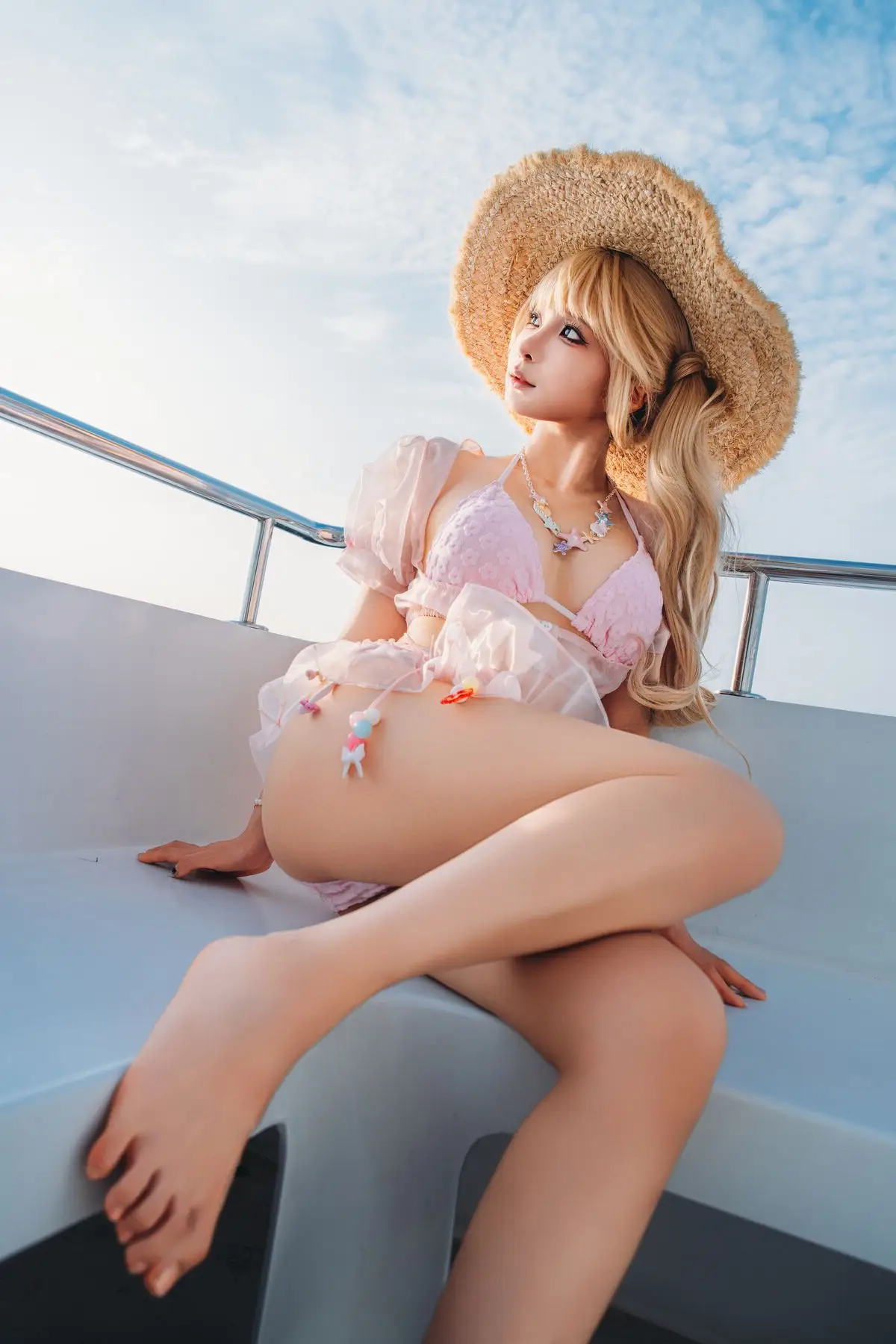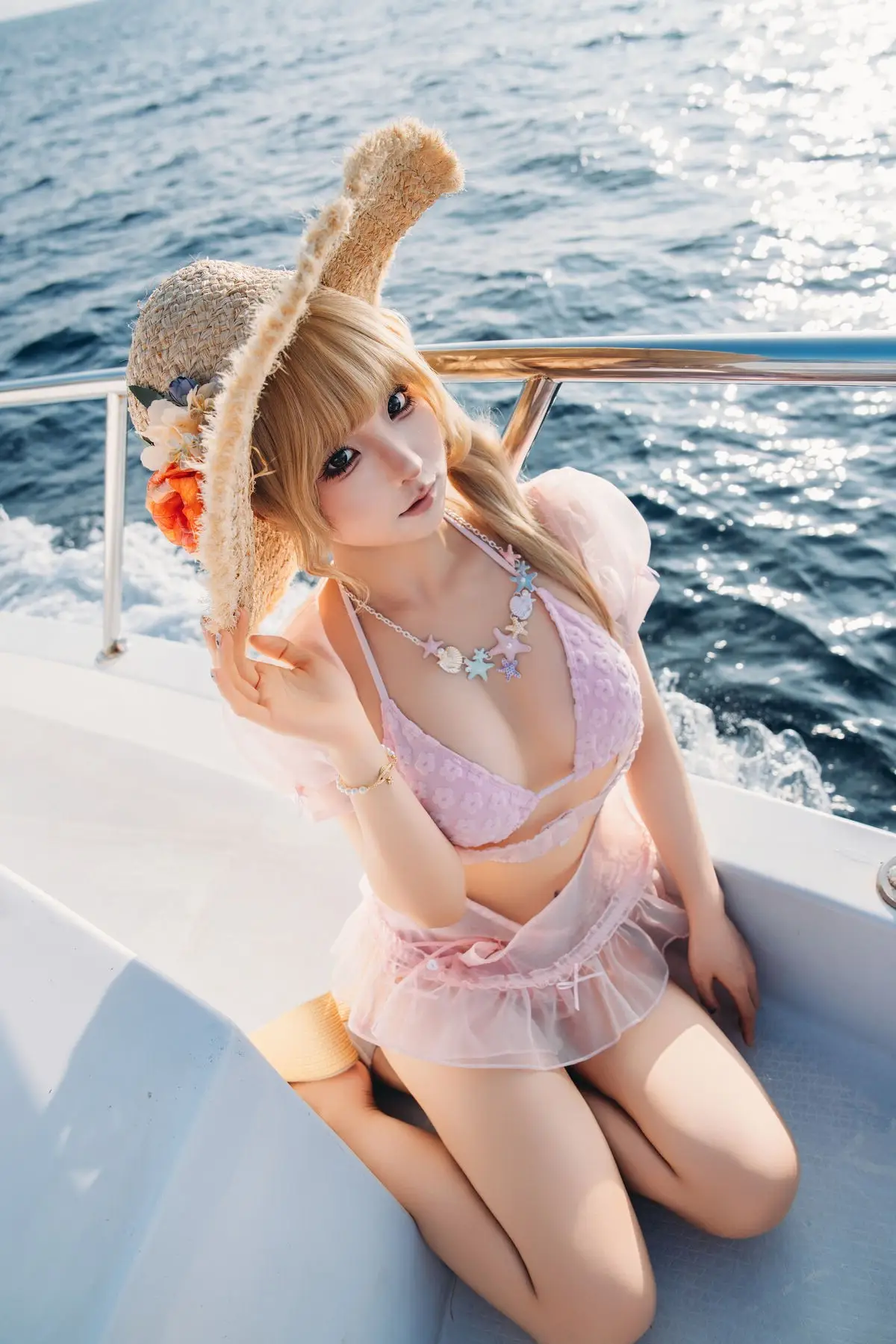 Immerse yourself in the captivating charm of Coser Chunmomo as she graces a luxurious yacht. Dressed in a delicate pastel pink swimsuit and a stylish straw hat, Chunmomo poses elegantly against the breathtaking backdrop of a vibrant ocean sunset. The golden hour light bathes the serene waters, creating a romantic tableau that enhances her ethereal beauty and alluring presence. This self-portrait series Part02 masterfully blends exquisite beach fashion with the artistry of cosplay, capturing moments of serene relaxation. It promises a truly unforgettable visual journey for viewers.#CoserChunmomo #YachtLife #SunsetVibes #BeachFashion #CosplayPhotography