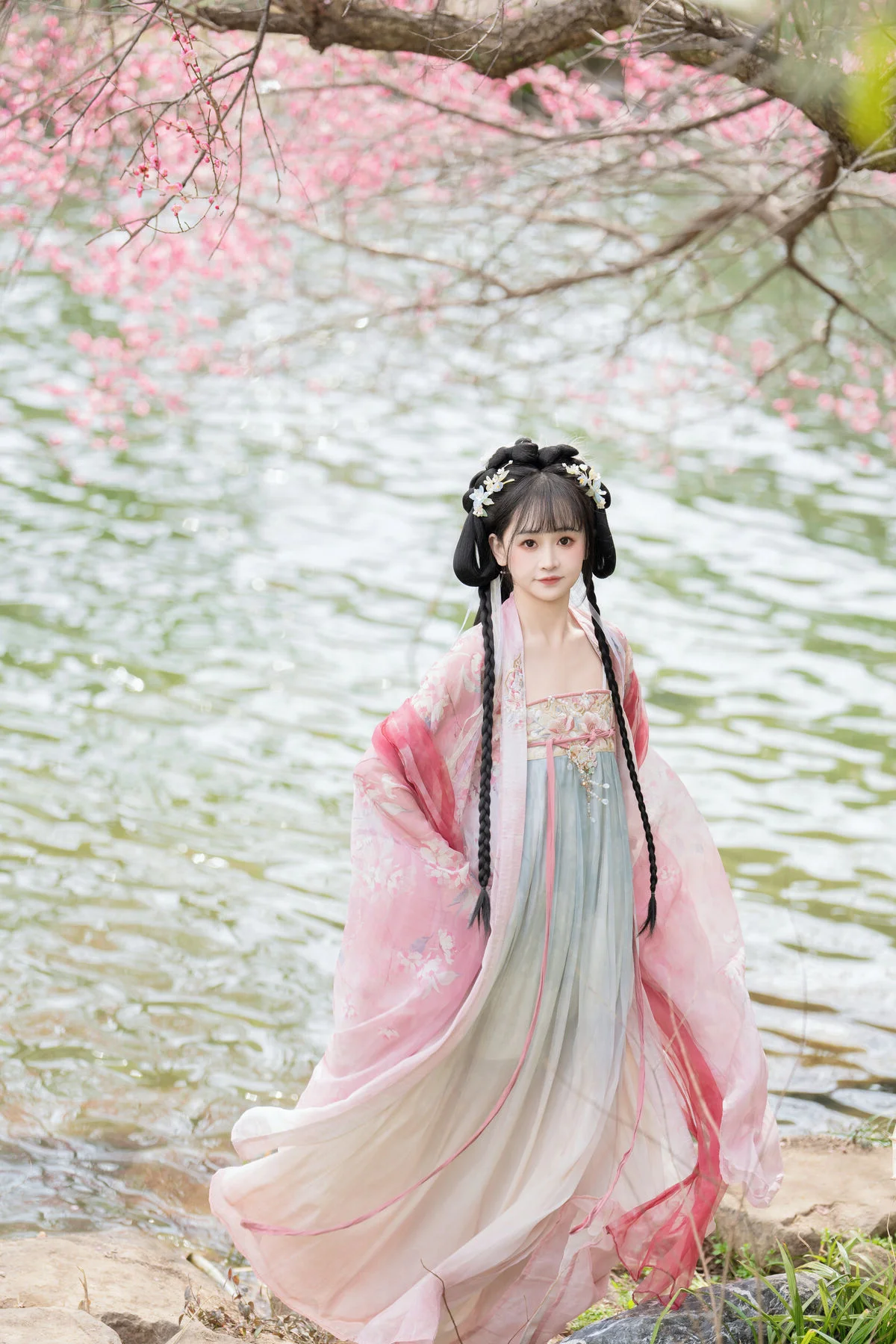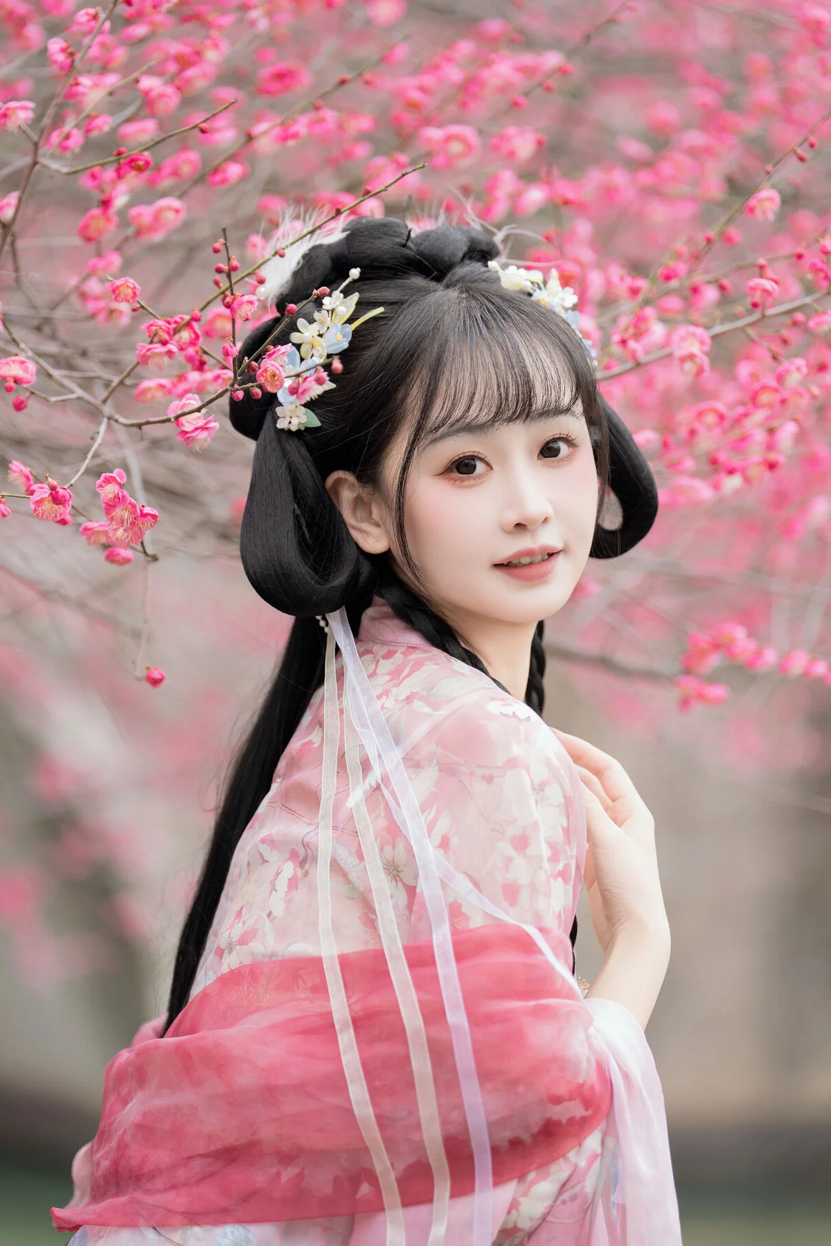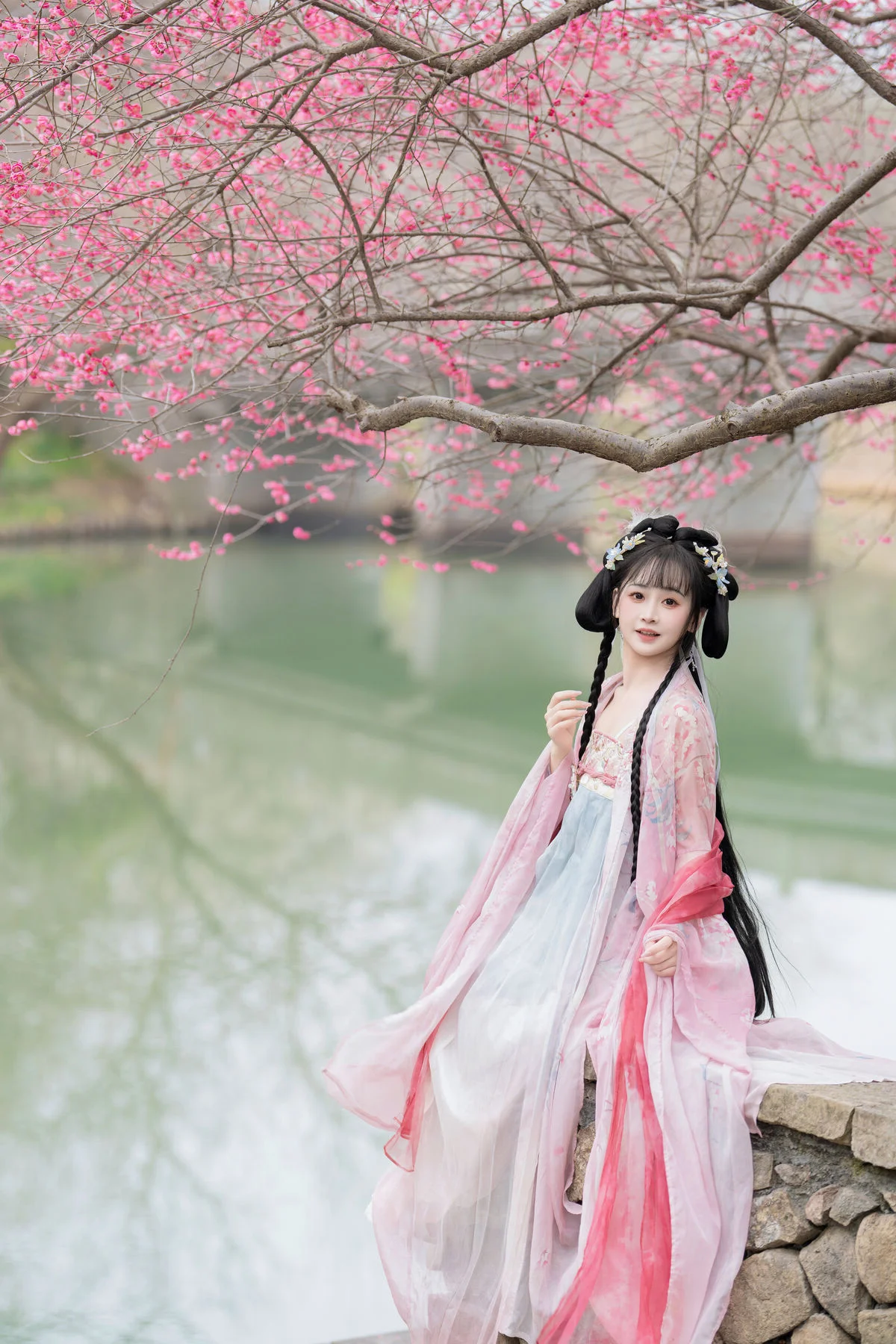 Discover the captivating beauty of Jiao Yi Zhi Sui Sui in the YiTuYu Vol.8759 collection. The enchanting model, adorned in a delicate pink and white Hanfu, gracefully poses amidst a breathtaking display of blooming plum blossoms. Her serene expression and elegant posture evoke a sense of timeless charm, perfectly harmonizing with the tranquil waterscape and lush natural backdrop. This collection beautifully captures the essence of traditional Asian aesthetics and the vibrant spirit of spring, inviting viewers into a world of poetic grace and cultural artistry.