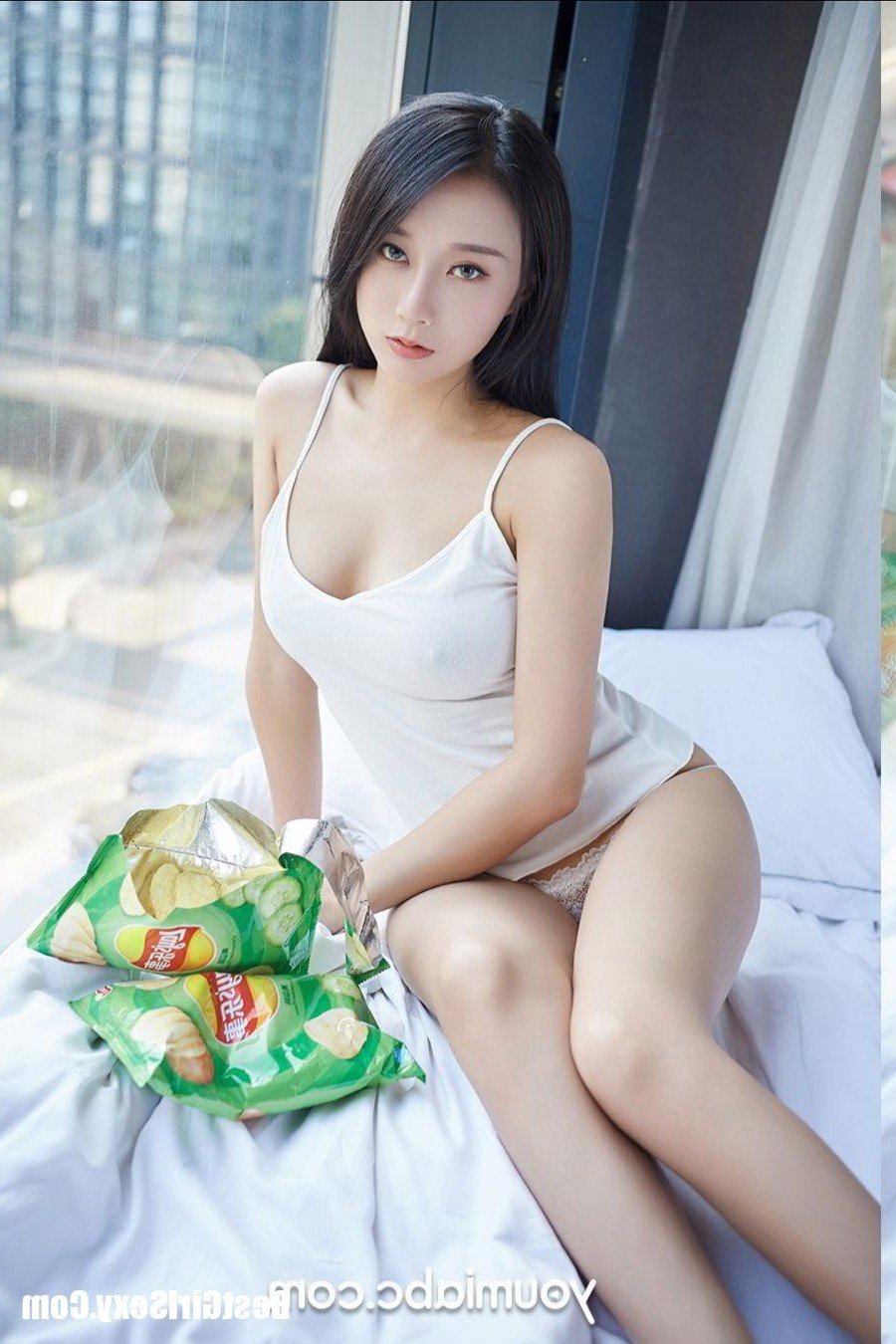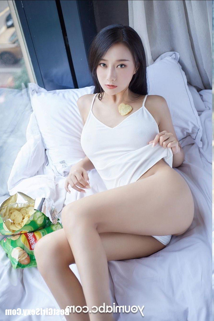 This image features model Youmei Vol.153 He Jia Ying in a captivating and relaxed moment. The beautiful girl is seated on a bed wearing pristine white lingerie that highlights her alluring figure and smooth skin. Her gentle gaze and soft smile create an irresistible charm. The scene of her enjoying potato chips portrays a casual intimate everyday moment yet it still exudes the captivating appeal of a hot home lady. This natural unpretentious beauty is enough to mesmerize showcasing her comfort and self assurance in her own home. The He Jia Ying photo collection not only delivers high quality images but also depicts a modern attractive and vibrant young woman. Discover the enchanting beauty of He Jia Ying in her private space filled with sweetness and allure.