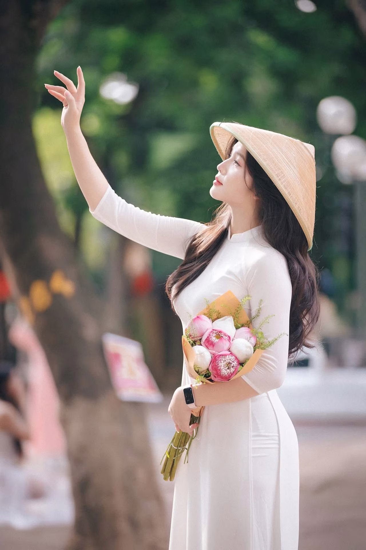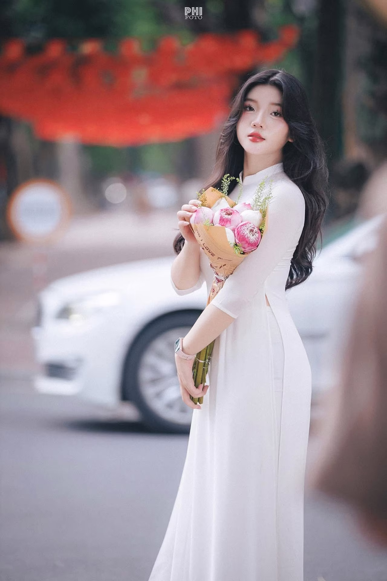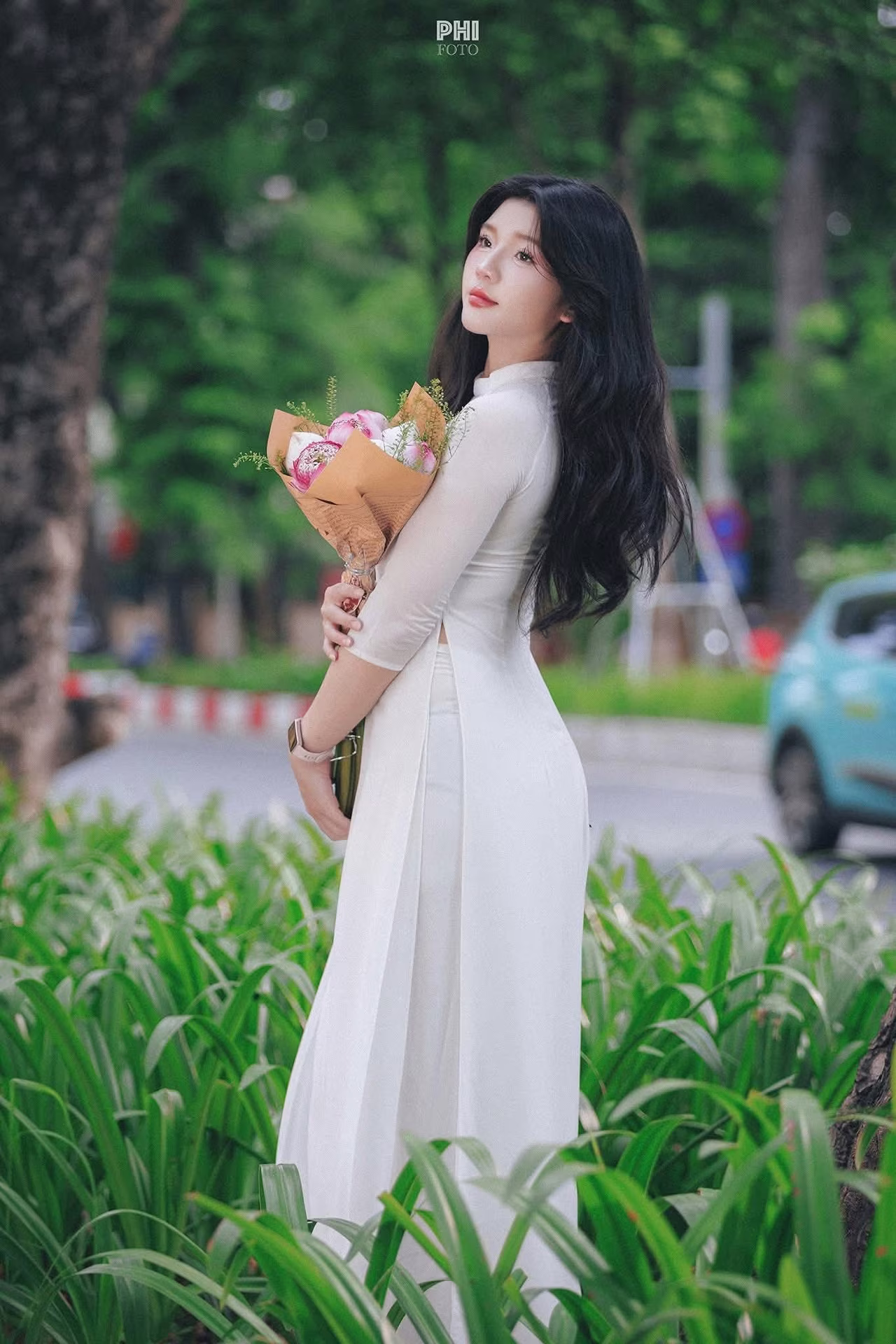 This stunning photograph captures the gentle grace of a Vietnamese girl adorned in a pristine white Ao Dai. With her long flowing dark hair and poised posture, she embodies an elegant and charming beauty. The young woman delicately holds a vibrant bouquet of fresh flowers, her gaze softly distant, creating a poetic and serene scene. The traditional Ao Dai beautifully accentuates her soft and flowing silhouette. Lush green foliage in the foreground provides a natural, refreshing backdrop, highlighting the purity of her attire and her radiant youthful charm. This image not only celebrates Vietnamese cultural beauty but also evokes feelings of tranquility and innocence. It is a harmonious blend of traditional aesthetics and a touch of modern allure.Đông Hoàng