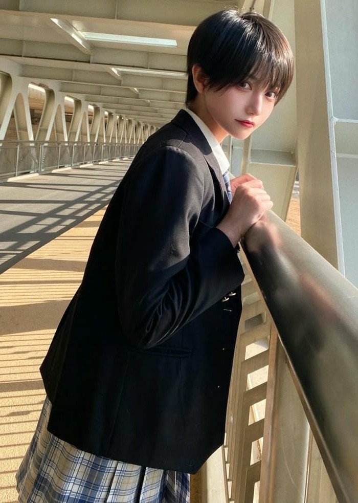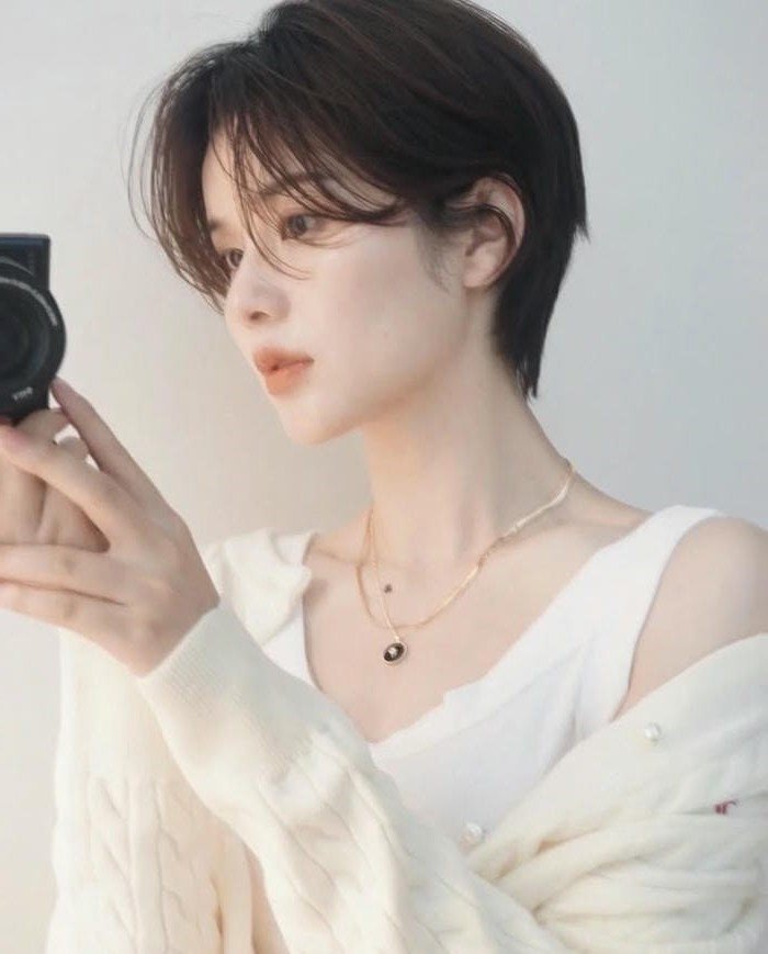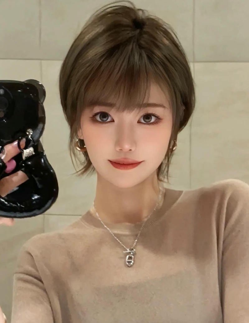 This image highlights a youthful beautiful girl sporting a modern and captivating women's tem haircut. The short hair is skillfully trimmed to frame her round face creating a slender and balanced appearance. This tem hairstyle not only accentuates her charming features but also showcases her individuality and dynamic spirit. With light wispy bangs this cut helps the face appear more compact while also providing a fresh and radiant look. It is a perfect choice for girls looking to transform their style seeking confidence and uniqueness. This women's tem hair is not only easy to maintain but also highly versatile suiting various fashion styles from gentle to edgy.