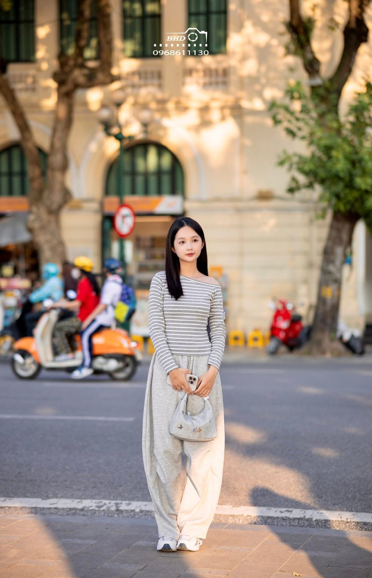 This image captures the natural beauty and vibrant spirit of a Vietnamese girl on the street. Her radiant smile is a focal point reflecting a soul full of energy and optimism. She showcases a modern and distinctive street fashion style featuring a trendy off-shoulder striped top paired with comfortable wide-leg pants and dynamic sneakers. This outfit not only exudes youthfulness but also conveys confidence and refined aesthetic taste. Bathed in the warm afternoon sunlight the scene becomes more poetic honoring her elegant charm and the free spirited essence of youth.