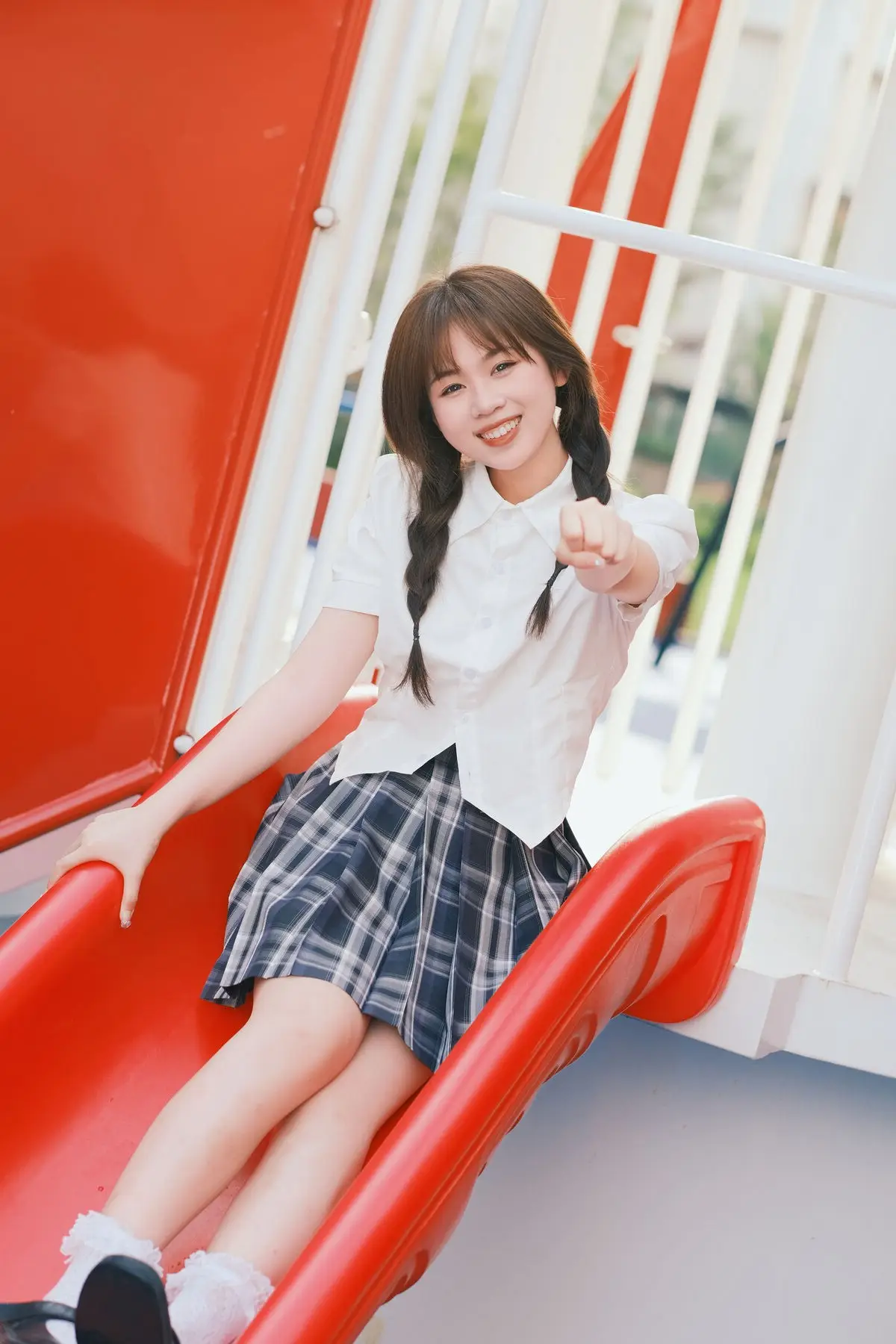 Immerse yourself in the fresh youthful charm of Pao Fu Xiao Fang in her familiar school uniform. With braided hair and a radiant smile, she presents an image full of vitality and innocence. The simple plaid skirt and white shirt exude energy and youthfulness. The colorful playground backdrop, featuring a yellow slide and blue ground, further highlights Pao Fu Xiao Fang's cheerful and carefree spirit. She seems to be waving, inviting us to join in the joyful, energetic atmosphere of youth. The YiTuYu Vol.8569 collection captures this lovely moment.#PaoFuXiaoFang #Schoolgirl #YouthfulVibes #PlaygroundFun #PlaidSkirt