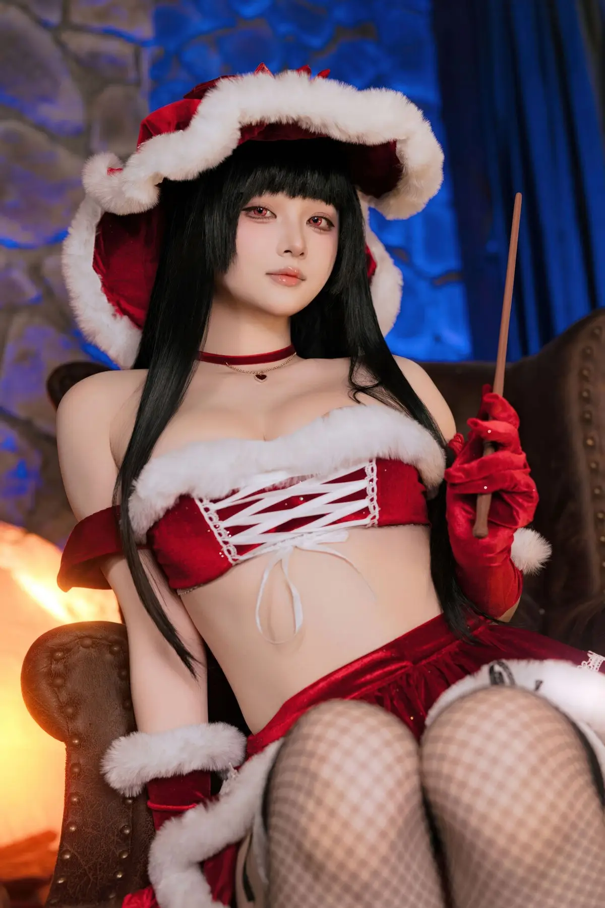 Coser Yu Yu brings an enchanting Christmas Eve Magic to life in this special photo collection. Transformed into a captivating holiday sorceress she poses gracefully by a warm rustic fireplace. Her stylish red and white costume adorned with a fluffy hat and a delicate magic wand creates a look that is both alluring and mysterious. The soft ambient lighting of the cozy stone room perfectly highlights Yu Yu's beauty and the festive atmosphere. Each moment is filled with warmth and romance promising an unforgettable visual experience of a magical Christmas night. Dive into this spellbinding collection.