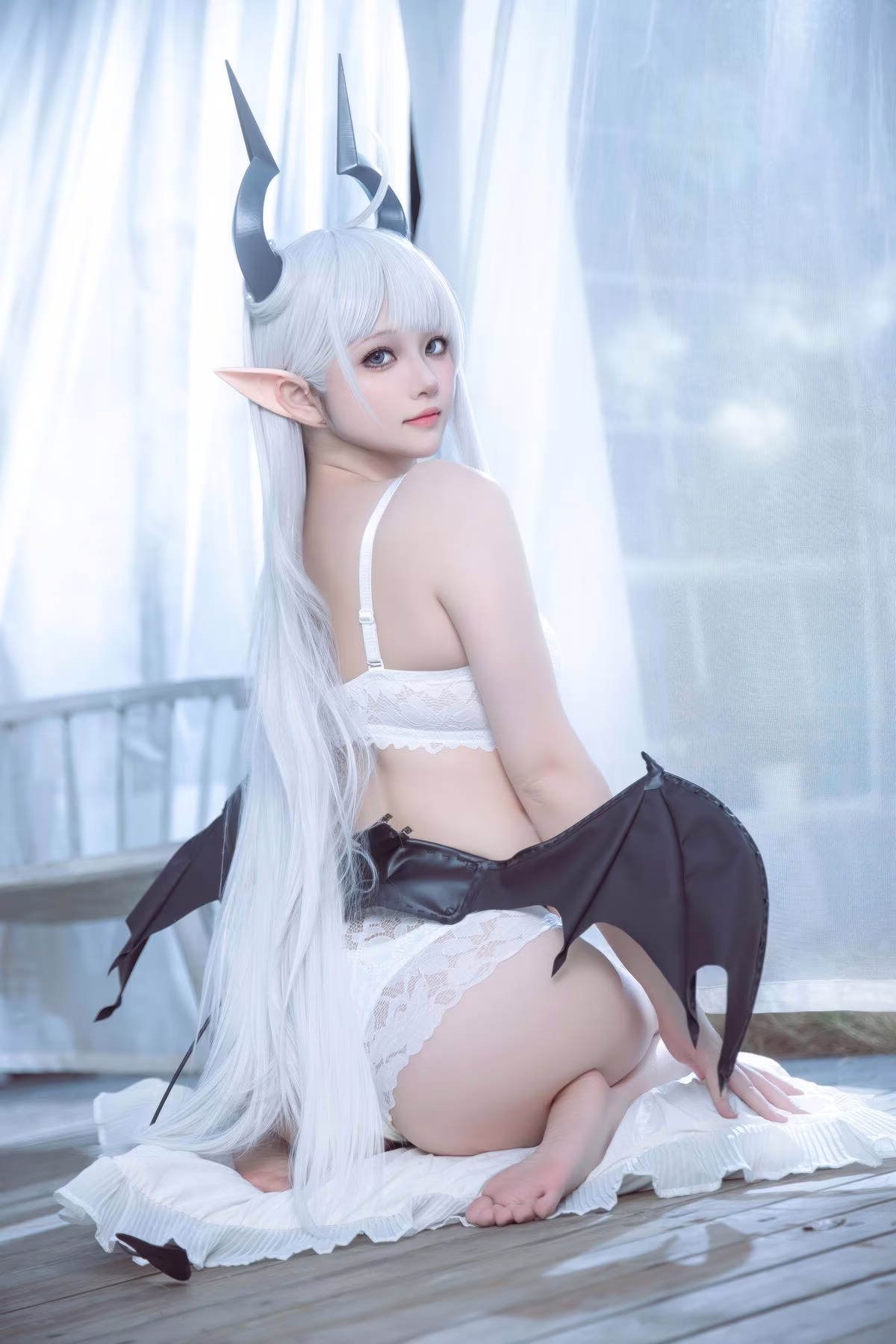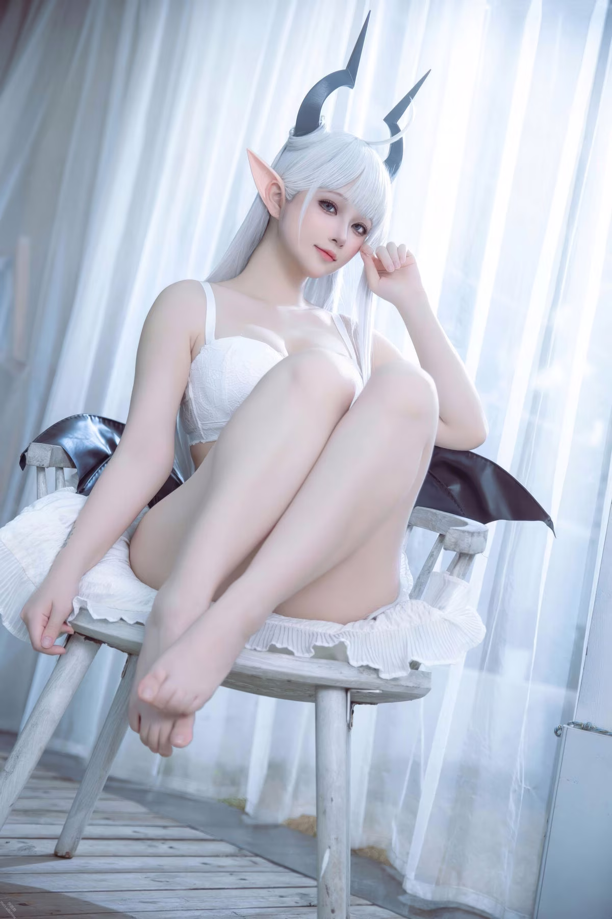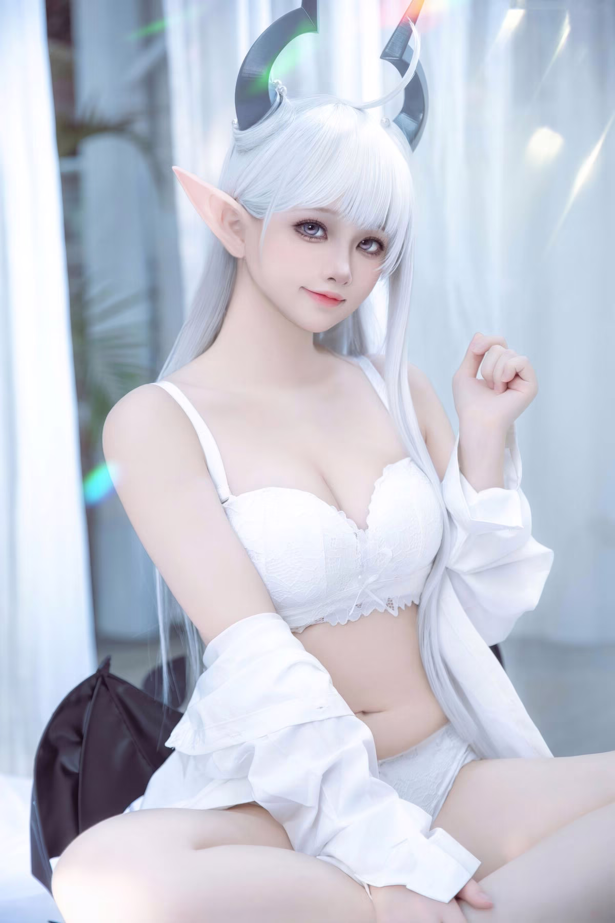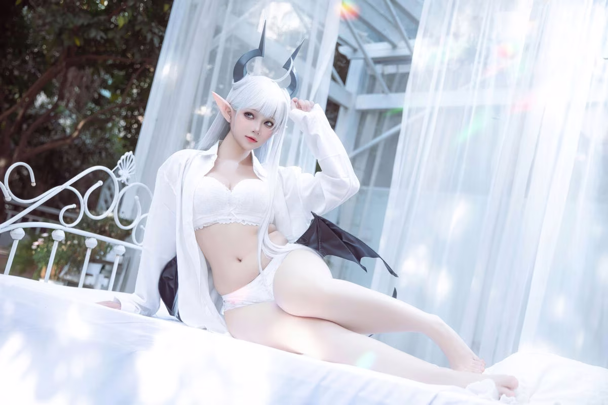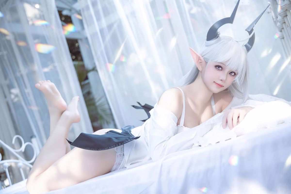Immerse yourself in the enchanting beauty of Coser Yu Yu as she flawlessly embodies Altima Tia. With flowing white hair, delicate elf ears, and elegant horns, she presents a captivating fantasy character, both alluring and ethereal. Her pure white outfit, featuring a chic bra and a light ruffled top, gracefully highlights her slender figure and radiant skin. The deep, expressive eyes and gentle smile create an irresistible charm, drawing viewers into her mystical world. This outstanding cosplay showcases Yu Yu's dedication and talent in bringing the magical essence of Altima Tia to life with stunning precision.