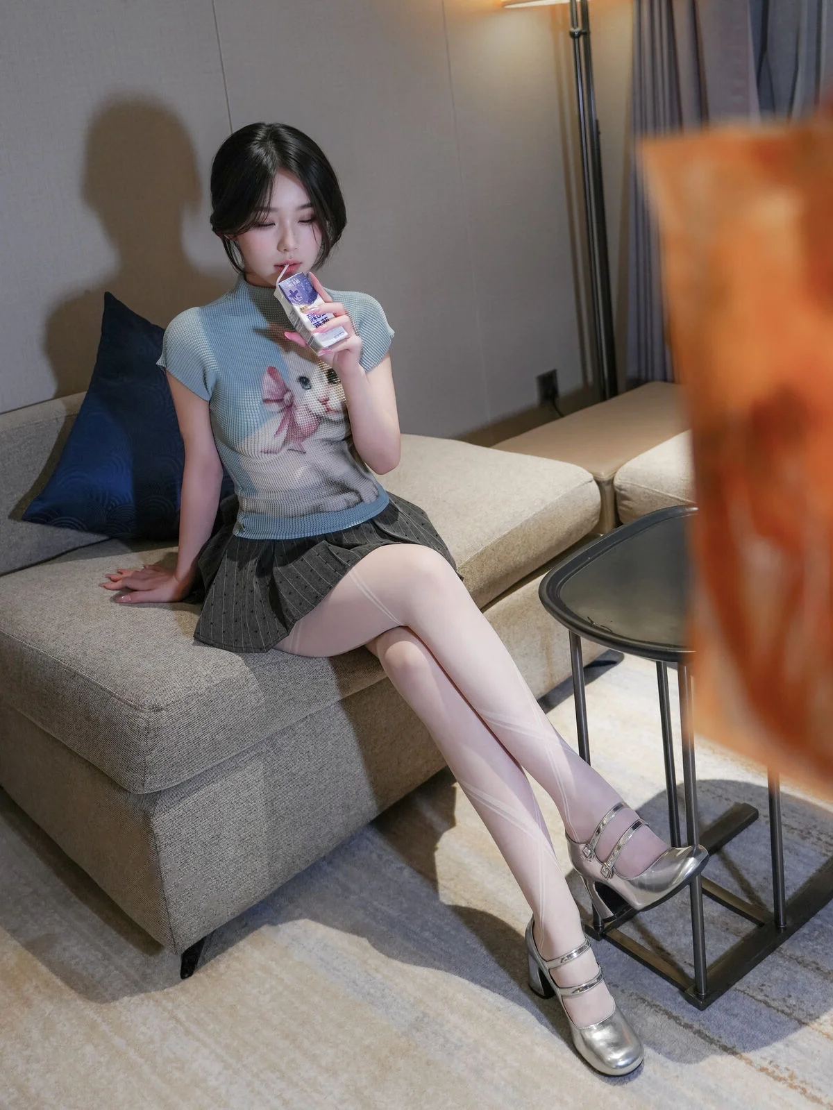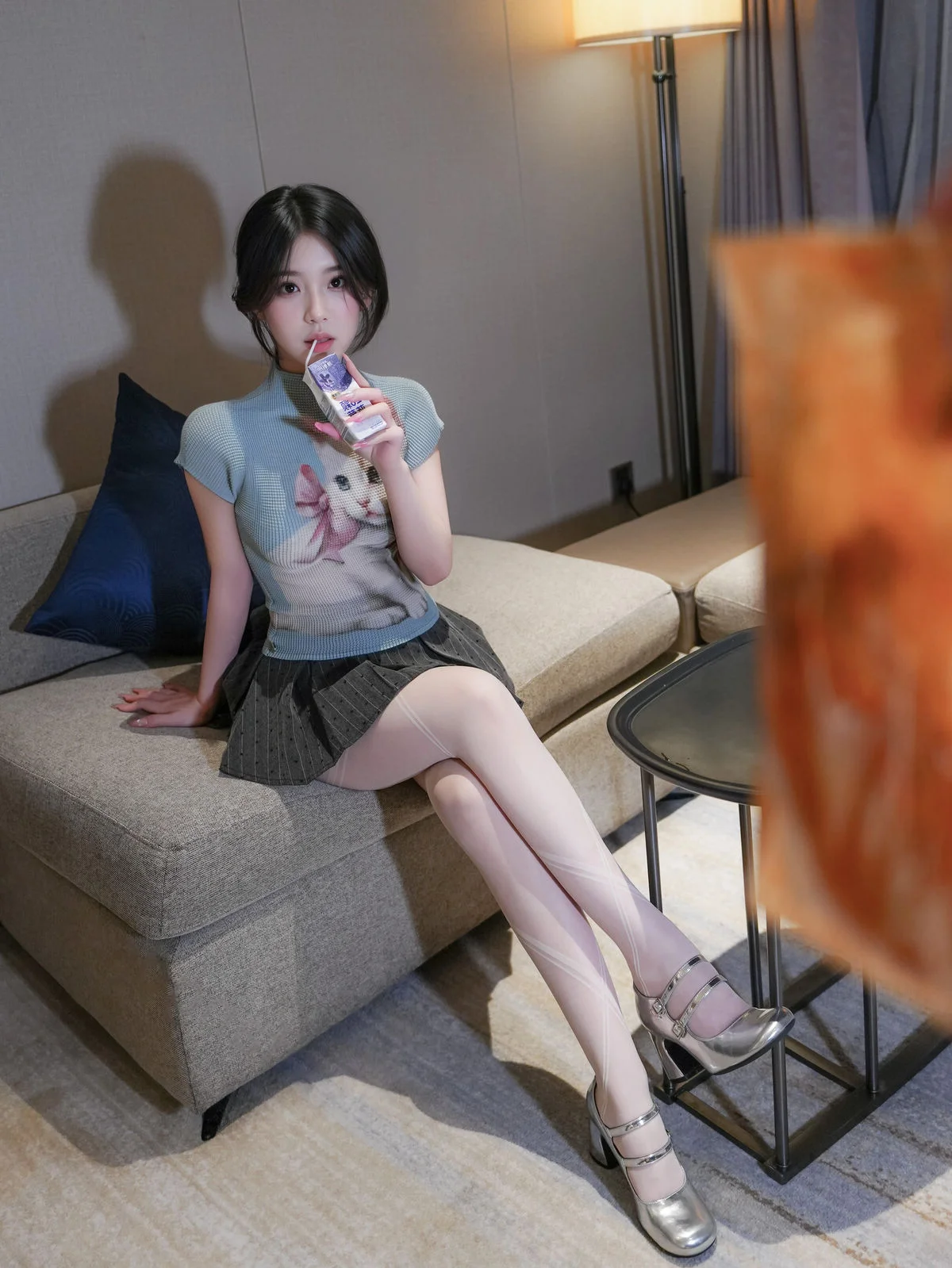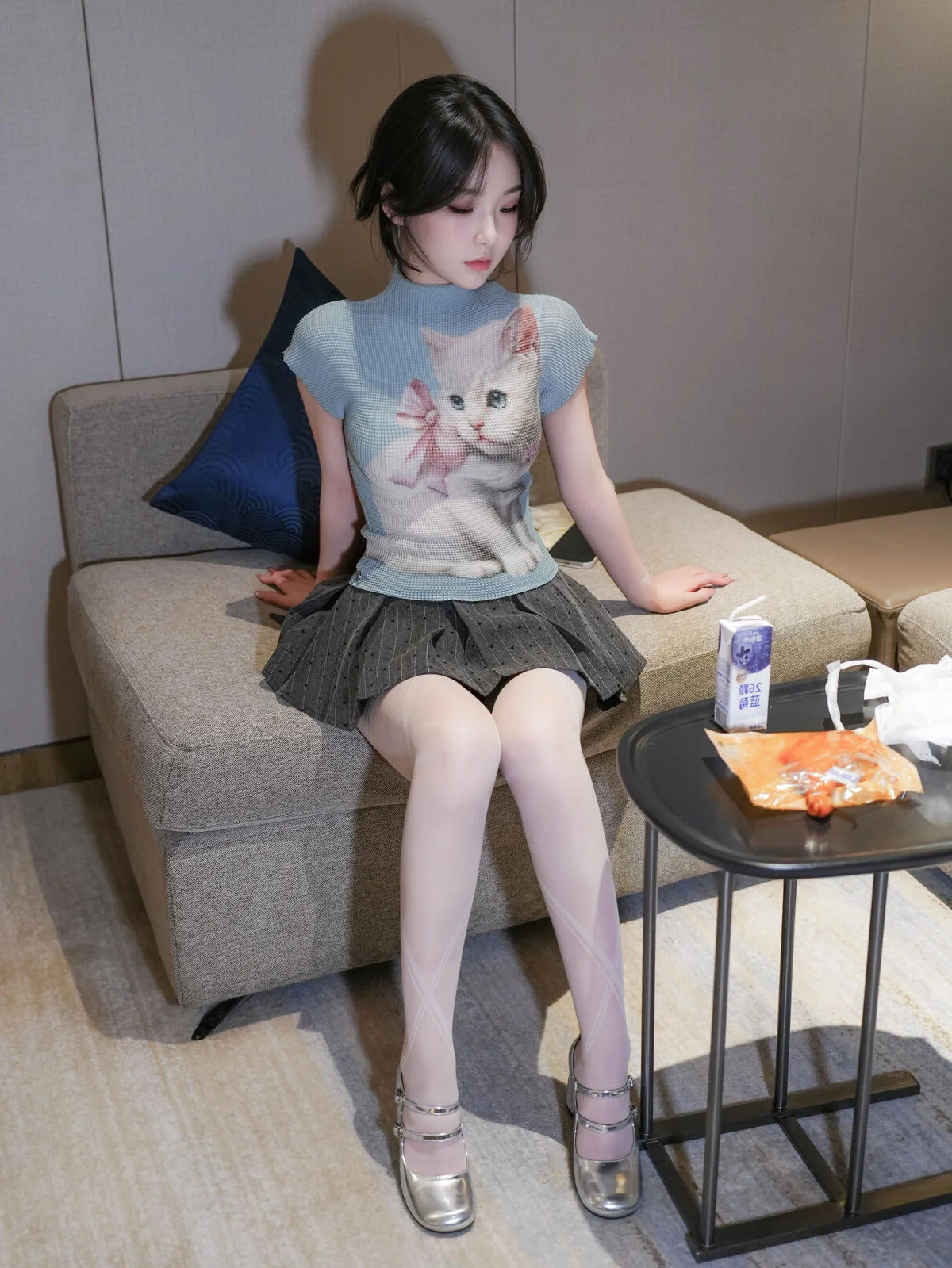 This captivating image captures XiuRen model Zhi Zhi (汁汁) in a wonderfully adorable and authentic moment. With her neat short hair and eyes focused on the snack in her hand, she exudes a natural and approachable beauty. Her light blue top featuring a playful cat print, paired with a stylish pleated skirt, creates a youthful and energetic look. This image truly embodies her endearing nickname, 'the chicken-loving girl,' showcasing her charming and relaxed demeanor in everyday life. It offers a genuine glimpse into effortless beauty, where the simple joy from a snack is enough to light up the entire frame.#ZhiZhi #XiuRen #Model #ChickenLovingGirl #CandidBeauty #NaturalCharm