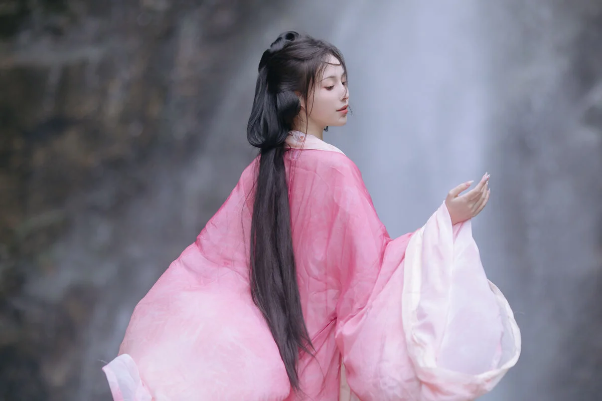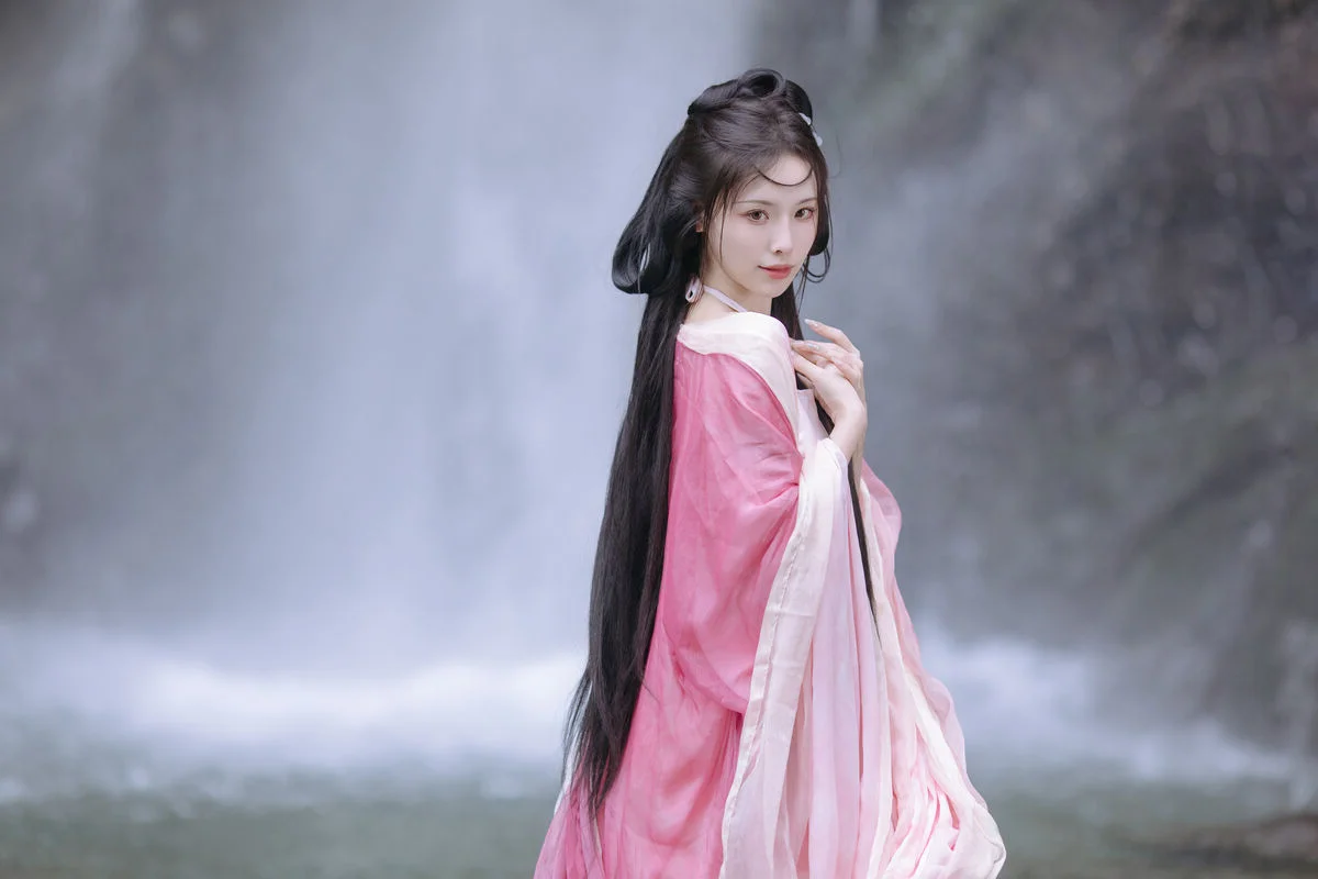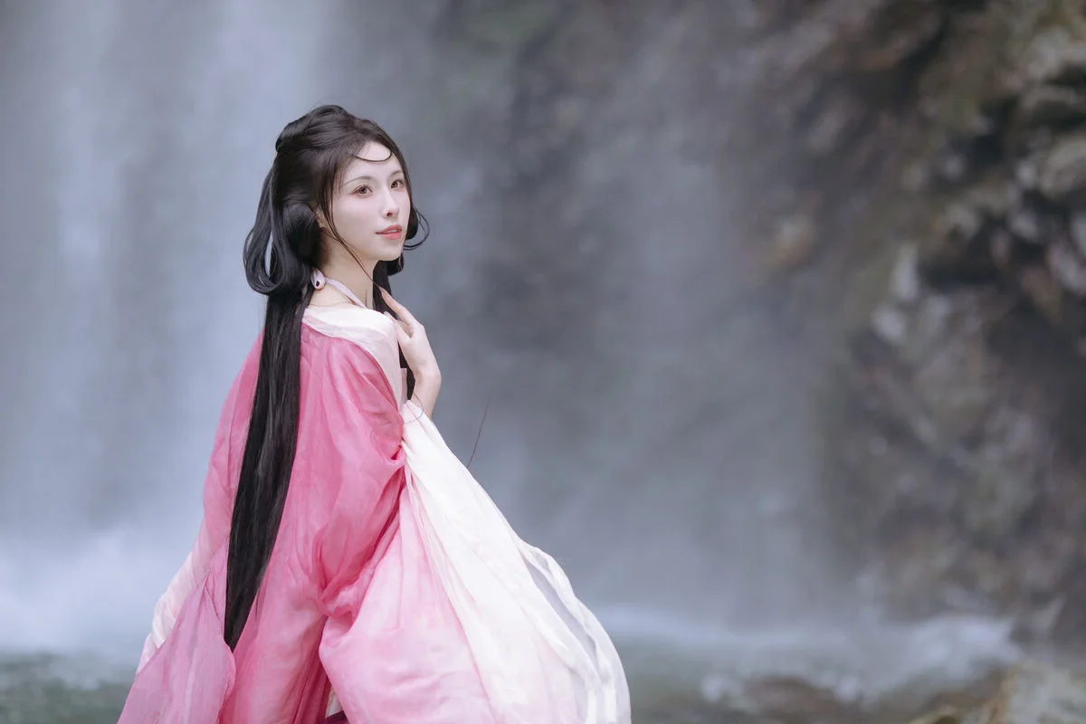 This stunning image features Yi Xiao Zhi Zhi Zhi Zhi adorned in an exquisite pink Hanfu Her beauty radiates grace and elegance Like a celestial maiden descended into a majestic natural landscape The traditional Hanfu gown with its soft gradient pink hues gently embraces her slender figure Creating a harmonious and captivating ensemble In the background a cascading waterfall provides a breathtaking backdrop Highlighting the ethereal charm of the young woman Her dreamy gaze and flowing dark hair further enhance her mysterious and alluring presence This photographic artwork captures an emotional moment Celebrating refined East Asian beauty and the perfect synergy between human and nature A truly poetic and romantic visual It is sure to enchant every viewer YiTuYu Vol8765 proudly presents this photo collection Where beauty transforms into a wordless tale Full of enchantment and mystery#Hanfu #AsianBeauty #Waterfall #YiXiao #ZhiZhi #ArtPhotography
