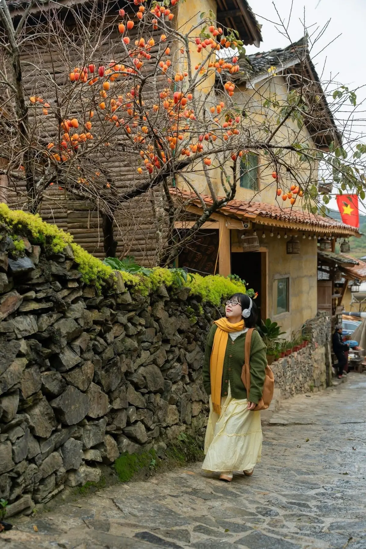 A traveler is immersed in the tranquil atmosphere of Lolo Chai village, where ancient rammed earth houses stand out, especially the heavily laden persimmon tree. This persimmon tree, though poetically called the 'world's most enduring' due to its unique appearance, has become a captivating focal point. The rustic scenery, with moss-covered stone walls and serene yin-yang tiled roofs, paints a poetic picture. More than just a highland check-in spot, it's a place where visitors deeply experience the cultural beauty and simple charm of the Lolo people. In late autumn, when vibrant red persimmons ripen, Lolo Chai beckons travelers to explore and cherish unforgettable moments in the heart of Ha Giang.