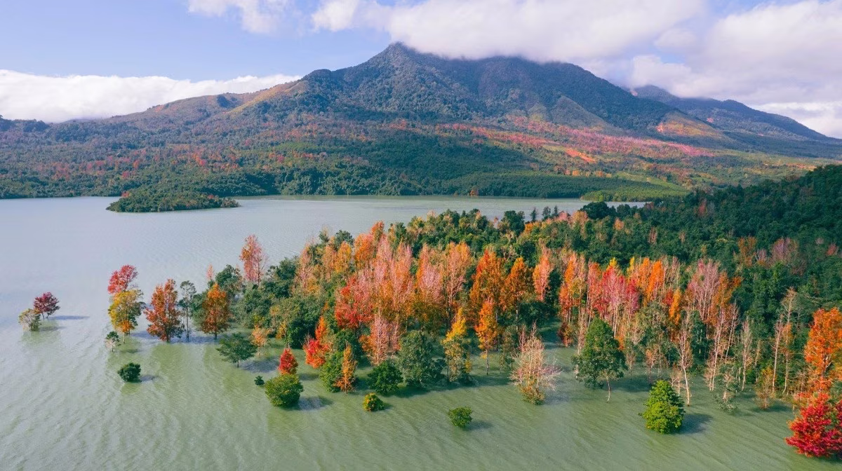 This stunning aerial photograph reveals a unique perspective of the Khe Sanh forest landscape in Huong Phung, where Vietnam's nature adorns itself in a vibrant red leaf season. From above, the canopy of sweetgum trees and other vegetation transforms, creating an impressive multicolored tapestry, blending lush greens, golden yellows, warm oranges, and deep reds. This scene evokes the romantic beauty of European autumn, yet retains the wild, majestic character of Quang Tri's mountains. It is a mesmerizing visual experience, inviting travelers to explore and admire the wonders of creation, a captivating highlight amidst the highlands.