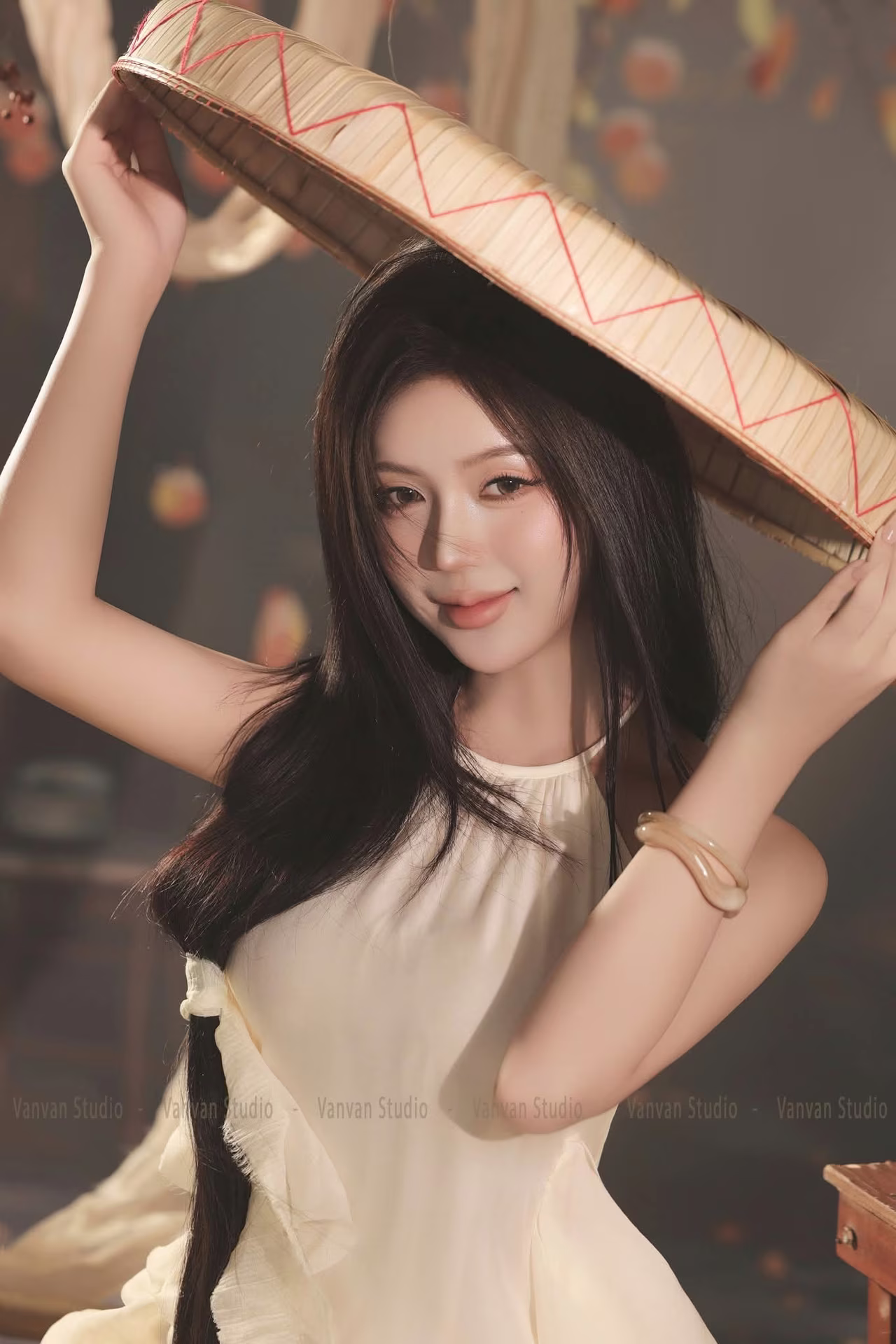 This VGU No31 image showcases the ethereal beauty of an Asian woman dressed in a pristine light-colored gown. She is gracefully seated amidst a romantic autumn setting adorned with branches of ripe persimmons creating a warm and poetic atmosphere. Her gentle gaze and subtle smile exude an aura of elegance and purity. The exquisite high-slit dress accentuates her slender figure and long legs. This scene is a perfect fusion of traditional charm and modern sophistication offering a sense of peace and allure. More than just a photograph it is an invitation to admire the serene beauty of autumn and the human spirit. #Vietnamese #pretty #charm