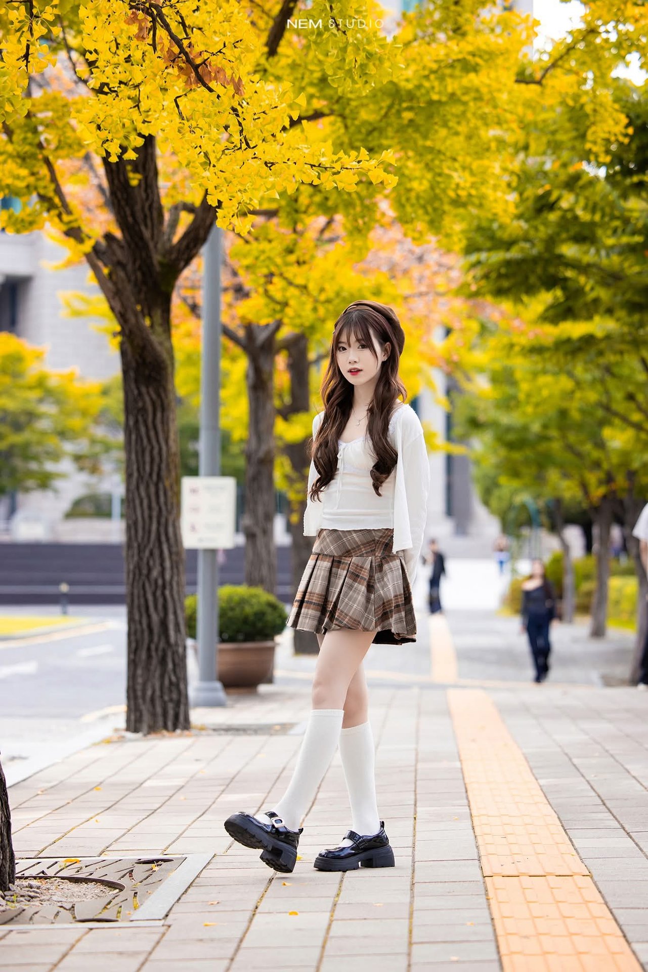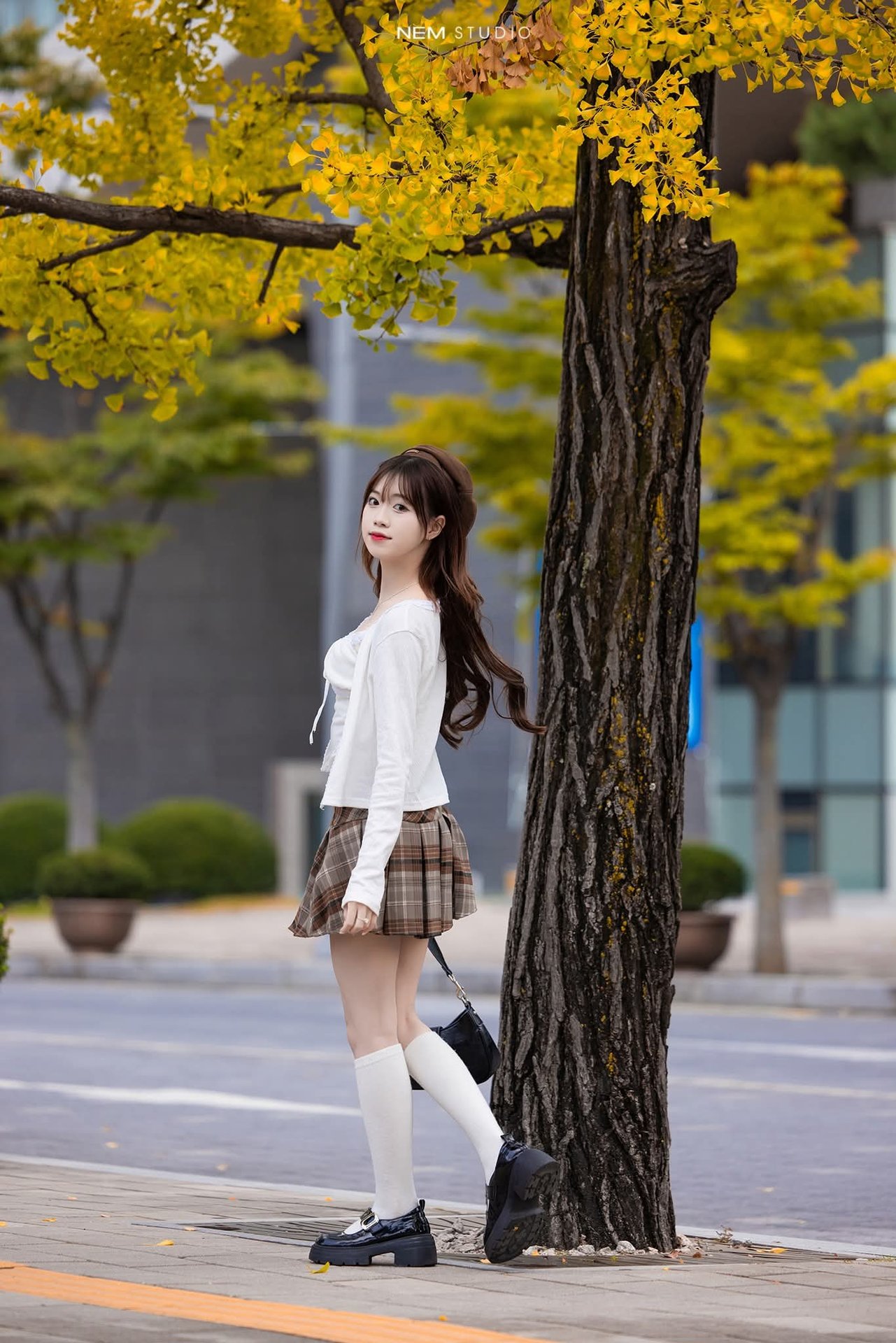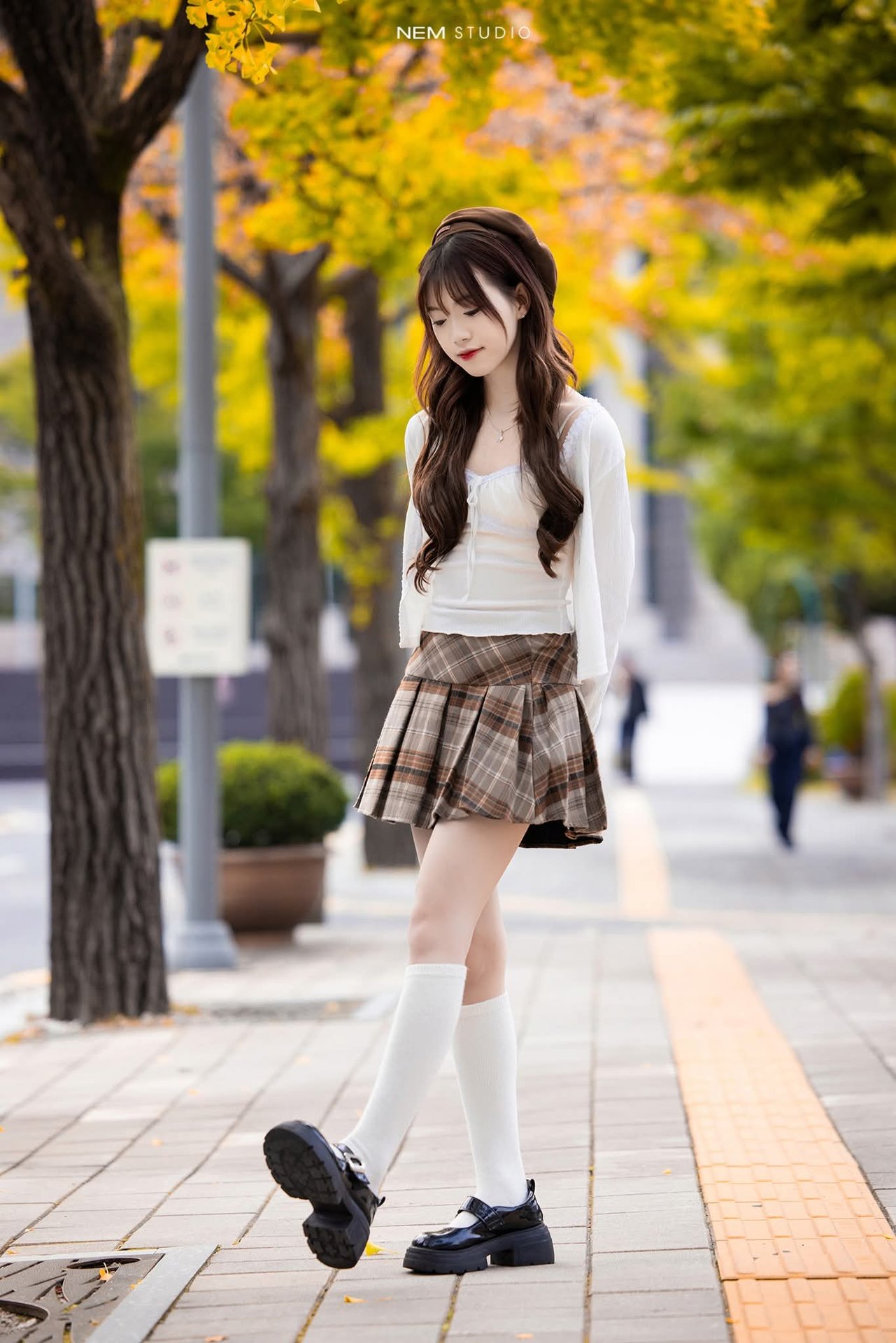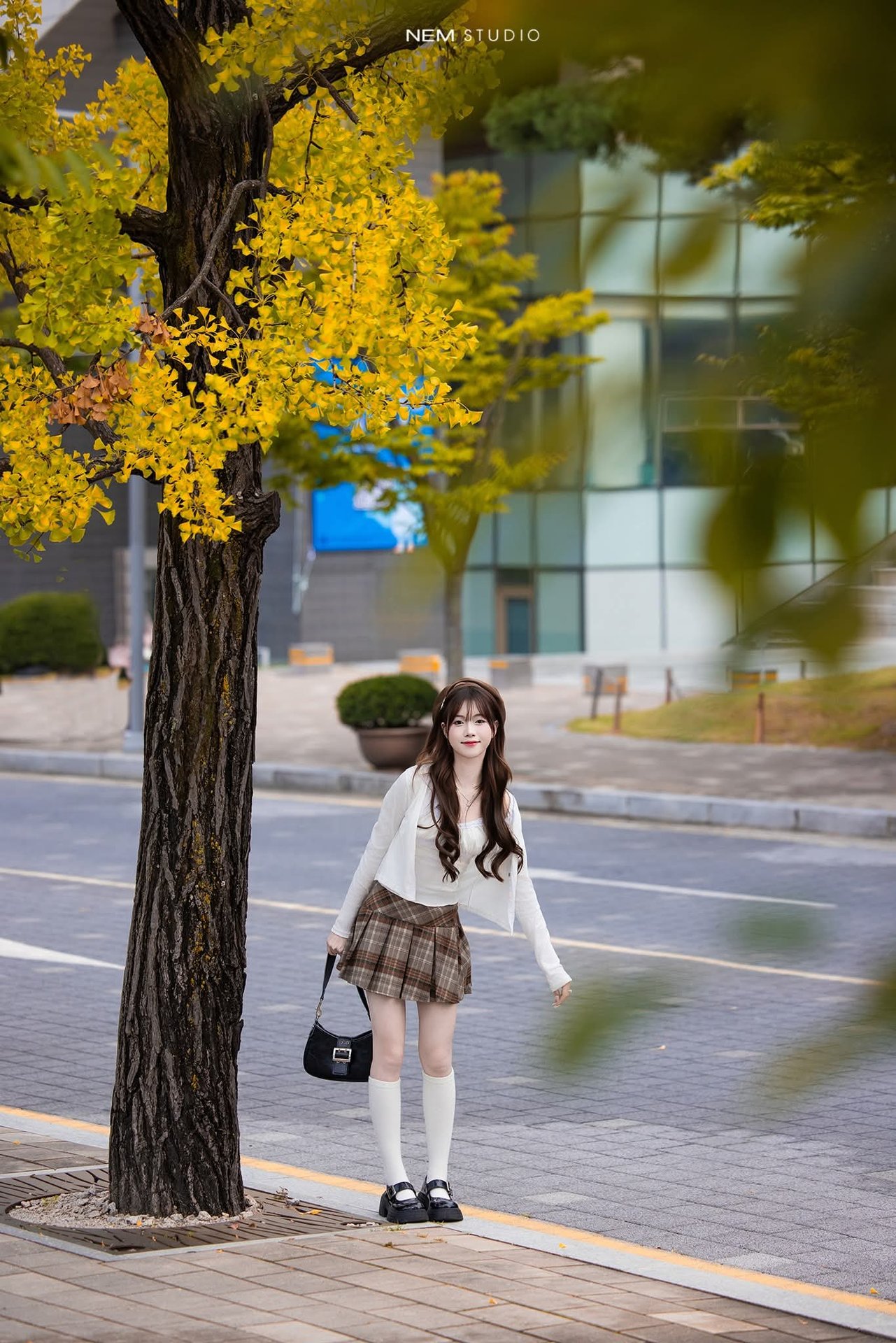 Image 1000018487 captures a young Asian girl exuding elegant and gentle beauty amidst a romantic autumn setting. With her flowing long hair and a charming headband she effortlessly draws attention. Her attire is a perfect blend of a simple white long-sleeved top and a warm brown plaid pleated mini-skirt creating a modern and graceful schoolgirl style. White knee-high socks further enhance her innocent and fresh look. Behind her vibrant yellow leaves on the trees add a poetic touch to the scene imbued with the essence of autumn. This image not only showcases sophisticated fashion taste but also evokes a sense of peace and freshness. She stands as a harmonious focal point creating a captivating and beautiful moment that touches the heart.