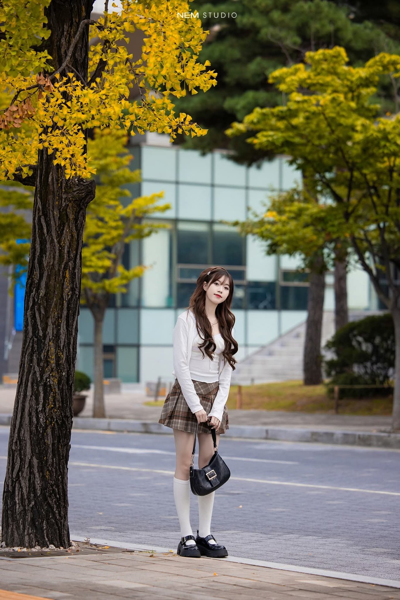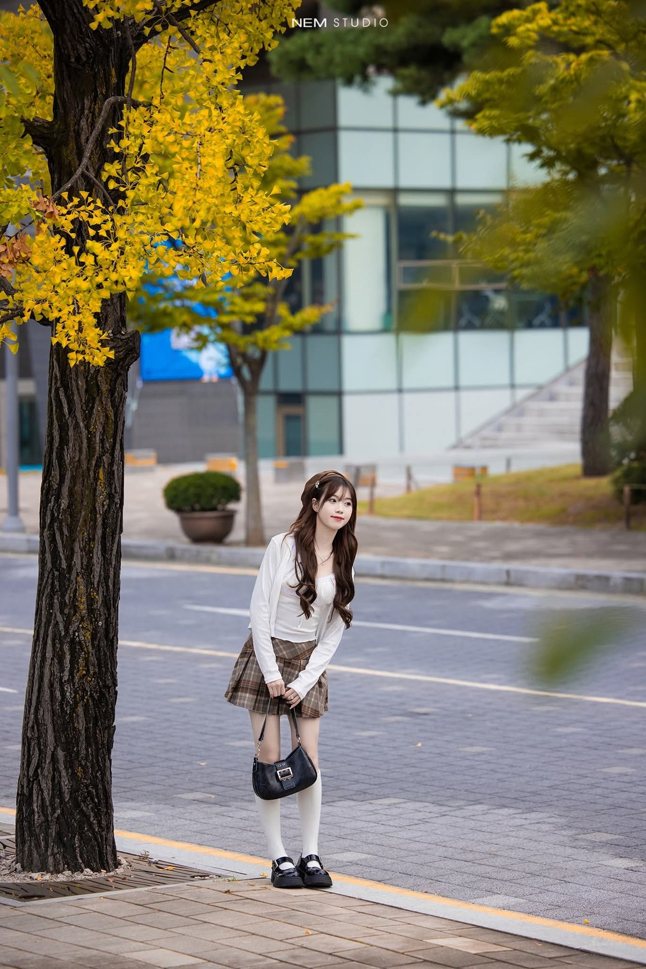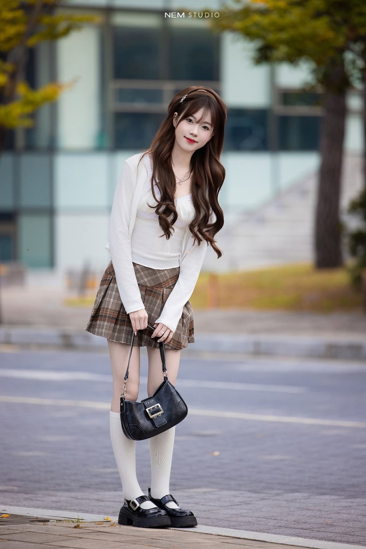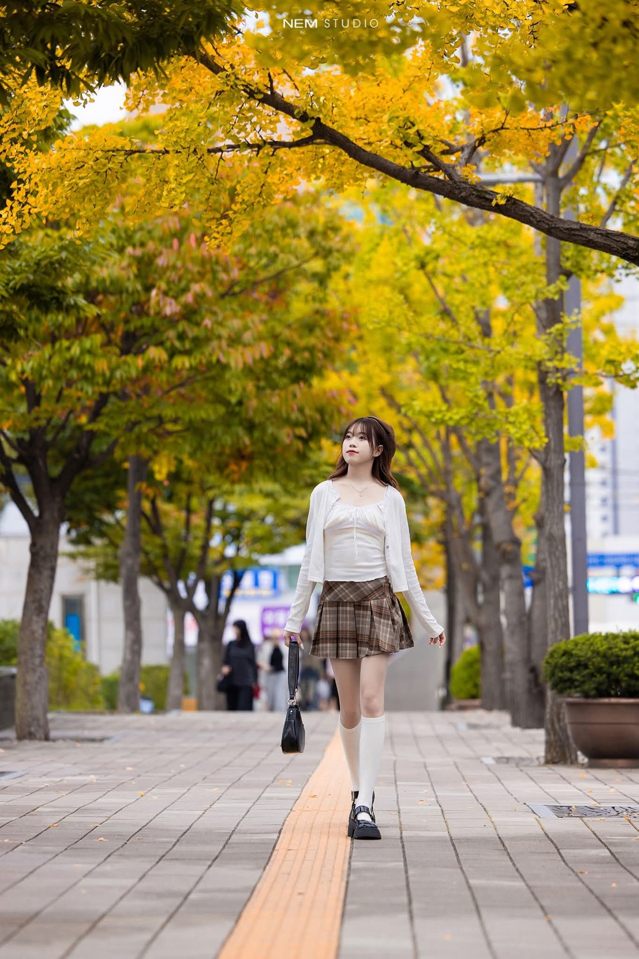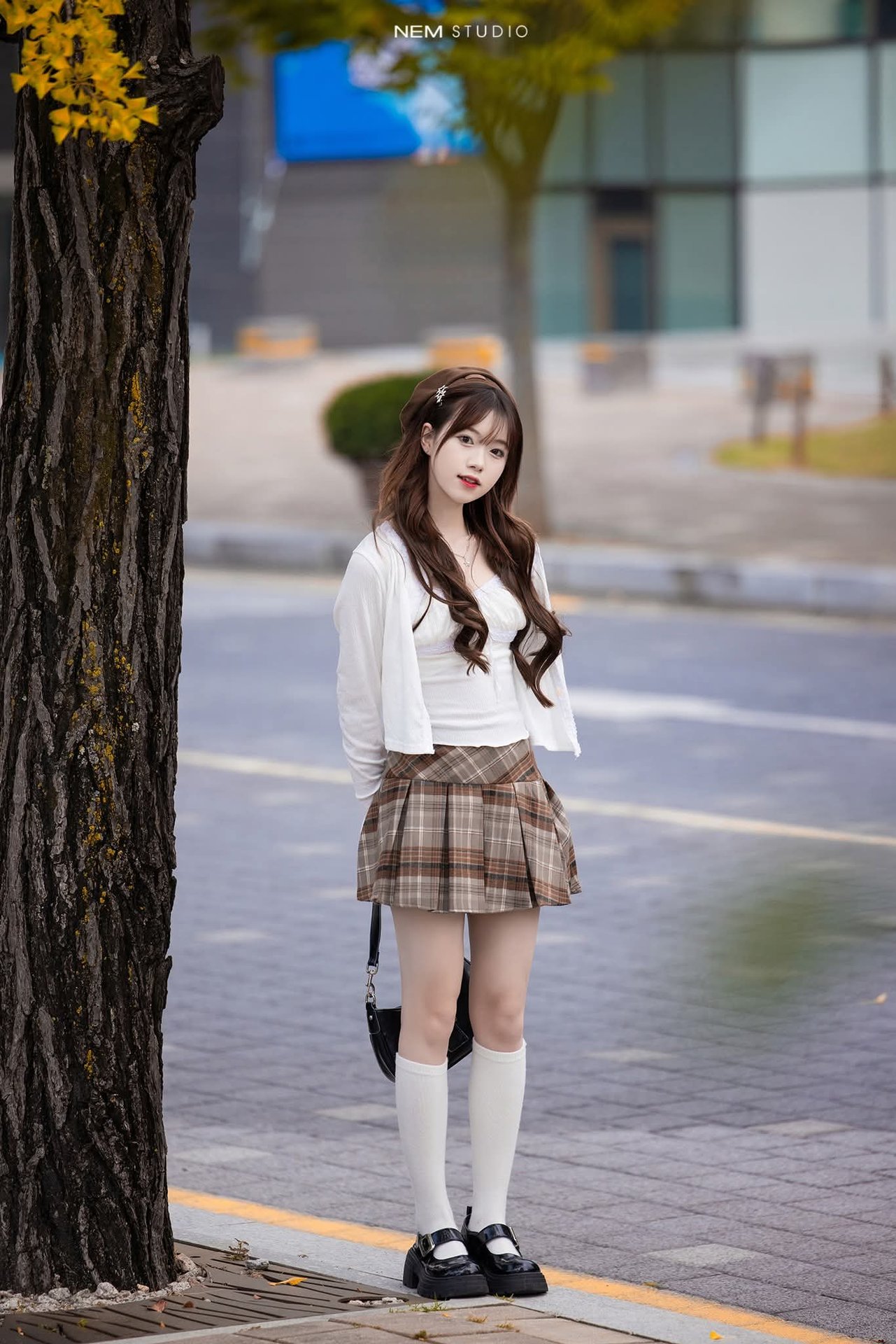 Image 1000018487 captures a young Asian girl exuding elegant and gentle beauty amidst a romantic autumn setting. With her flowing long hair and a charming headband she effortlessly draws attention. Her attire is a perfect blend of a simple white long-sleeved top and a warm brown plaid pleated mini-skirt creating a modern and graceful schoolgirl style. White knee-high socks further enhance her innocent and fresh look. Behind her vibrant yellow leaves on the trees add a poetic touch to the scene imbued with the essence of autumn. This image not only showcases sophisticated fashion taste but also evokes a sense of peace and freshness. She stands as a harmonious focal point creating a captivating and beautiful moment that touches the heart.