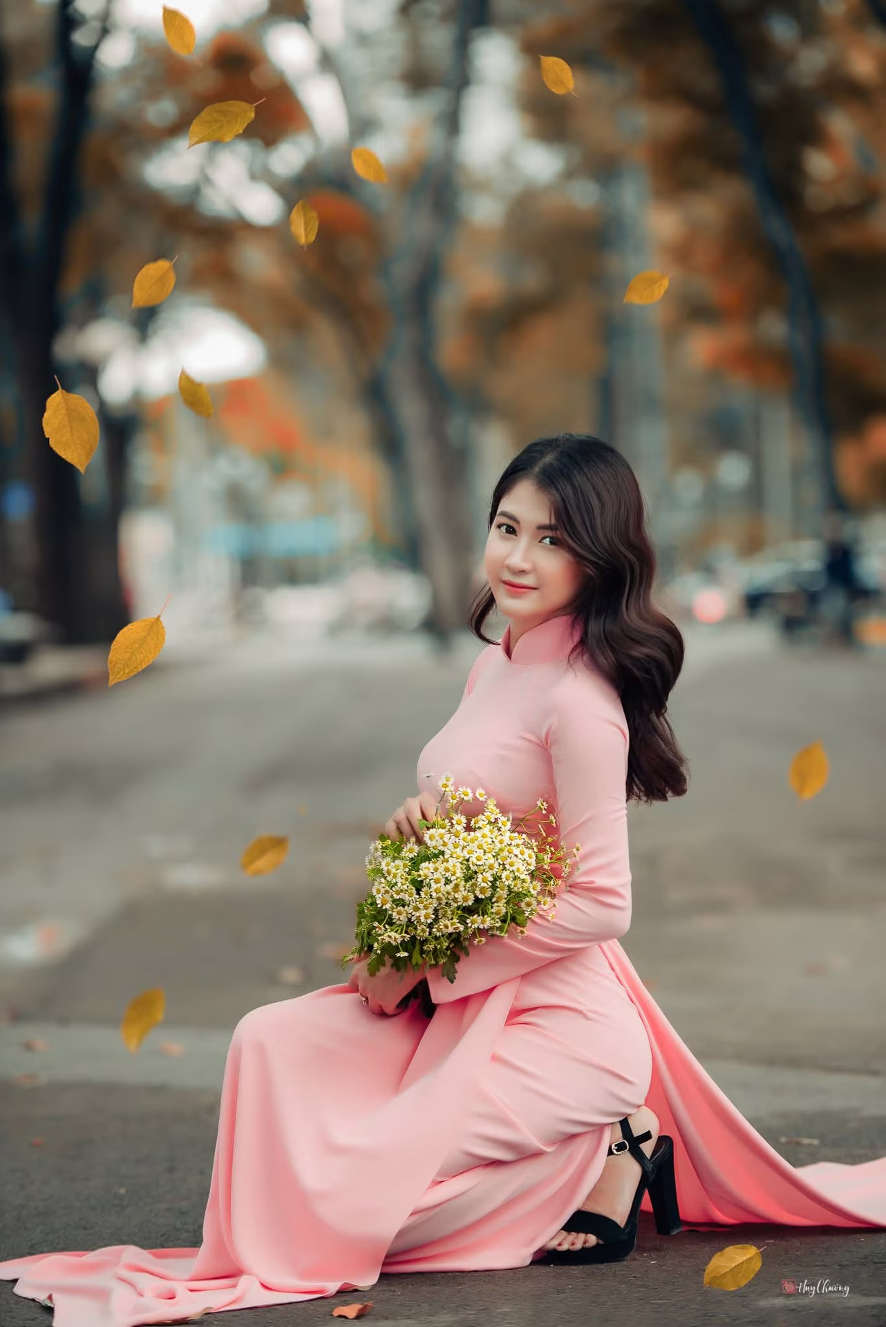 The VGU No20 image captivates viewers with the gentle beauty of a Vietnamese girl in a flowing pink Ao Dai She sits naturally amidst a romantic autumn setting filled with golden falling leaves The traditional Ao Dai gracefully embraces her elegant figure highlighting her charming East Asian features The girl offers a soft smile with kind eyes while holding a vibrant bouquet of fresh flowers This is not merely a beautiful photograph but a harmonious blend of traditional Vietnamese culture and the transitional beauty of nature The image exudes tranquility and sophistication evoking nostalgic feelings of peaceful autumn afternoons This enchanting beauty is sure to leave a lasting impression on all who behold it #Vietnamese #pretty #charm
