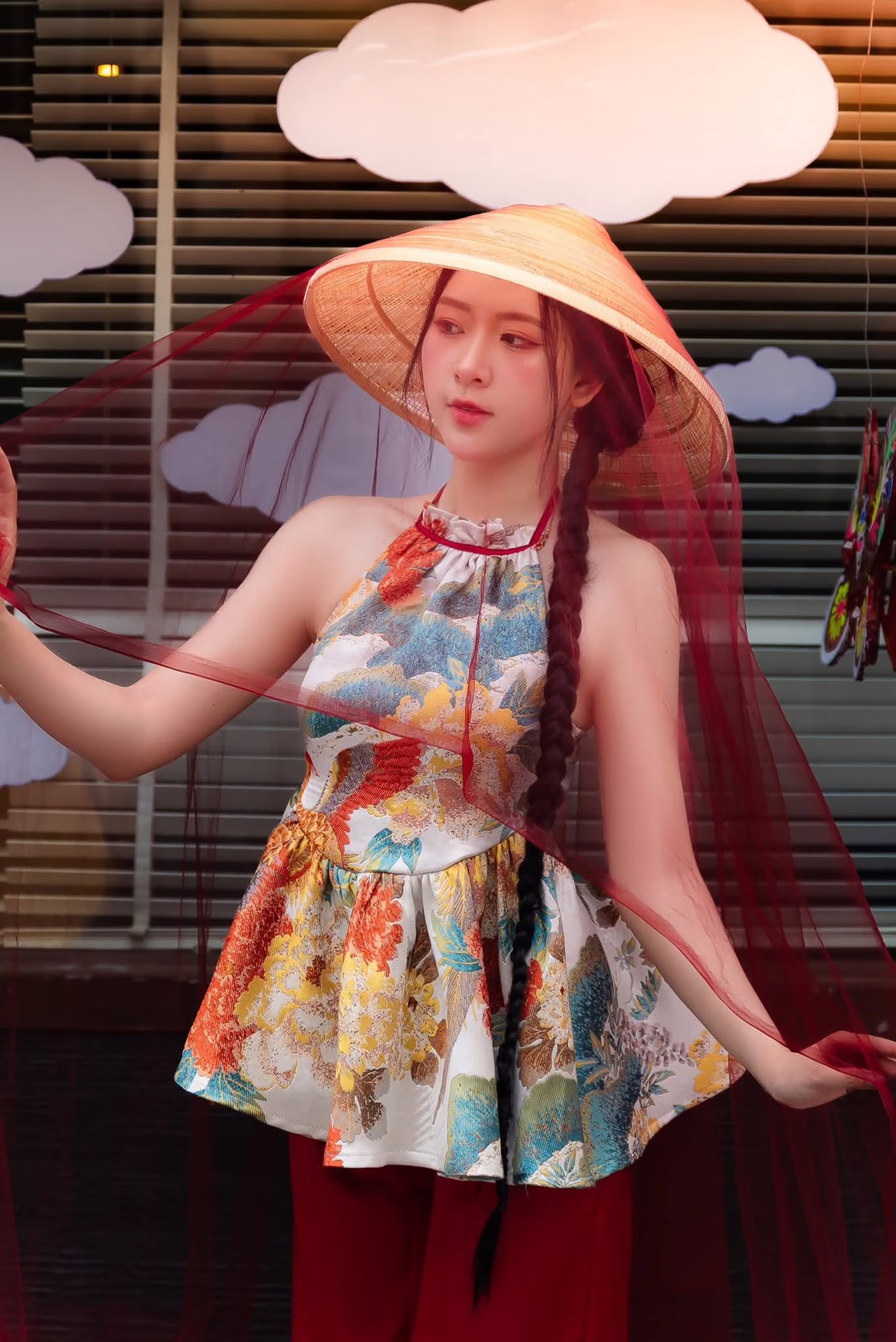 This captivating image beautifully captures the gentle charm and grace of a Vietnamese woman. The young lady with her radiant smile and clear eyes wears a modern interpretation of the traditional Áo Yếm paired with a vibrant patterned skirt blending heritage with contemporary style. An iconic Nón Lá the quintessential Vietnamese conical hat gracefully adorns her head accentuating her delicate features and cultural pride. Her long lustrous hair is neatly styled into a classic braid enhancing her elegant and demure appearance. More than just a portrait this photograph celebrates the timeless beauty of Vietnamese culture showcasing a harmonious fusion of tradition and modern aesthetics. This graceful portrayal is sure to enchant anyone captivated by Asian culture and its profound beauty. #Vietnamese #pretty #charmĐông Hoàng