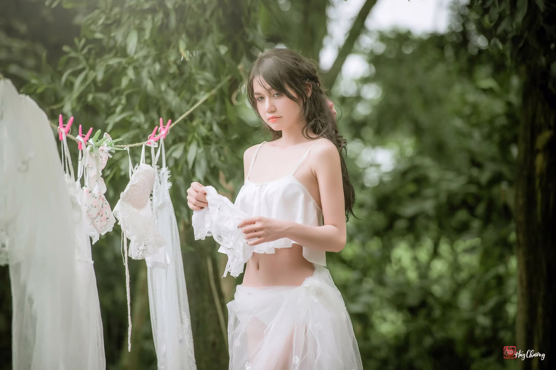 VGU No.95: Gentle beauty of a Vietnamese young woman in a pure white lace dress amidst nature.