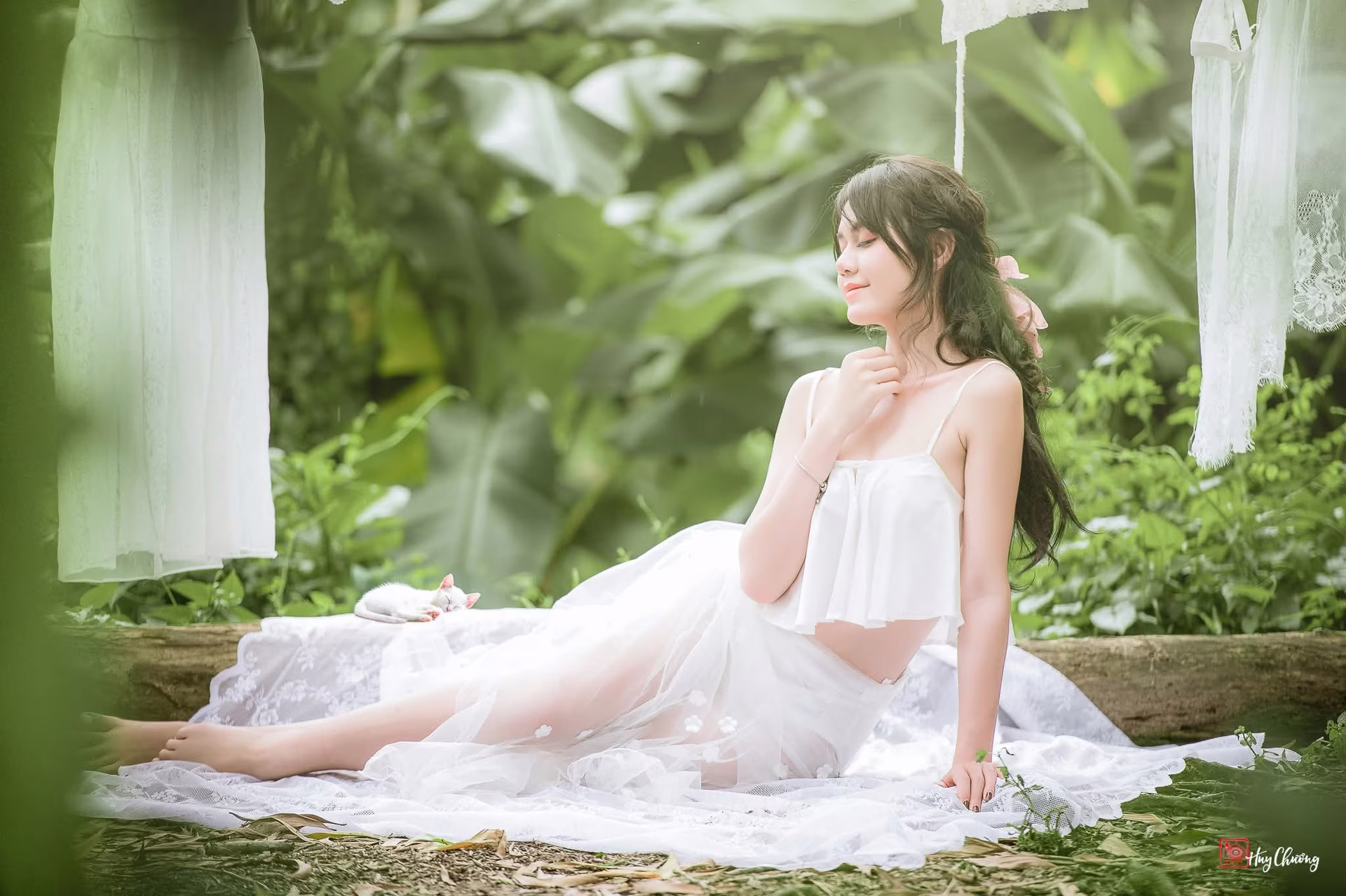This captivating image portrays the pure and delicate beauty of a young Asian woman amidst the lush embrace of a natural garden. Dressed in a flowing white garment she reclines gracefully on a pristine white fabric against a backdrop of vibrant green foliage. Her gentle gaze downwards creates a moment of quiet introspection and ethereal charm. The verdant surroundings provide a perfect natural canvas enhancing her serene presence and delicate allure. Soft natural light bathes the scene evoking a sense of tranquility and peace. It is a deeply emotional and poetic portrayal celebrating natural elegance and timeless grace. #Vietnamese #pretty #charmĐông Hoàng
