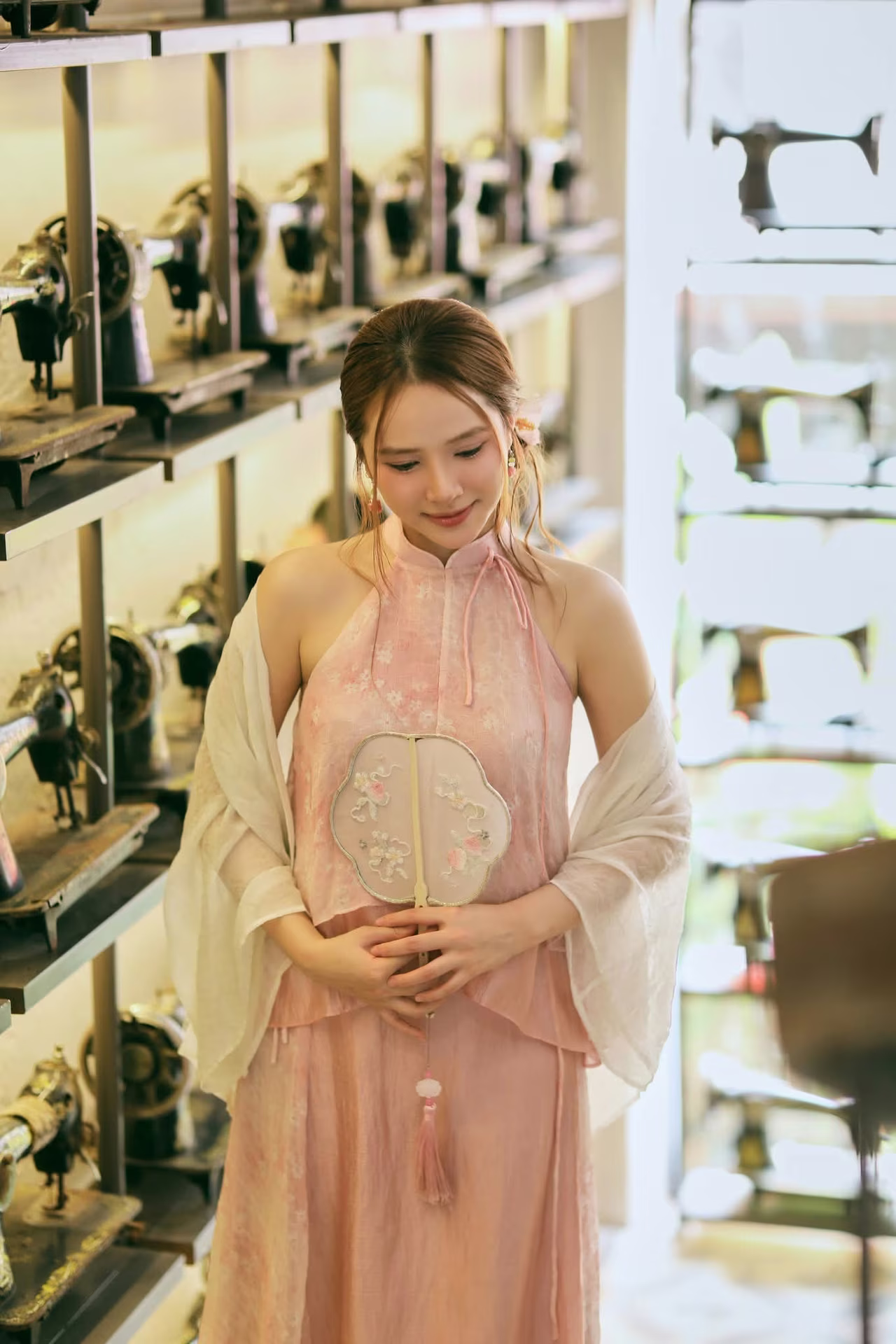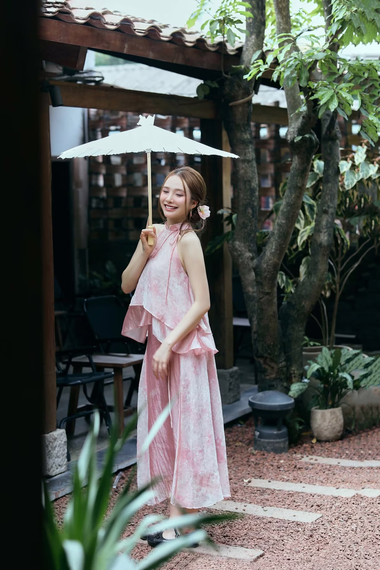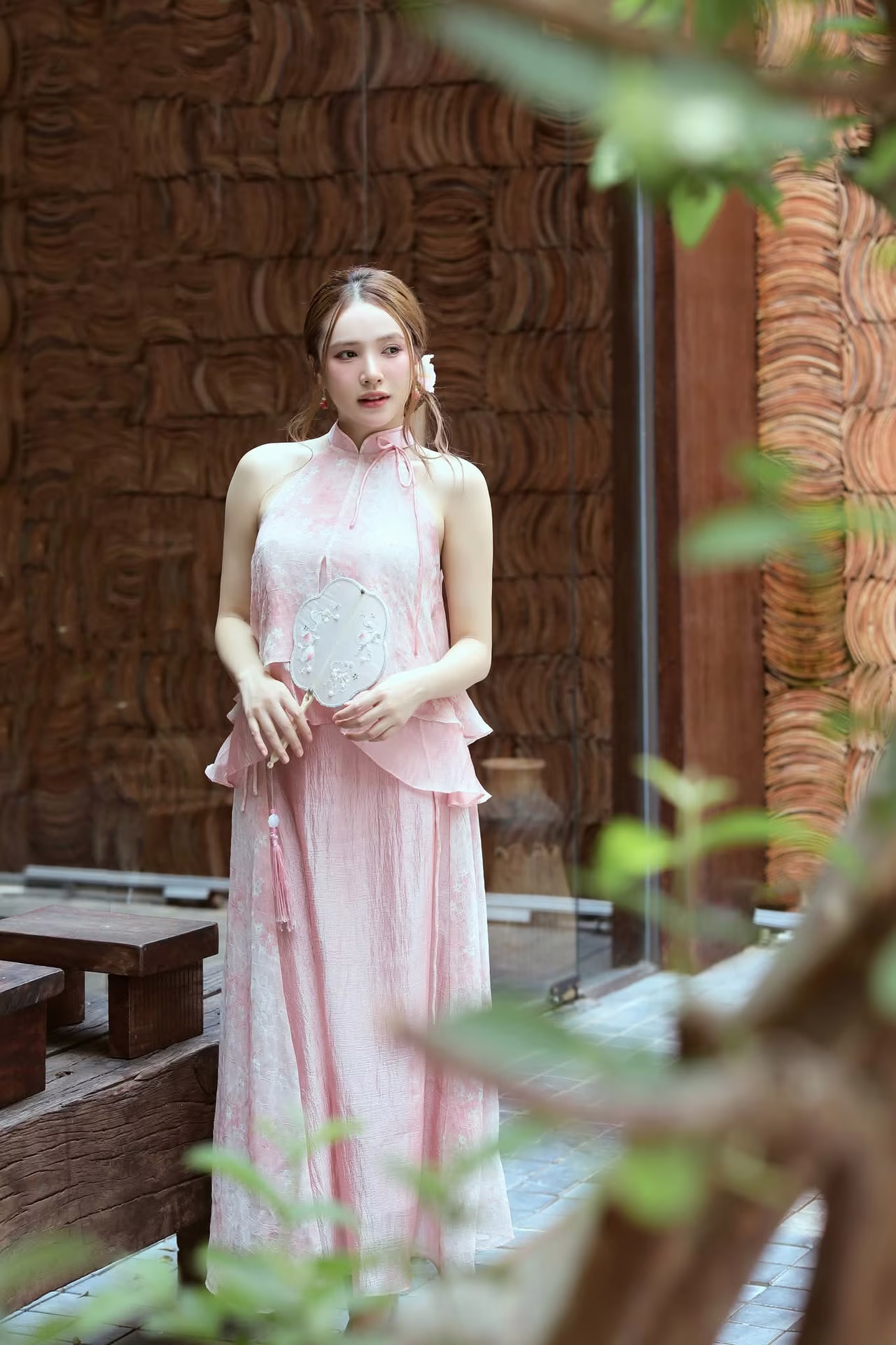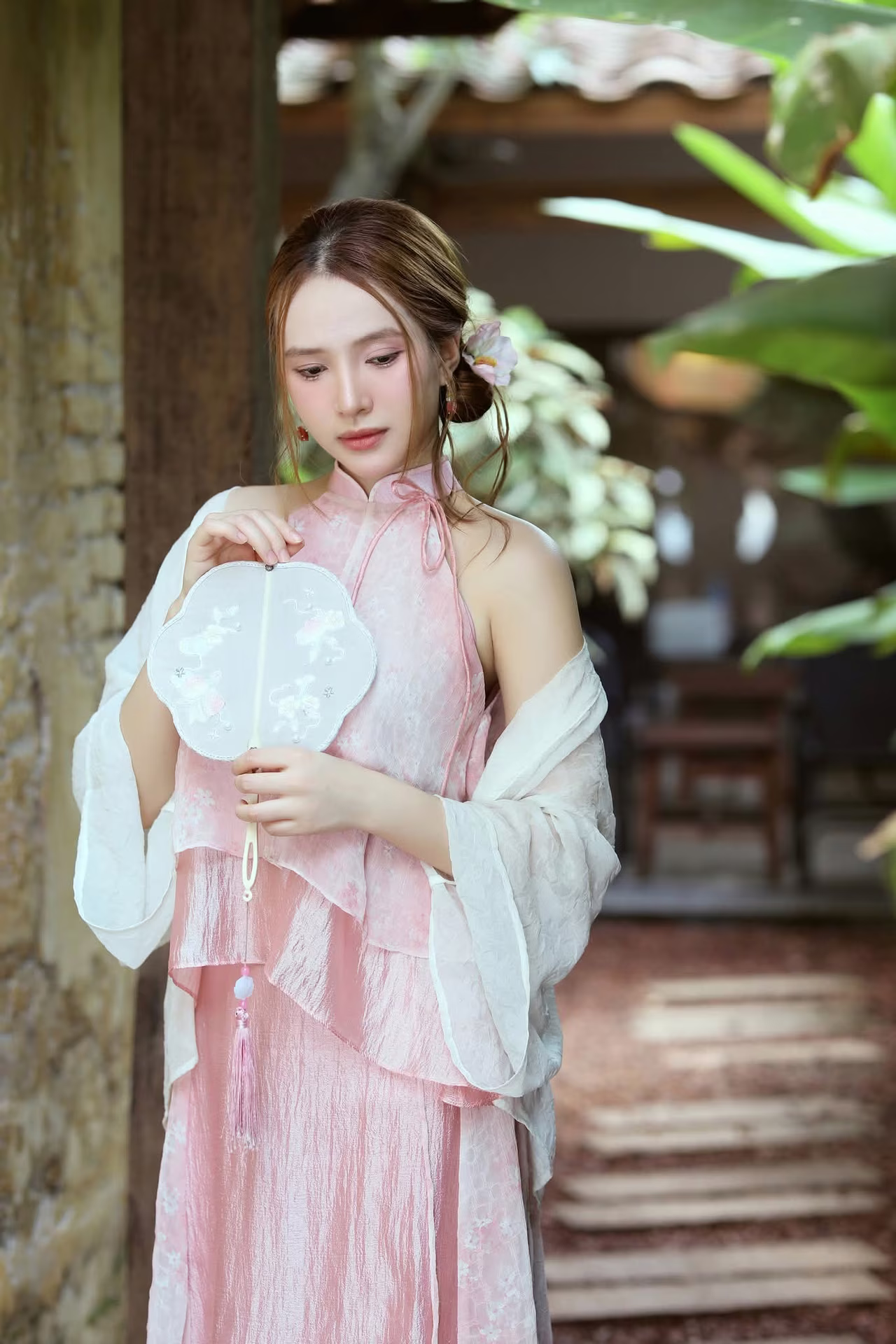 The image VGU No.107 beautifully captures an Asian muse with a delicate, gentle, and utterly captivating charm. The young woman is adorned in an outfit inspired by traditional aesthetics, featuring soft pastel pink layers complemented by a pure white sheer shawl, creating an ensemble that is both graceful and elegant. Her flowing brown hair is subtly embellished with a pristine white flower, while a cherry blossom patterned paper fan held gently in her hand further enhances her classic and romantic allure. Her dreamy gaze, directed softly into the distance, suggests she is lost in poetic thought, evoking a sense of peace and enchantment. Her pure and ethereal beauty seems to blend seamlessly with the lush green backdrop, forging an artistic moment rich in emotion and captivating appeal, leaving viewers utterly mesmerized. #Vietnamese #pretty #charm