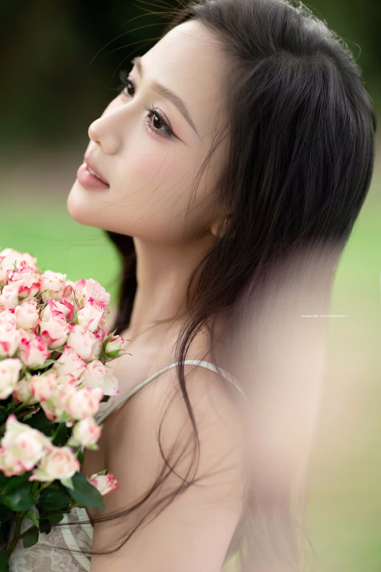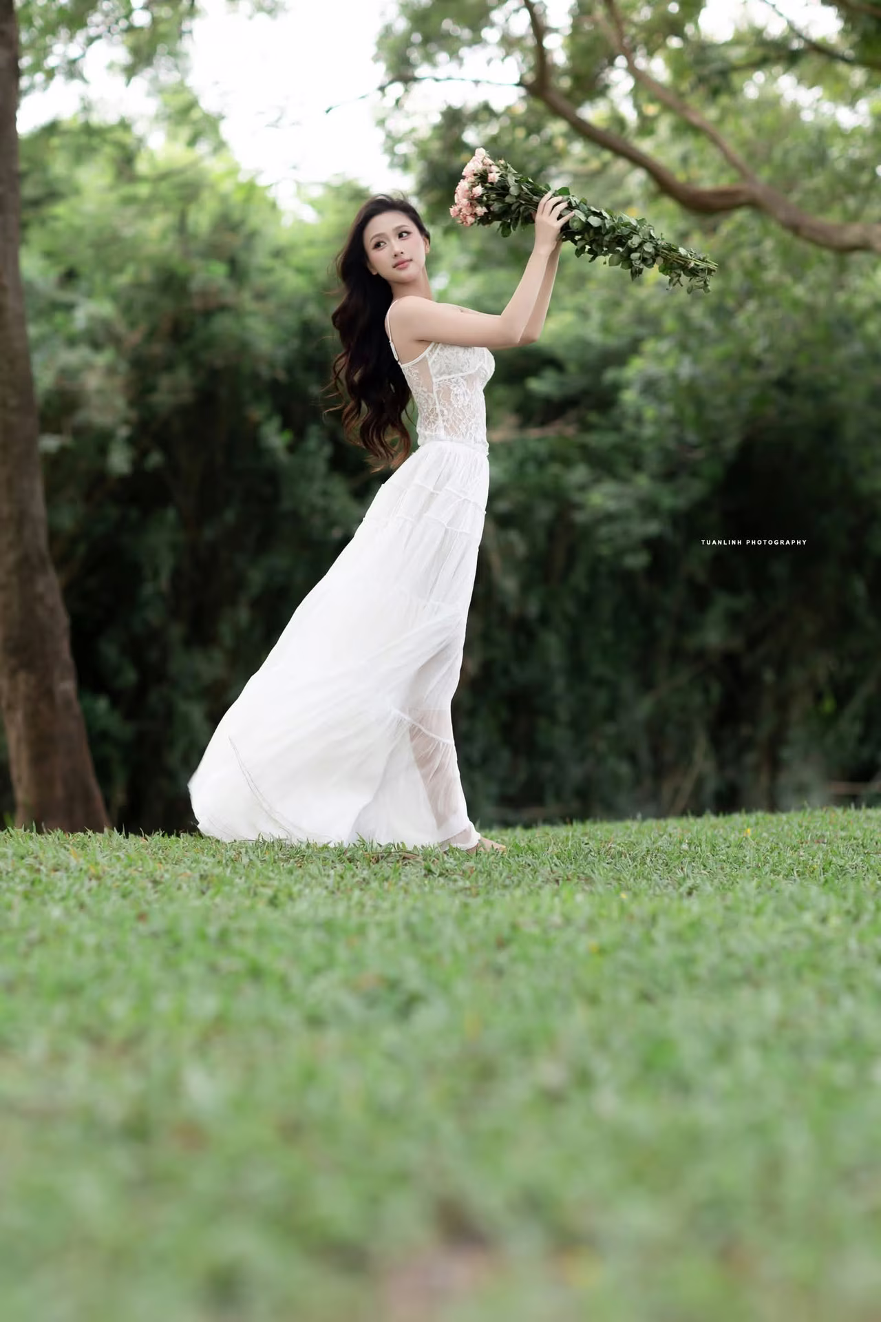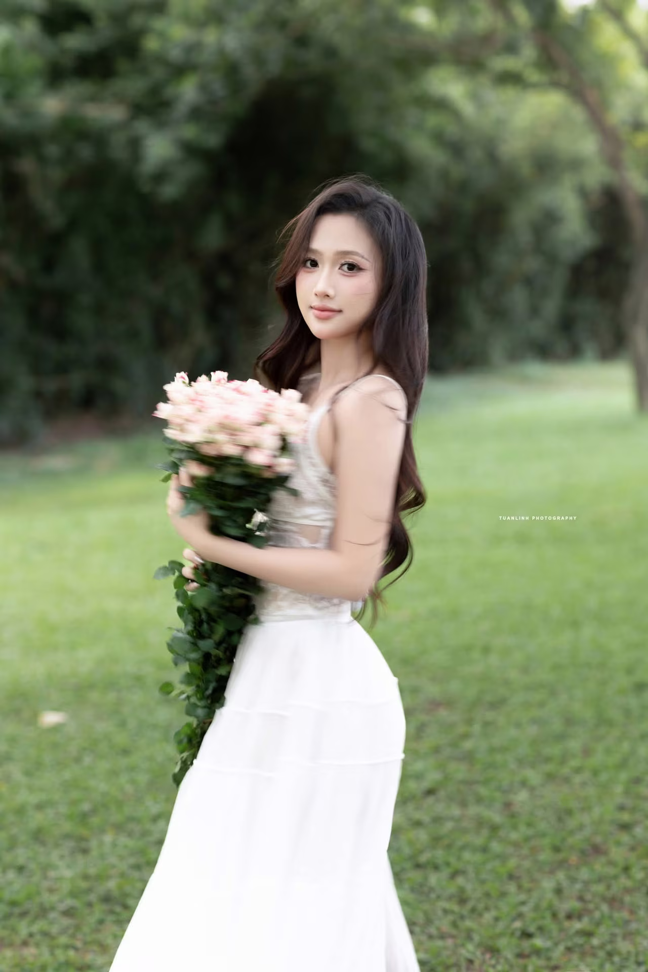 The VGU No.98 image captures the gentle and elegant beauty of a vibrant young woman. Dressed in a pristine white gown she exudes grace and sophistication. Her long flowing hair and soft smile create a captivating aura. She stands beside a vase of lush fresh flowers with blooming pink roses evoking freshness and romance. The entire scene is delicately arranged against an artistic backdrop highlighting the subject's natural beauty and luxurious fashion style. This image embodies pure femininity and the harmonious blend of human elegance with natural splendor. #Vietnamese #pretty #charmĐông Hoàng