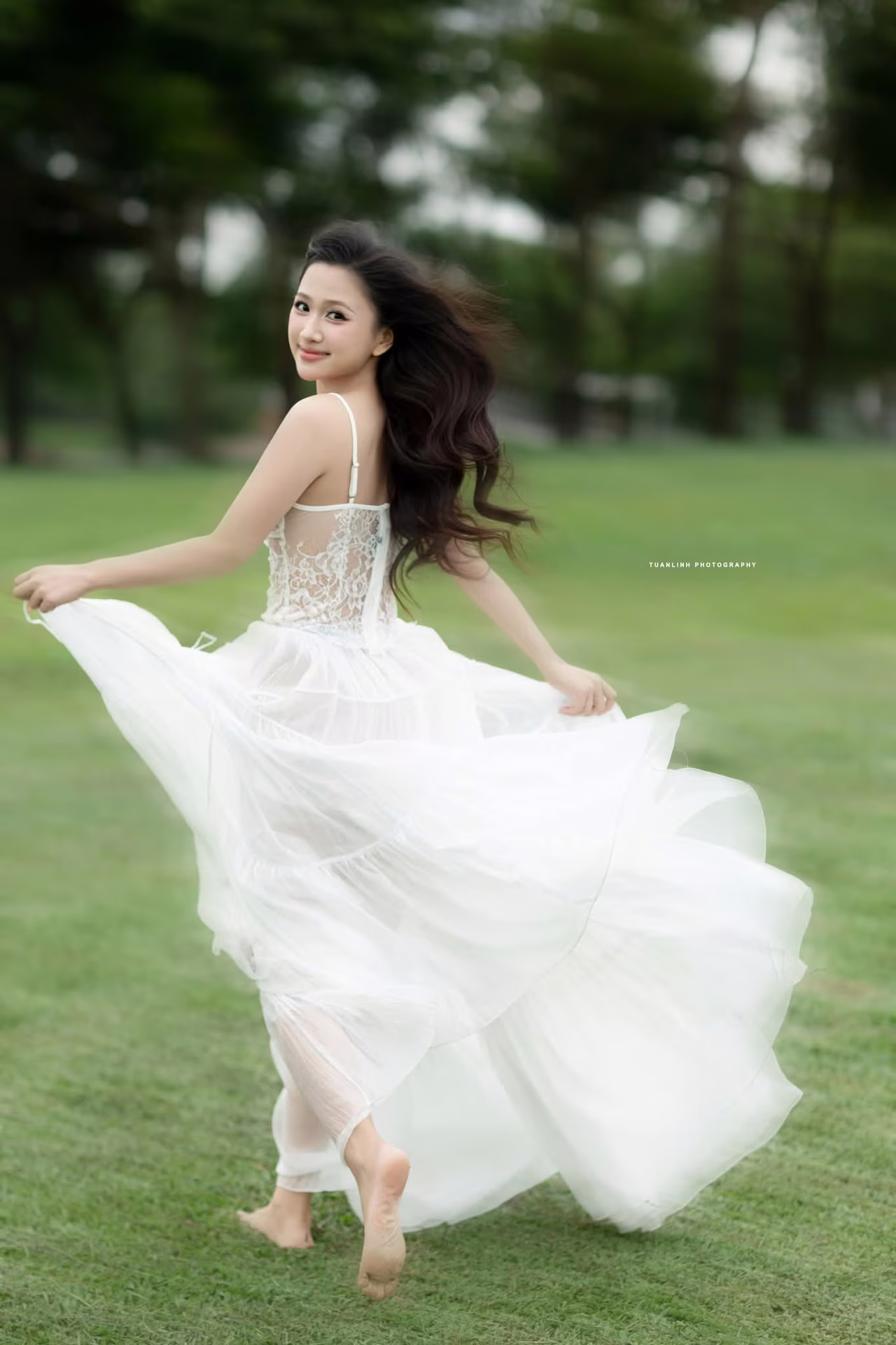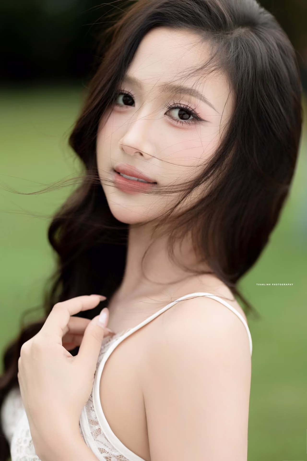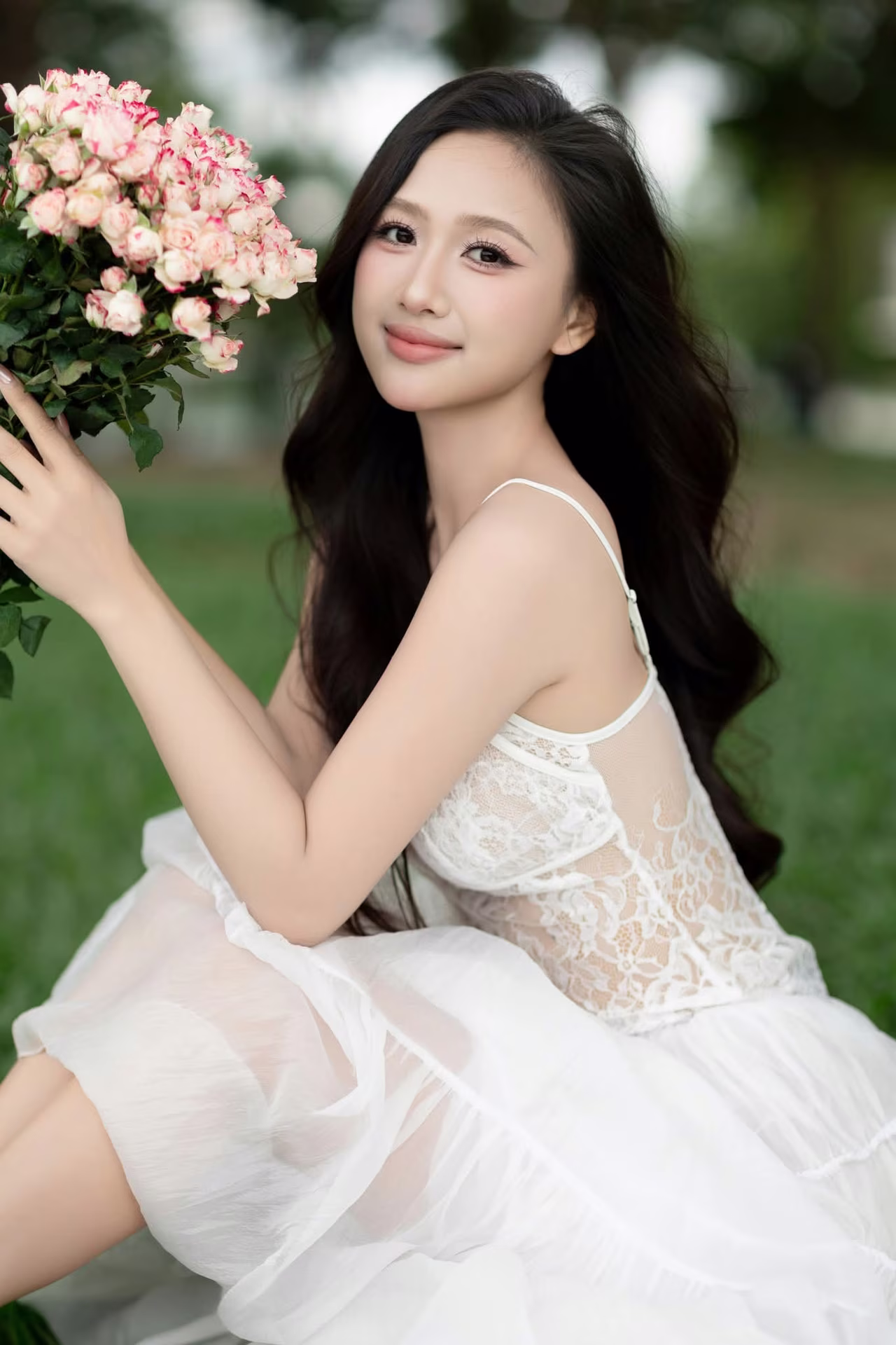 This photograph beautifully captures the pure and gentle charm of a Vietnamese young woman. She possesses long, smooth black hair flowing naturally, highlighting her elegant oval face and sweet smile. Dressed in a delicate white lace dress, she sits gracefully on a lush green lawn, creating a harmonious and poetic scene. Her eyes reflect an innocent, dreamy gaze, as if lost in the peaceful ambiance of nature. This portrait not only showcases her physical attractiveness but also radiates grace and elegance, offering viewers a sense of calm and allure. It is an image that embodies youthfulness, innocence, and the timeless beauty of Vietnamese women. #Vietnamese #pretty #charmĐông Hoàng