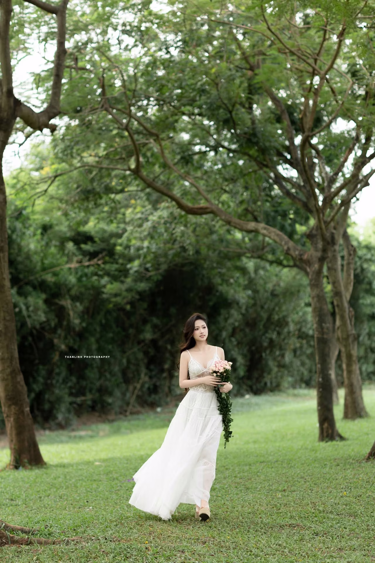 VGU No.98: Elegant Beauty in White Dress with Fresh Flowers – A Timeless Allure.
