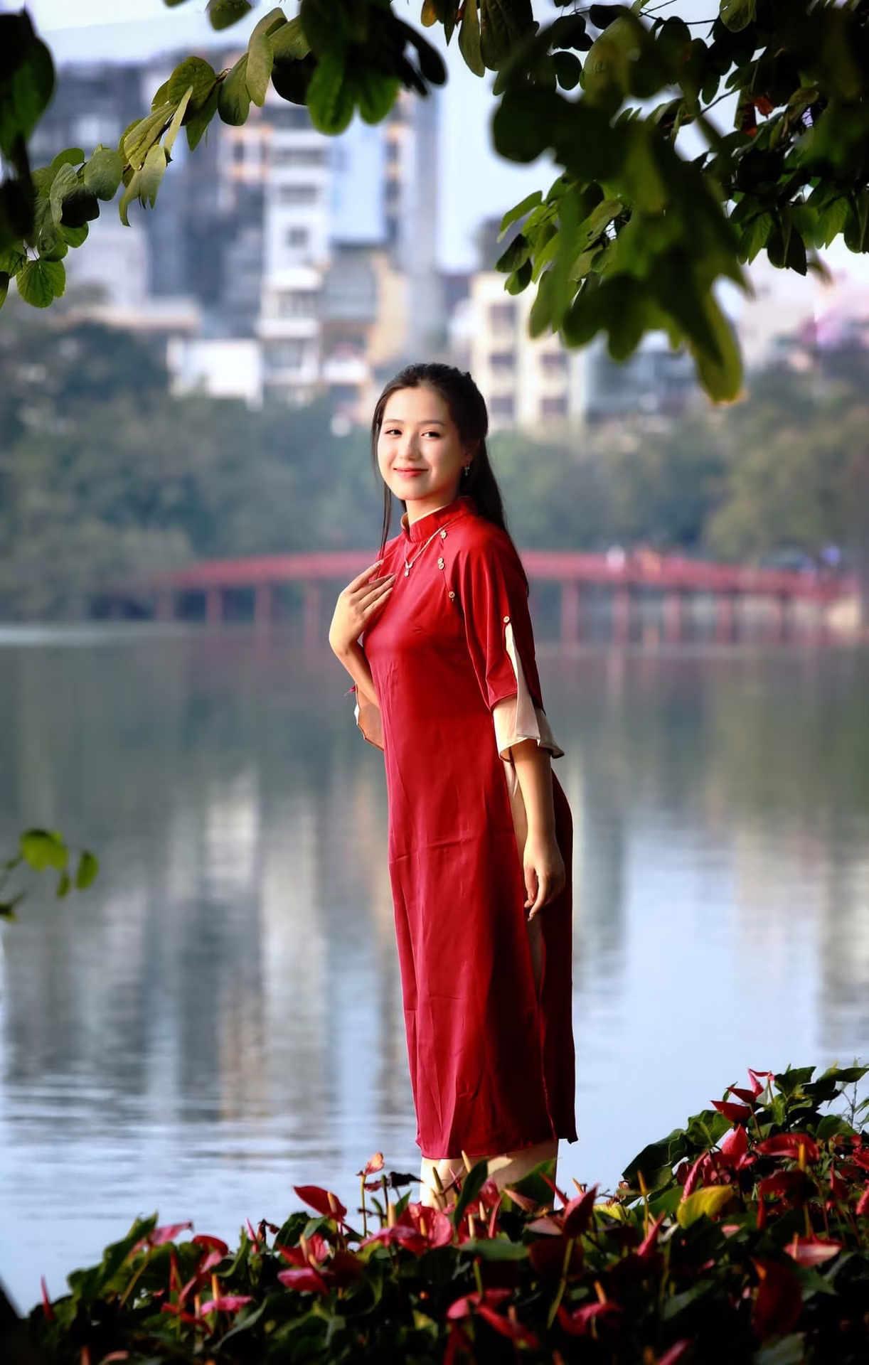 This VGU No.106 photograph captures the exquisite beauty of a graceful Vietnamese woman, radiating elegance and charm. She dons a vibrant red attire, subtly evoking traditional aesthetics with a modern flair. Her poised stance and captivating gaze perfectly complement the poetic scenery of Hoan Kiem Lake, the iconic heart of Hanoi. In the background, the serene lake reflects the gentle sunlight, alongside the characteristic red bridge and distant city skyline, creating a harmonious blend of heritage and urban development. This image not only celebrates the allure of Vietnamese women but also serves as an invitation to explore the rich culture and distinctive landscapes of Hanoi, offering an unforgettable experience for anyone who beholds it. #Vietnamese #pretty #charmĐông Hoàng