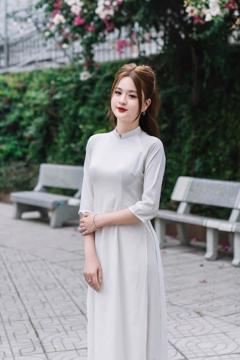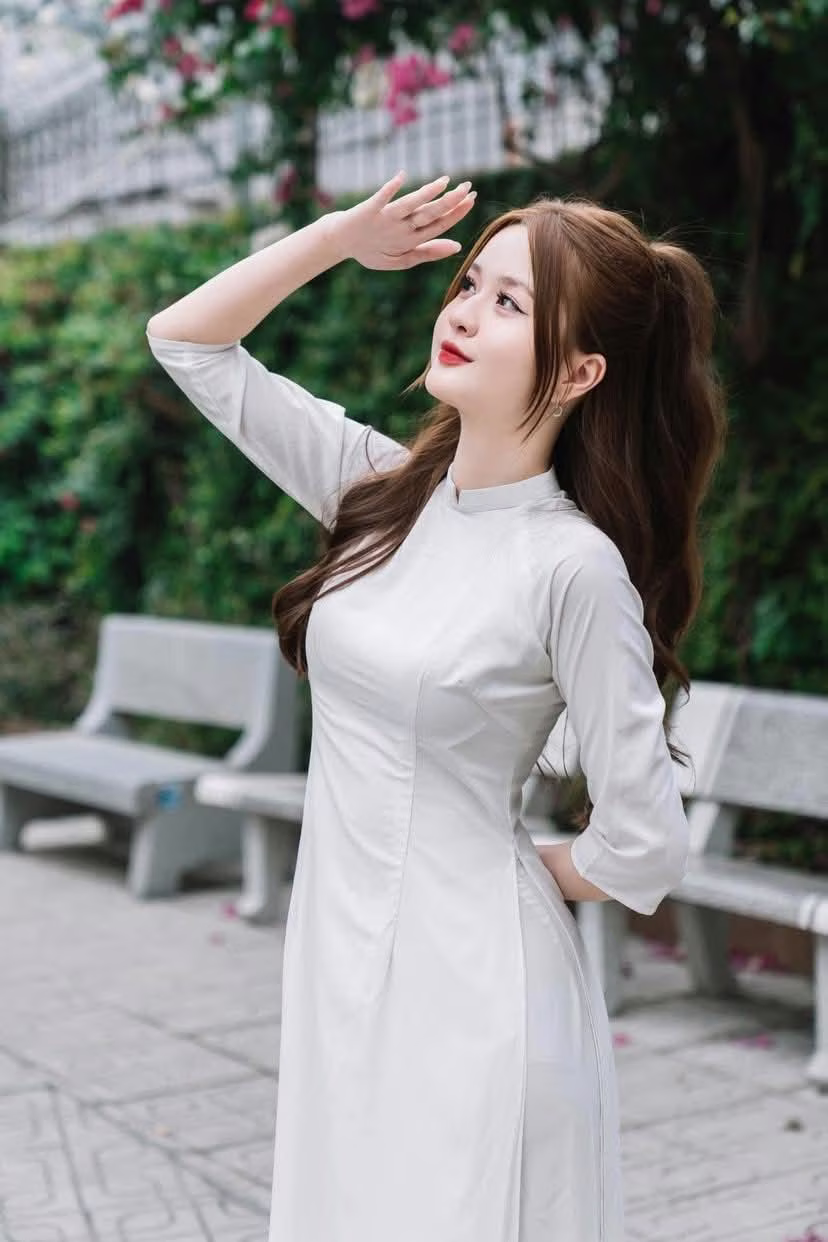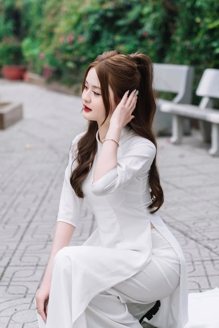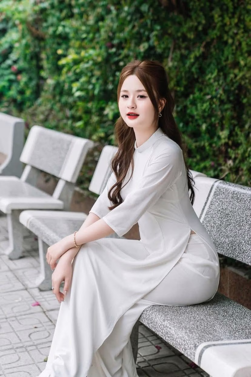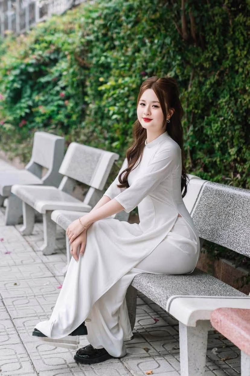 This photo captures a gentle moment of a Vietnamese girl in a pristine white ao dai. She sits gracefully on a stone bench, her long hair flowing down, and a charming smile, exuding elegant beauty and tranquility. The ao dai is not just an outfit but also a cultural symbol, honoring the grace and gentleness of Vietnamese women. The lush green background enhances the pure beauty and serene demeanor of the girl. This is an emotional image, evoking admiration for traditional beauty and radiant youth. This moment is like an invitation to admire the simple yet captivating charm of the ao dai in everyday life. #Vietnamese #pretty #charmĐông Hoàng