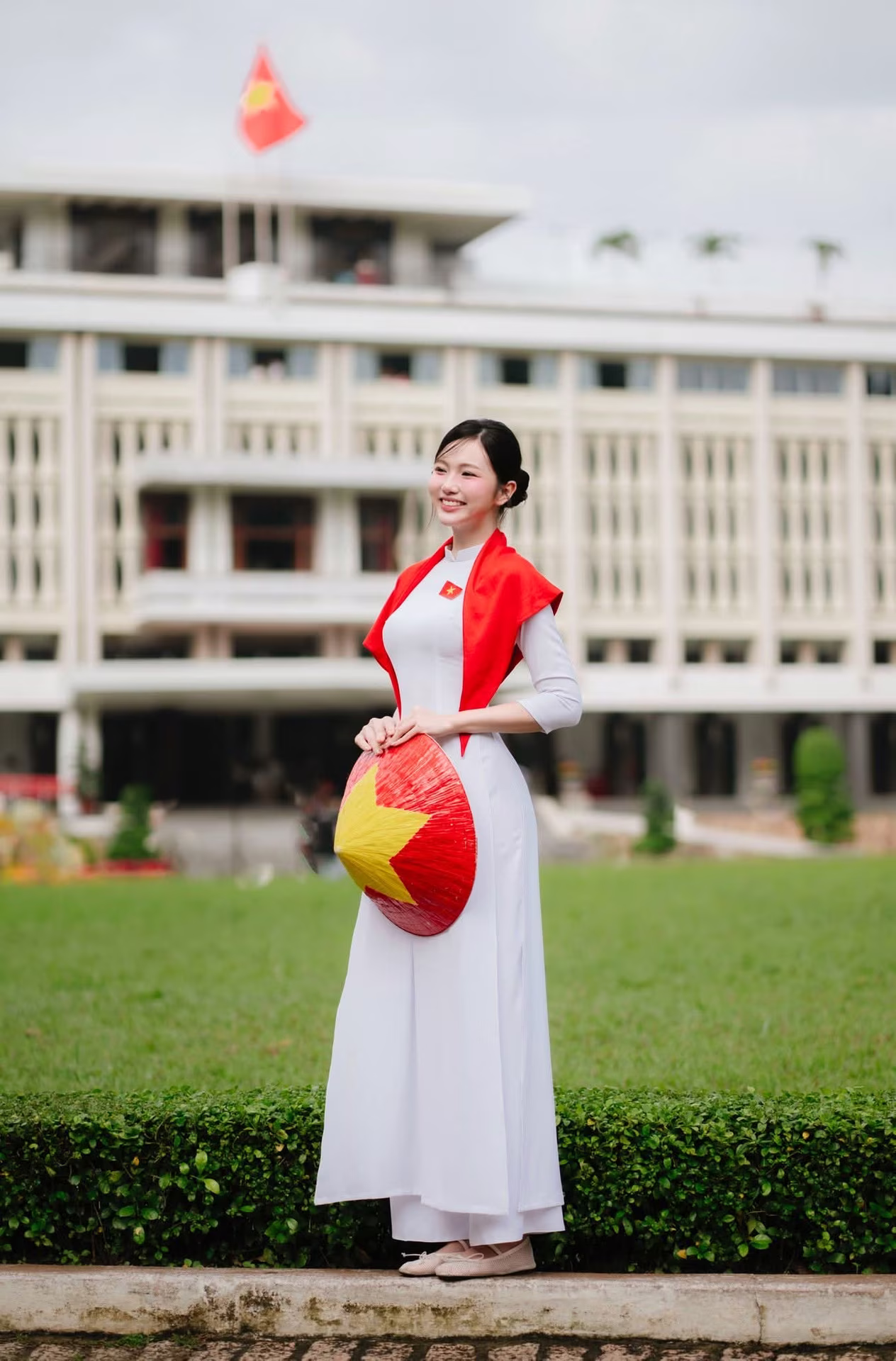 This stunning VGU No102 image captures a graceful Vietnamese girl in a pristine white Ao Dai exuding elegance and serenity She wears a vibrant red cape adorned with a yellow star symbolizing Vietnam's national flag and holds a small flag in her hand showcasing intense national pride Her radiant smile and forward gaze against the lush green lawn and ancient architecture evoke the spirit of a passionate and patriotic young generation This scene beautifully blends tradition with modernity inner beauty with love for the homeland a memorable moment honoring Vietnamese culture and its people #Vietnamese #pretty #charmĐông Hoàng