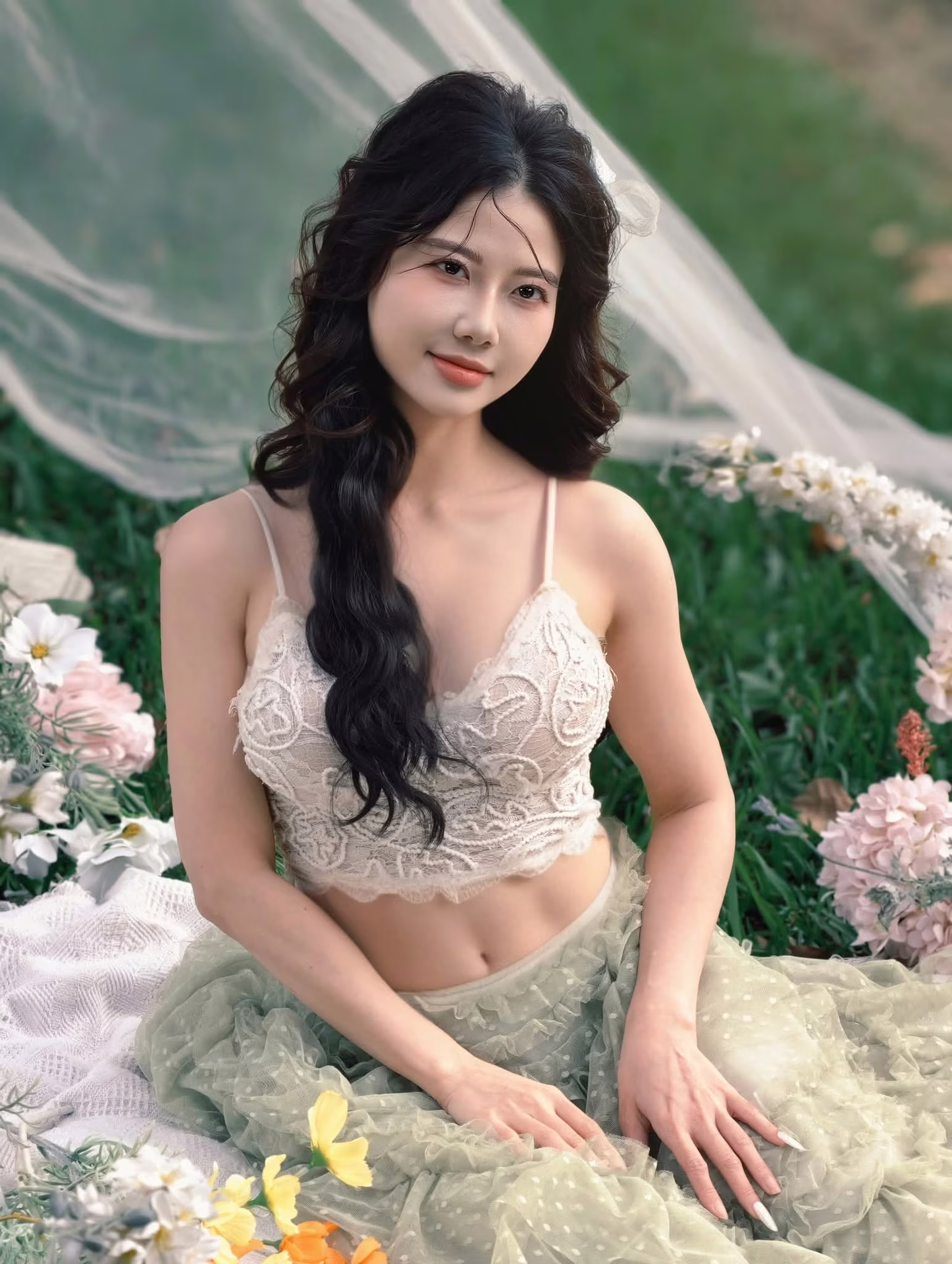This VGU No.74 image beautifully captures a woman embodying the serene charm often associated with Vietnamese beauty, set amidst a truly dreamy natural landscape. Her gentle expression, flowing dark hair, and captivating eyes exude a pure and elegant aura. Dressed in a delicate green gown, surrounded by soft pink flowers and lush greenery, she blends seamlessly into the picturesque setting. The scene evokes a sense of peace and enchantment, highlighting the graceful allure of the beautiful woman and the poetic beauty of her surroundings. It's a moment of pure visual delight. #Vietnamese #pretty #charmVGU No.73: Ethereal Butterfly Beauty A Dreamlike Vision Unveiled